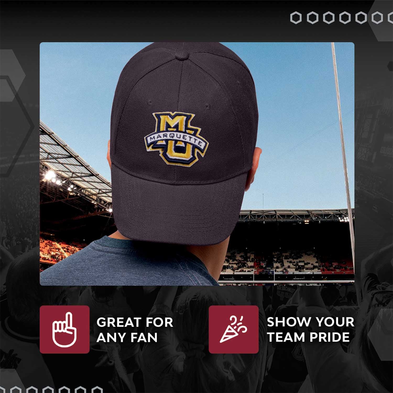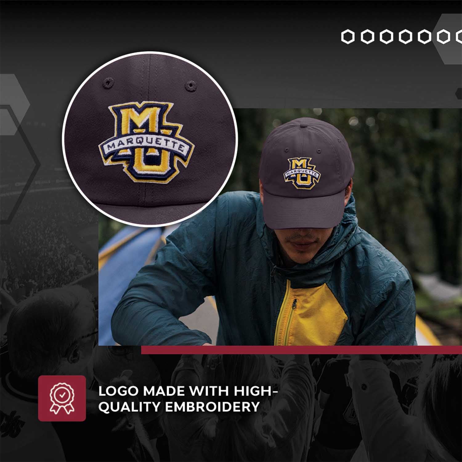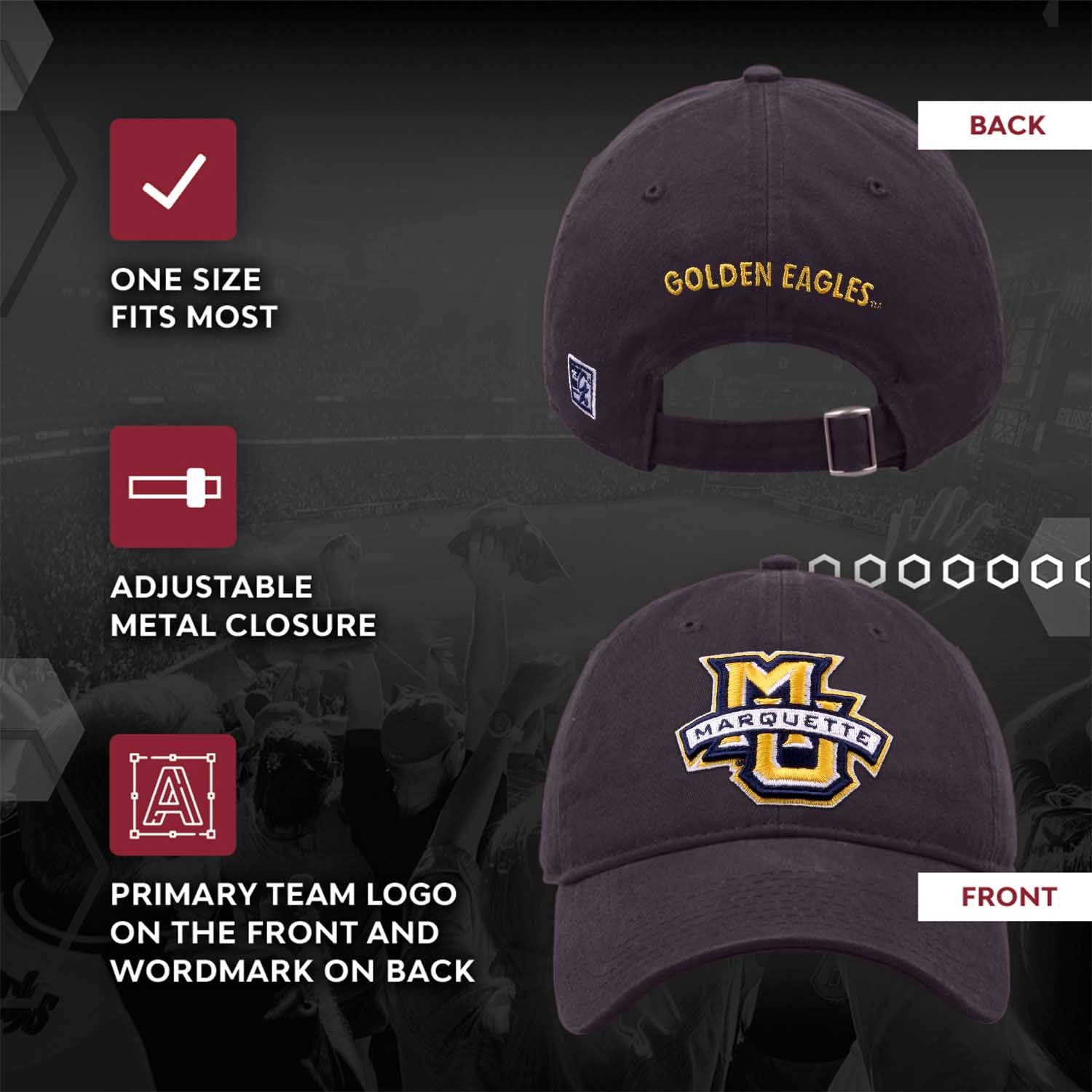 This Marquette hat is a must-have for any Golden Eagles fan! These college hats are made from 100% cotton and garment-washed twill, and are durable and comfortable to wear. The garment-washed fabric gives this vivid Marquette hat a cool, stylish, and fashionable look. The Marquette Golden Eagles logo is embroidered on the front, with the team wordmark on the back. The relaxed, unstructured hat design feels soft & easy to wear, making it a good dad baseball hat for everyday wear. The adjustable metal closure ensures a one size fits all. If you are looking for the perfect Marquette gift for Father's Day, look no further than the Marquette Golden Eagles dad hat! Wear it with the classic Marquette Golden Eagles apparel on game day with your Marquette Golden Eagles clothes and Marquette Golden Eagles merch, or wear it out running errands. This Marquette cap is a staple in every Golden Eagles fan's apparel. Show your support for Marquette this baseball hat. Show your love for soccer, baseball, basketball, and hockey all year long.