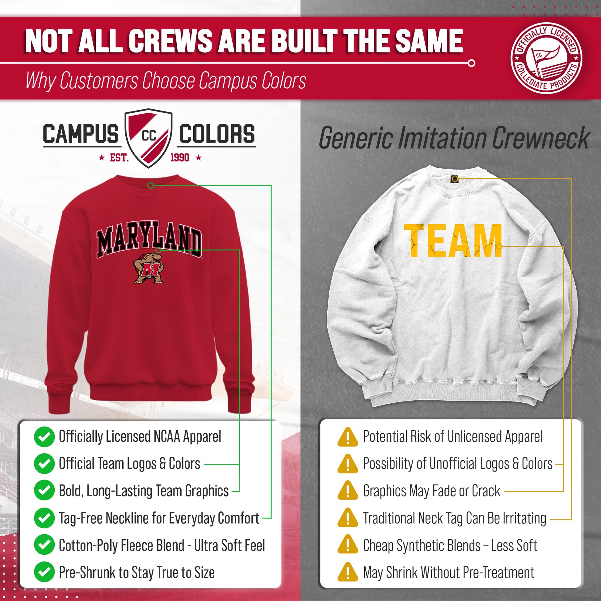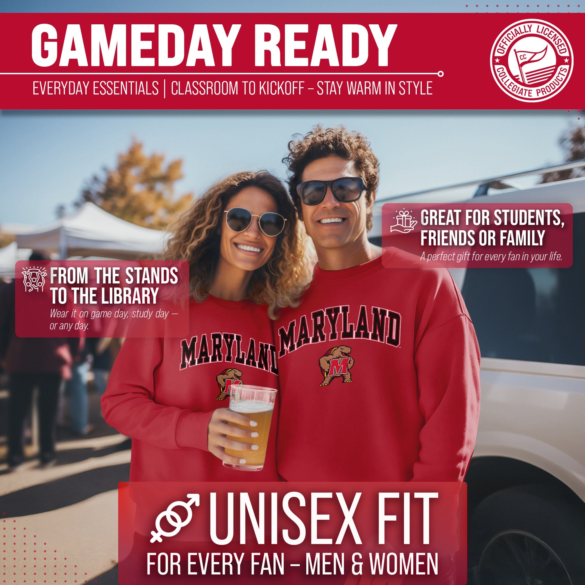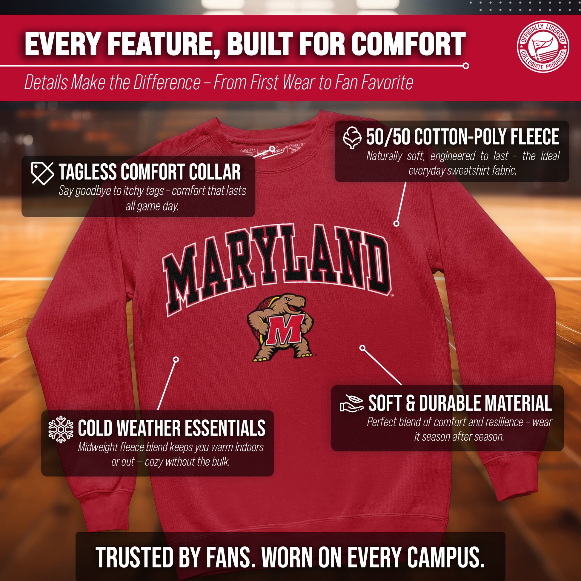 For the ultimate Maryland Terrapins fan, our Gameday crew sweatshirt is the must have apparel. Extremly comfortable and sure to keep you warm and cozy while still showing your school pride.