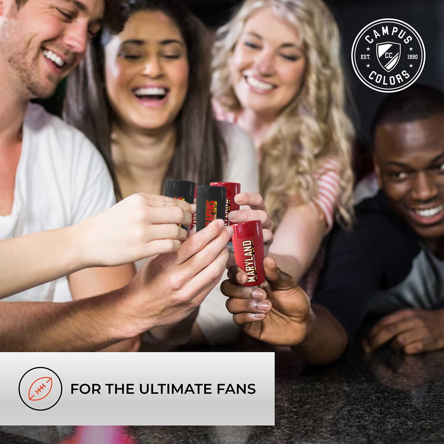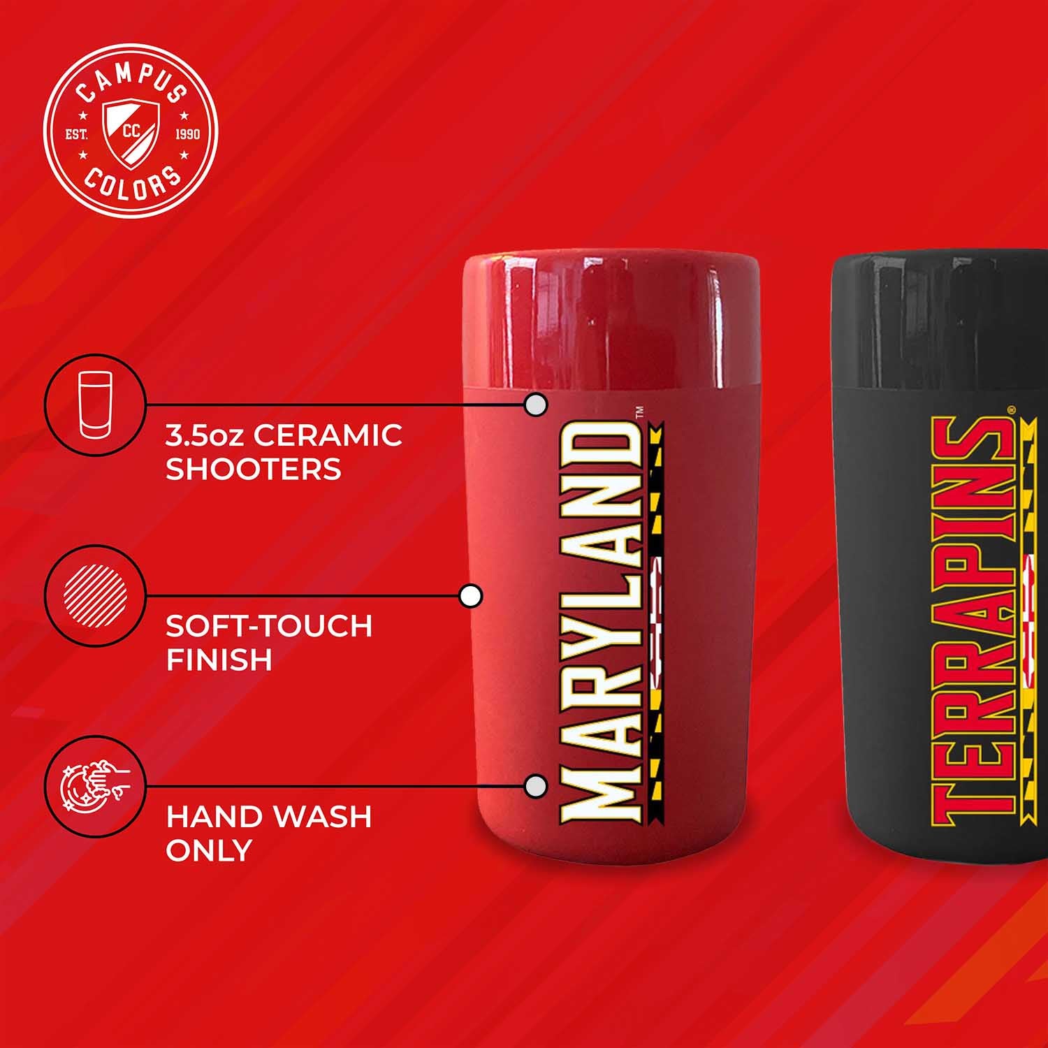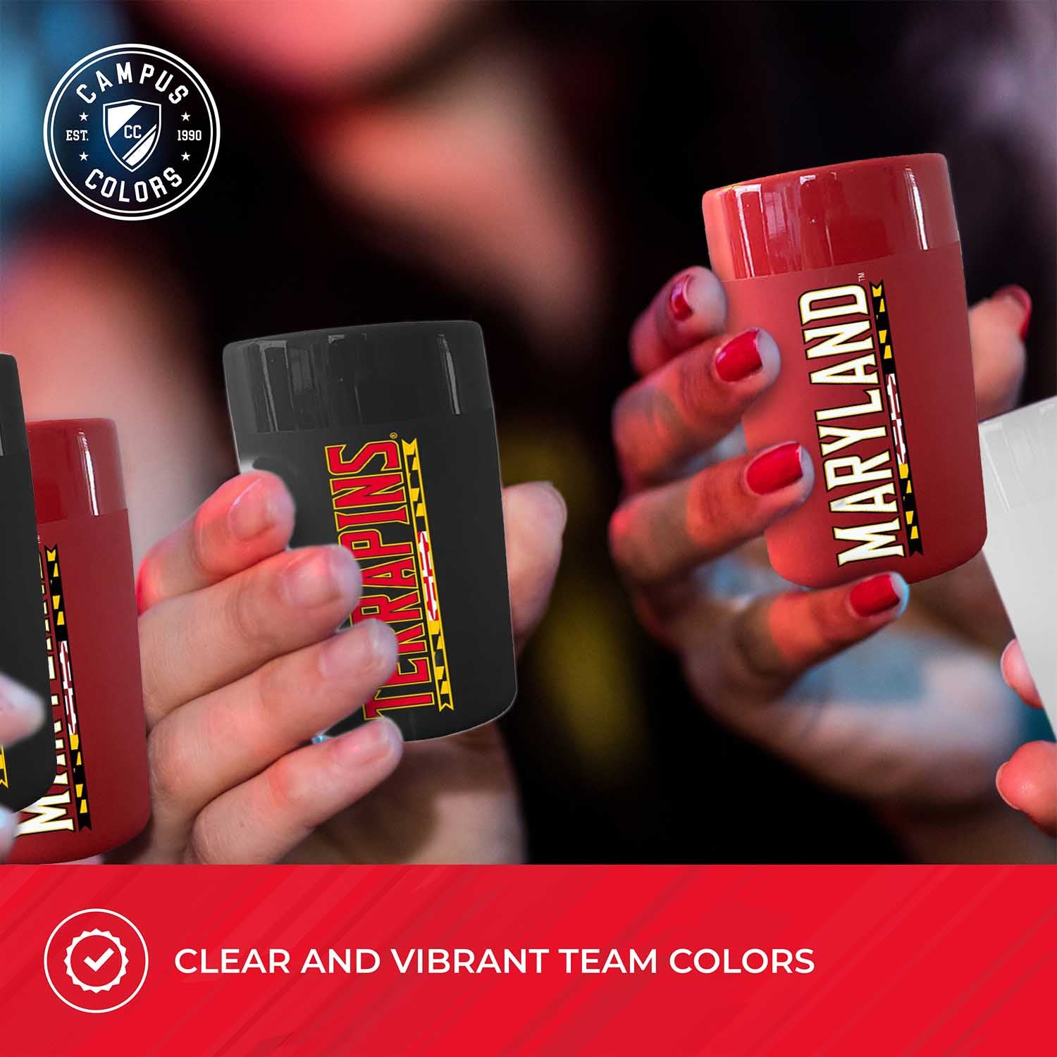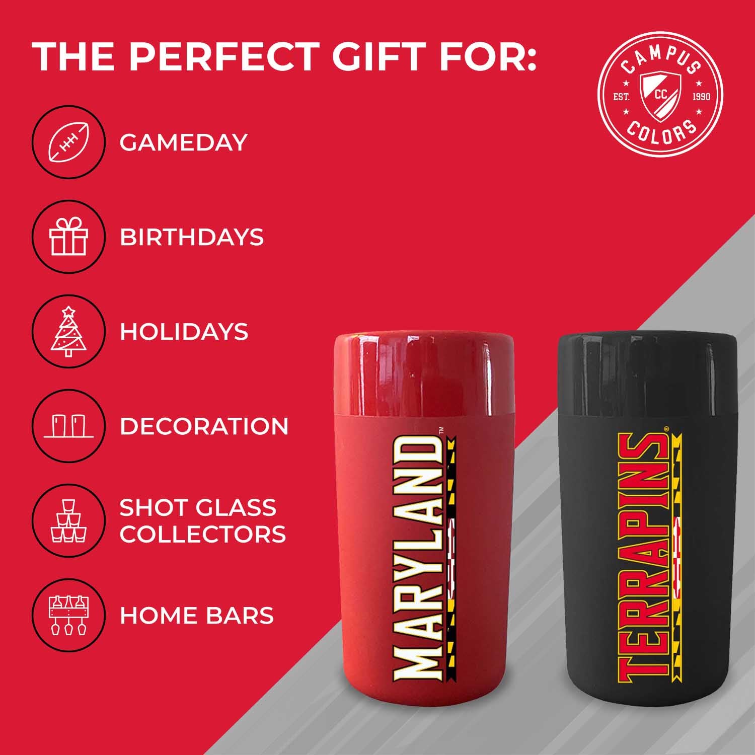 These college football team tailgating shooter pack includes two Maryland Terrapins shot glasses. This fun party pack includes exactly what you need for Maryland tailgating. Use these Terrapins shot glasses on game day or at a party. These shooters have a soft touch finish and are hand wash only. The Maryland Terrapins shot glasses feature the primary and secondary team colors with school wordmark on one sot glass and team wordmark on the second shot glass. This pair of Terrapins glasses is perfect for the fan who loves to bartend the game day parties. This Maryland gear takes your tailgate to the next level and shows loyal pride in your team's history, players, and of course, colors. The Maryland shooters are the handiest game day bartending tool guaranteed to make a splash at the big game. This shot glass set includes the ultimate Maryland Terrapins memorabilia for men and women. Our college football bundle makes the best Maryland gifts for men and women football fans. Officially licensed gifts for dad and mom are the perfect Fathers Day gifts or even Mothers Day gifts. Make it a Terrapins Christmas this year with this festive shot glass set!