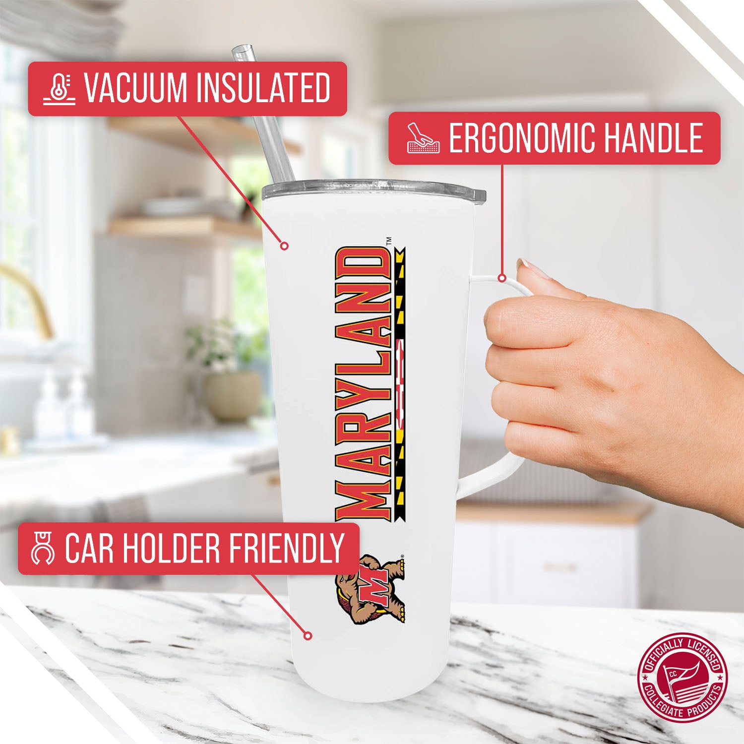 Introducing the ultimate accessory for Terrapins fans or busy individuals on the go, the NCAA Stainless Steal 20oz Roadie With Handle & Dual Option Lid With Straw! This tumbler is designed to keep you hydrated and stylish throughout your day, whether you're heading to class, cheering on your favorite team, or running errands. Crafted from durable stainless steel, this soft-touch tumbler is perfect for holding your favorite hot or cold beverages. The handle provides a comfortable grip, while the dual-option lid allows you to sip from the straw or drink directly from the tumbler. Designed for convenience, this travel tumbler is hand wash recommended and cup holder friendly! The included straw allows you to enjoy your drinks on the go without worrying about spills. What sets this tumbler apart is its officially licensed design! This Maryland Terrapins tumbler is the perfect accessory for tailgates or everyday use. Stay hydrated, show your team pride, & enjoy your drinks in style!