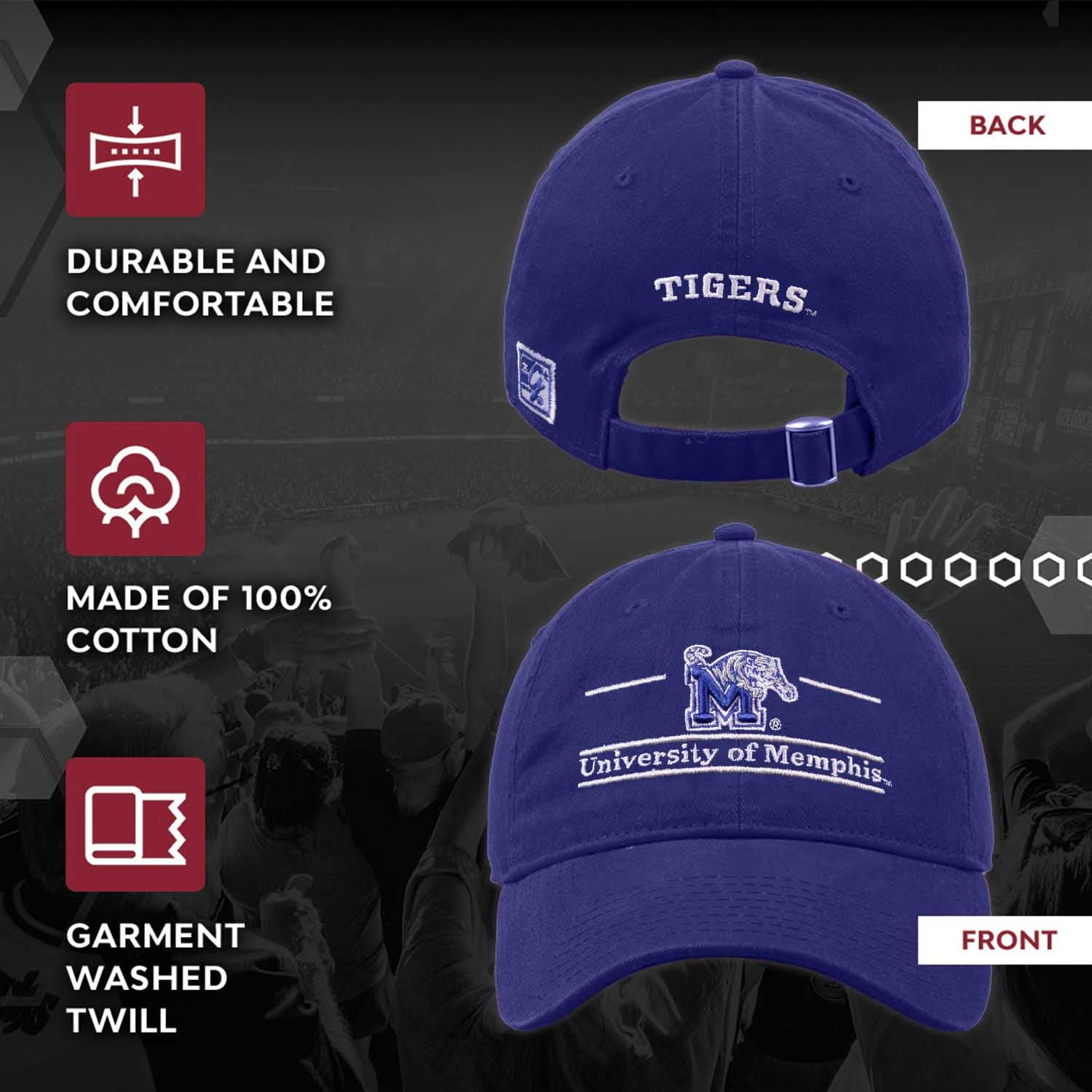 Looking for a way to support your team? Try this Memphis Tigers game bar hat! These Memphis Tigers caps are made from 100% garment-washed cotton twill. This Memphis hat also features a relaxed and unstructured design, making it a perfect Memphis Tigers fitted Tigers hat. It boldly displays the Memphis Tigers embroidered logo so you can represent the Memphis. In addition, the Memphis Tigers logo with the school wordmark is on the front of the hat in a bar design. The team wordmark is on the back of the Tigers baseball cap. This gameday hat has a metal closure to ensure an adjustable size. Wear these caps for women and men along with your favorite Memphis clothes, clothing & apparel. These ball caps for men and women are the perfect Memphis Tigers gifts for men. Buy one for yourself, your dad, or any fan. Whether tailgating at Memphis football games or cheering from home, show your team pride by wearing your Memphis gear with your Memphis cap.