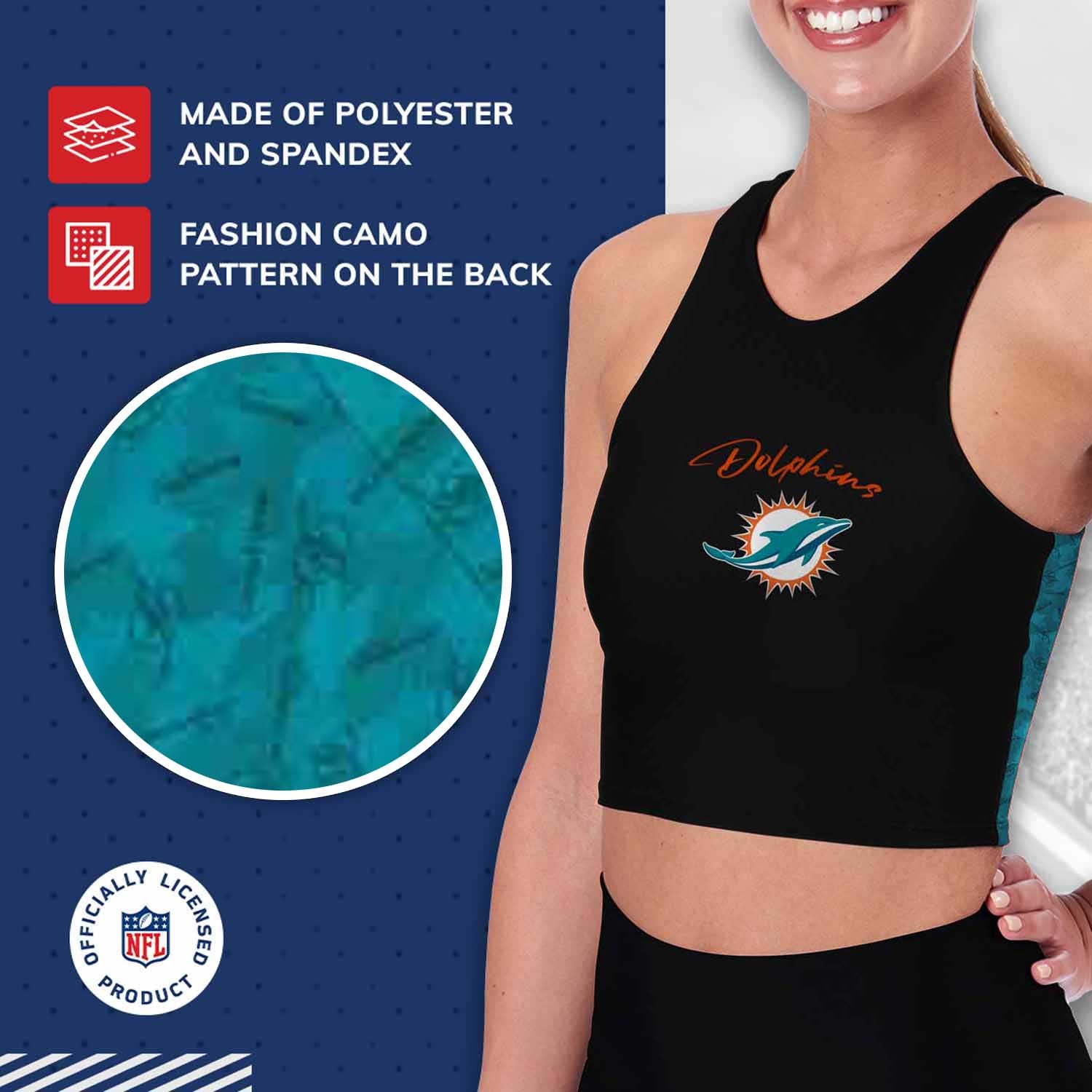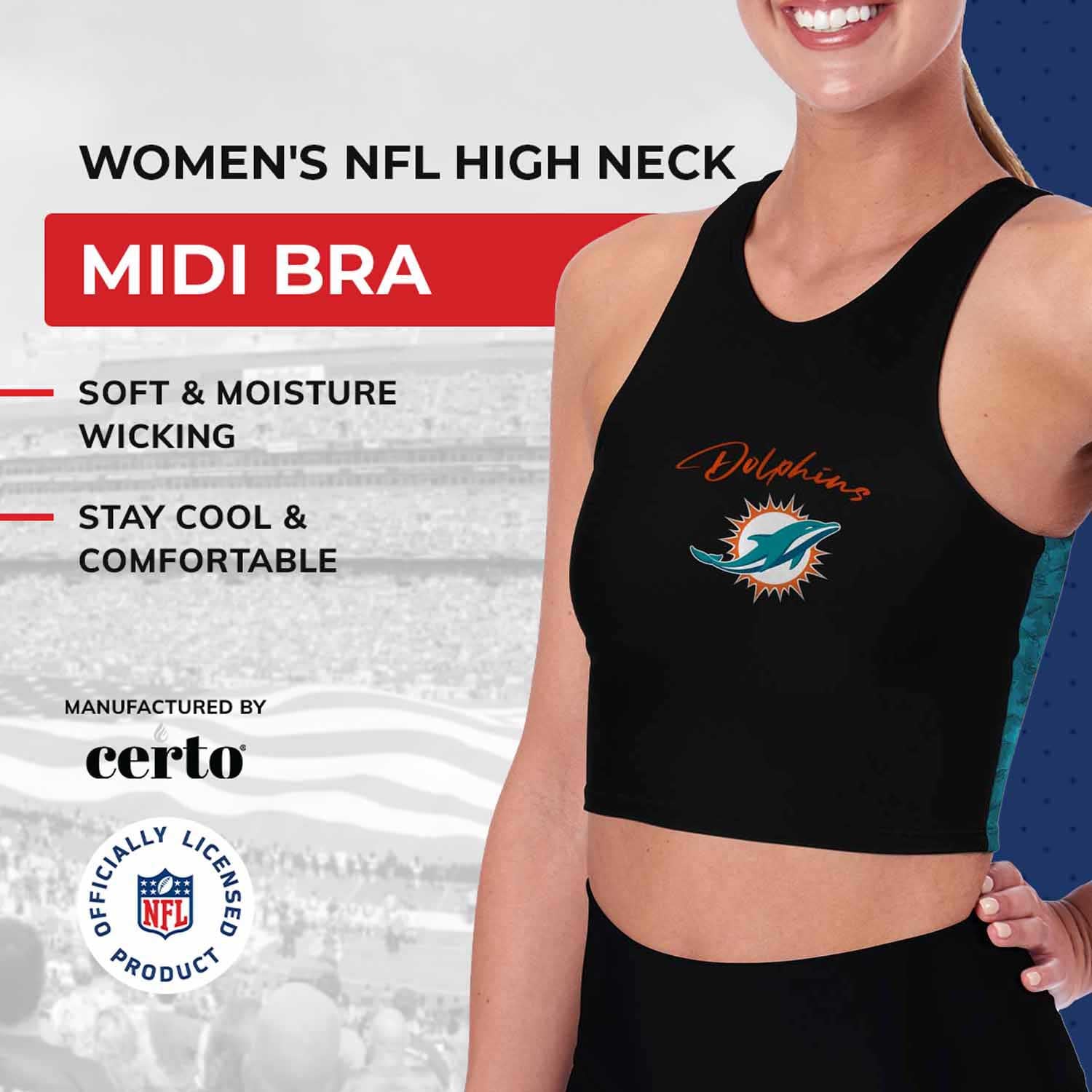 Are you looking for versatile sports fashion to support your favorite team? Look no further than this officially licensed, Dolphins, high-neck midi bra for women. This bra top can be worn as a sports bra or tank top, and the midi length lands perfectly to pair with high-waisted bottoms. You can wear it as a running bra with your favorite gym clothes or high-waisted pants for a stylish, everyday look. Made of quick-dry, CERTO truNaked®️ soft fabric with moisture-wicking properties, this sports top will keep you cool and comfortable while you support the Dolphins. The material is comfortable and stretchy, ensuring this yoga bra fits most women's body types. You can refer to our size chart to find your perfect fit. The back of this cropped bra top features the Miami Dolphins logo in full colors, and the back of the bra shows a fashion camo pattern. Try this sports bra shirt if you are looking for tank top sports bras for women, or womens athletic tank tops. You won't regret it!