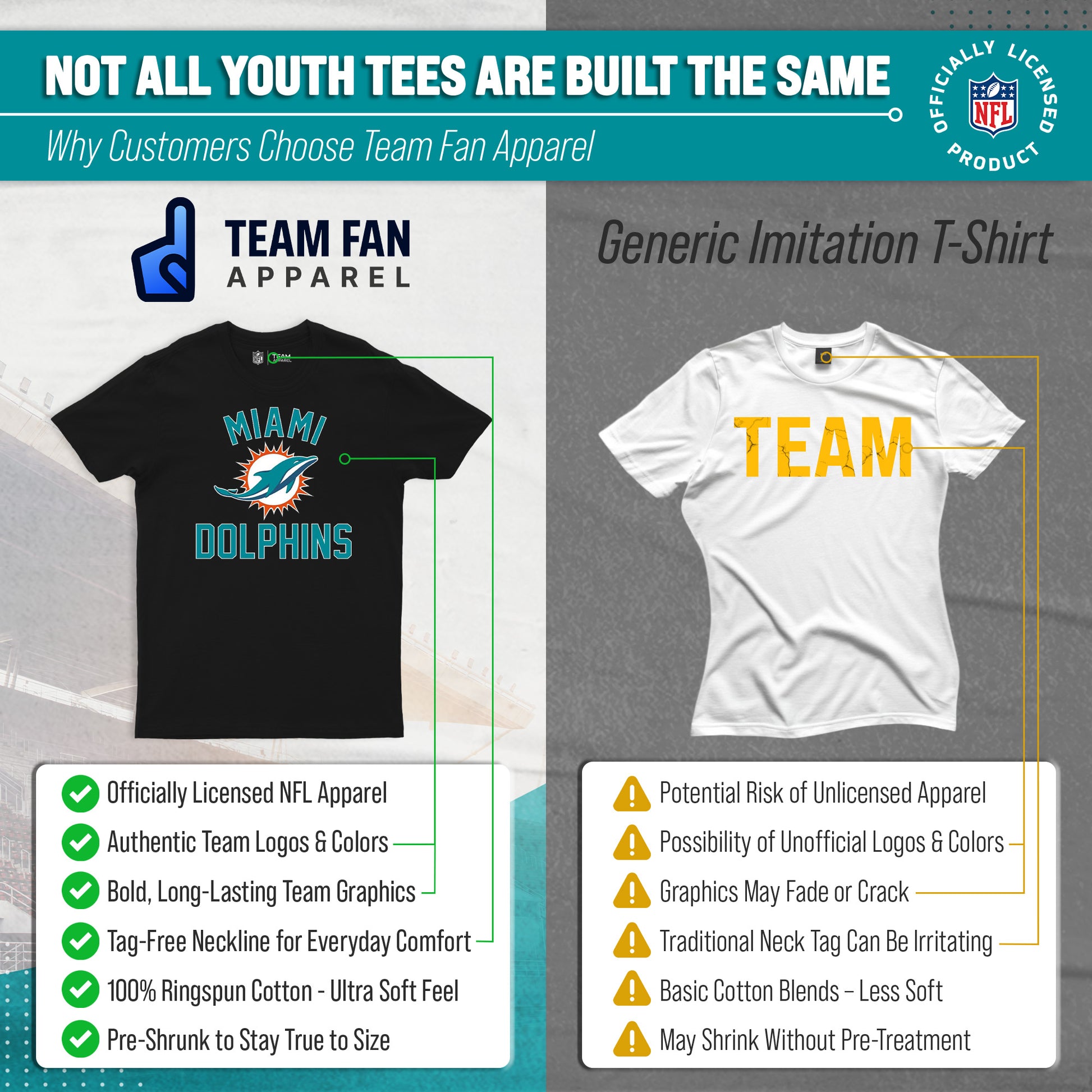 There's nothing more exciting than a much-anticipated gameday. Our Youth Gameday Miami Dolphins football tshirt is the ideal shirt to wear on gameday whether you're at the game, or watching from the comfort of your own home. This Miami tshirt is super comfortable, runs true to size, and is great for showing team pride all year long! The semi-fitted style makes this the perfect Dolphins youth shirt for both boys and girls. Our shirts really are the perfect fan apparel for school and sports games. The youth gameday shirt is lightweight and ideal for warmer weather or as an extra layer during colder months. Our Dolphins shirts for boys and girls are essential apparel for young football fans. Our tagless Miami Dolphins youth shirt ensures the most comfortable fit. This semi-fitted tshirt is made from a 50/50 cotton/polyester blend; contrast shoulder to shoulder neck tape and 1x1 rib knit neck makes for comfortable fit around the neck and shoulders. This high quality shirt for kids features a double-needle sleeve and bottom hems. These are high quality Dolphins graphic shirts for girls and boys. The vivid graphics will stay crisp wear after wear, and year after year. The thermal printed graphics are high definition, official true team colors, and also resist fading. This Miami tshirt is made with high stitch density for smoother printing surface. Our official shirts for boys and girls make the best gifts. This piece of Miami Dolphins apparel is the perfect birthday or Christmas gift for any young football fan. This tee is absolutely perfect for school, stadium fun, or watching the game at home.