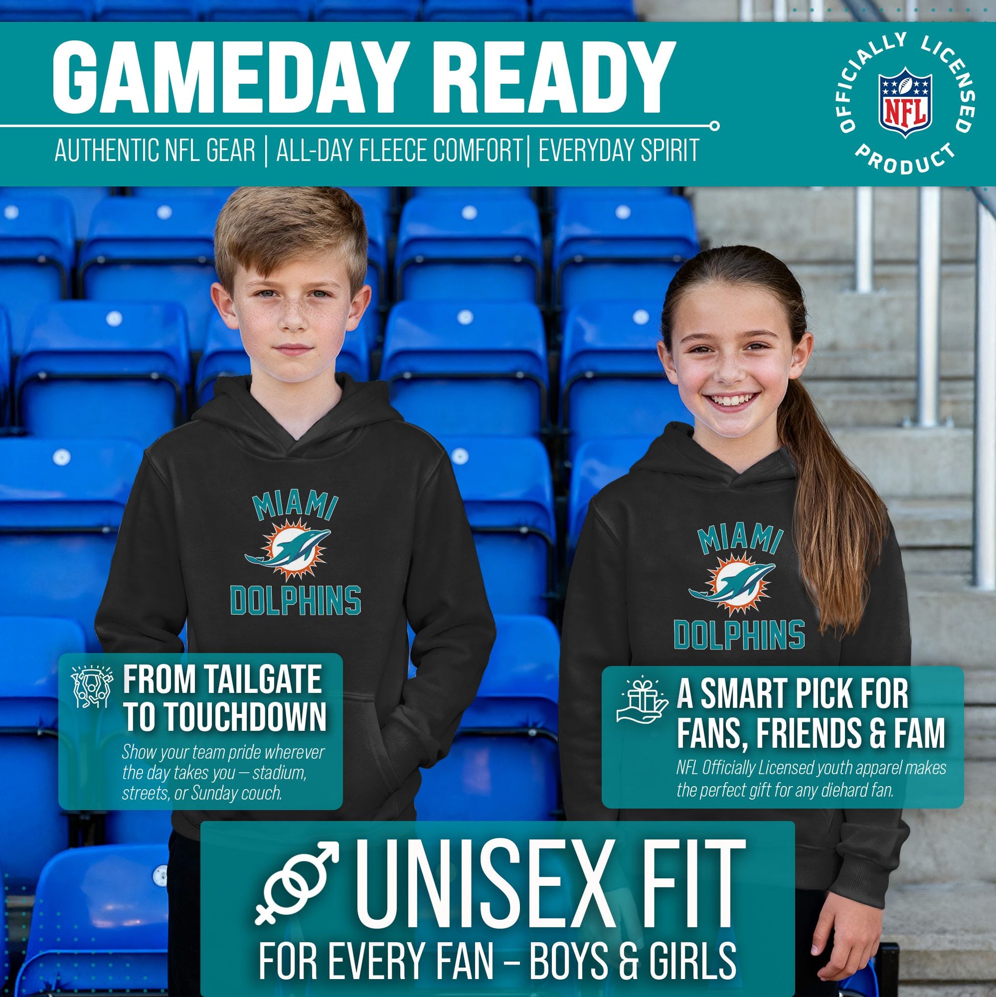 Our youth gameday Miami Dolphins football pullover hoodie with a front pouch pocket is the ideal sweatshirt to wear on gameday. This Dolphins hoodie for kids is comfortable and great for showing team pride all year long. This is an essential piece of girls and boys football apparel for pro football fans. Our team-colored hoodie sweatshirts are the perfect fan apparel for school and sports games. This hooded pullover with a pocket is ideal for warm or cold weather games. Dolphins football pullover hoodie is made from a cotton poly blend material with raglan sleeves. These youth pro football sweatshirts have high quality features. Our youth gameday pullover hoodies feature 1x1 ribbing at cuffs and waistband. This Miami hoodie youth sweatshirt has a twill neck tape. The raglan sleeves add a sophisticated look to these pro football team hoodies for boys and girls. This tagless sweatshirt ensures the most comfortable fit for boys and girls. The standard fit makes our football team hoodies for boys and girls the perfect kids sweatshirt for young fans. The thermal printed graphics are high definition, true to authentic team color, and resist fading. Our hoodies also make the best Dolphins gifts for boys and girls. Youth football apparel is the perfect birthday gift for any professional sports fan. Our youth football team hoodies for boys and girls are great for wearing to school, the stadium, or while you're watching the game at home.