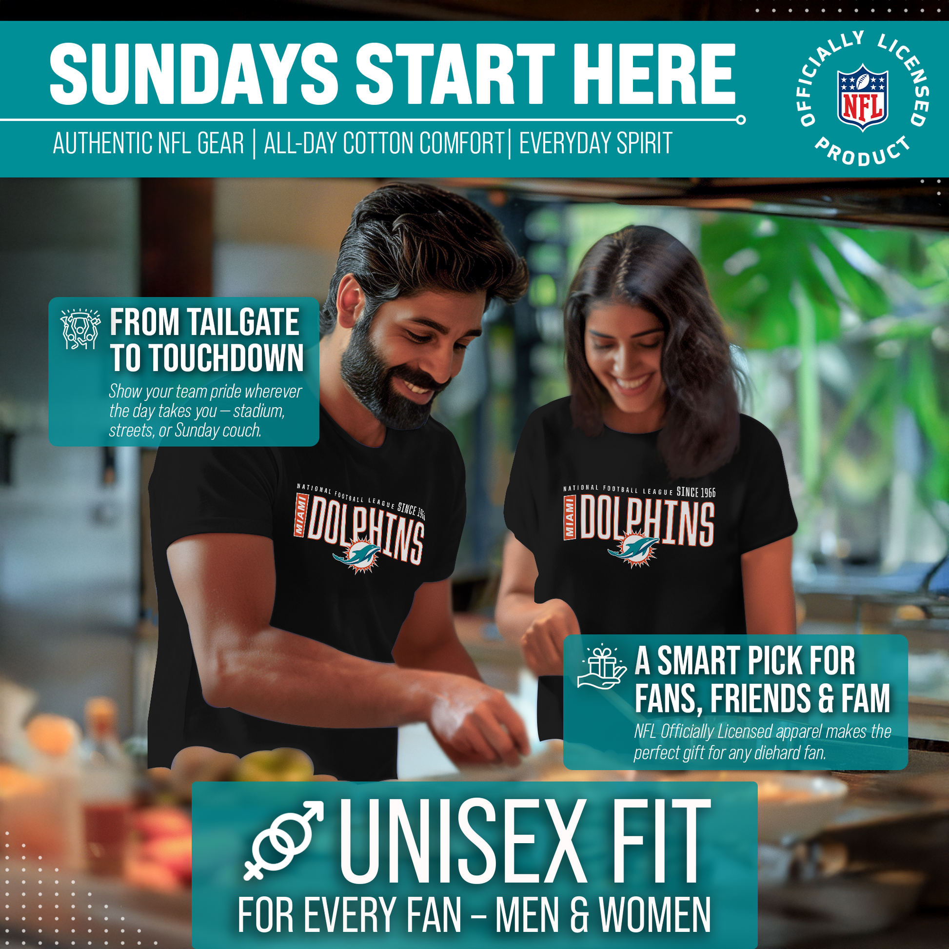 Show off your team pride in style with the officially licensed Team Fan Apparel Miami Dolphins NFL Modern Endzone Tag-Less T-Shirt! Designed for both men and women, this versatile unisex tee is the ultimate staple for every football fan’s wardrobe. Whether you’re heading to the stadium, joining friends at a tailgate, or relaxing at home on game day, this Dolphins shirt is built for all-day comfort and effortless style. Crafted from soft, breathable cotton, this shirt ensures a lightweight and comfortable fit that you’ll want to wear again and again. The tag-less neckline eliminates irritation, so you can cheer on the Miami Dolphins distraction-free. With its modern endzone graphic design, bold team logo, and the year the Dolphins were founded, this shirt highlights your loyalty and sets you apart as a true die-hard fan. Available in a wide range of sizes, this Miami Dolphins NFL T-shirt is designed to deliver a flattering and comfortable fit for every fan. Pair it with jeans for a casual everyday look, or layer it with your favorite hoodie or jacket when temperatures drop. It’s the perfect way to represent the Dolphins season after season, no matter where you’re watching the action unfold. Looking for the ultimate gift for a fellow football fan? This Modern Endzone T-shirt is a must-have piece of officially licensed Miami Dolphins apparel. From birthdays to holidays—or just because—it’s an easy win for any Dolphins supporter who wants to show their pride in comfort and style. Celebrate your passion for the game and your team history with the Miami Dolphins NFL Modern Endzone Tag-Less T-Shirt. Comfortable, stylish, and packed with team spirit, this tee makes it clear who you’re cheering for every time you wear it. Don’t miss out—grab yours today and rep the Dolphins with pride all season long!