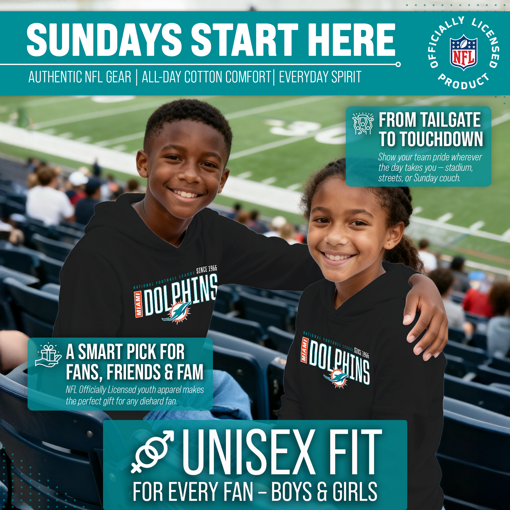 Hey there, young sports fans! Get ready to show off your team spirit with the Team Fan Apparel Miami Dolphins Youth Modern Endzone Football Fleece Hooded Sweatshirt! Made from a soft and cozy cotton polyester fleece, this sweatshirt is perfect for staying warm on game day or any day. The unisex design makes it suitable for both boys and girls, and its tag-less feature ensures ultimate comfort all day long. Featuring an original modern endzone design that proudly displays your team's colors and logos, this youth hoodie will be turning heads everywhere it's worn. The front pouch pocket and fleece hood will keep you warm on those cold game days as you cheer on your Dolphins! Just pull it on and go! So whether you're at the stadium or hanging out with friends, make sure you're representing your team in style with our NFL youth apparel. Printed and designed in the USA, have confidence your sweatshirt will last! Order now and get your future pro geared up to be the next super fan!