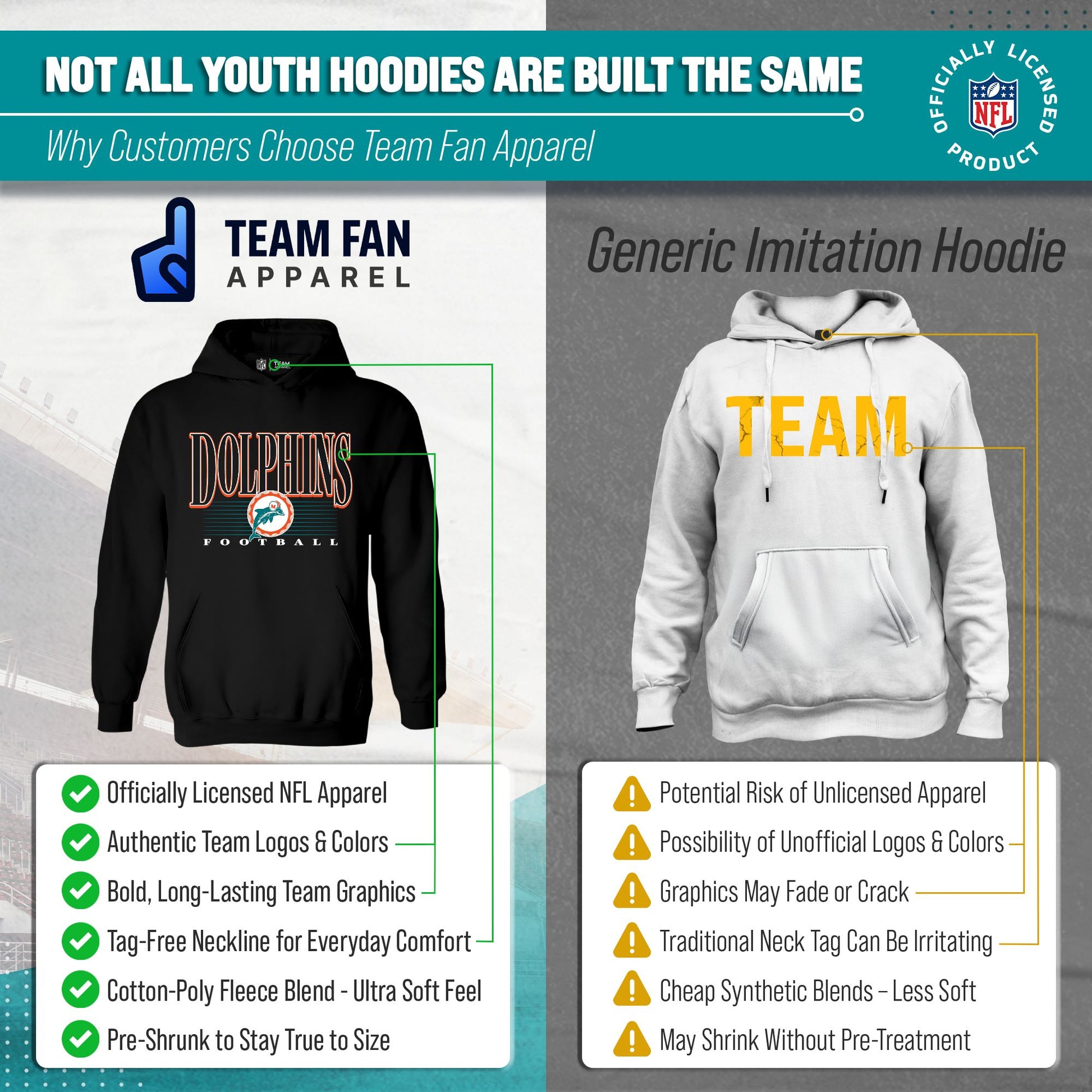Hey there, young sports fans! Get ready to show off your team spirit with the Team Fan Apparel Miami Dolphins Youth Overtime Blueprint Football Fleece Hooded Sweatshirt! This sweatshirt is made from a soft and cozy cotton polyester fleece and is perfect for staying warm on game day or any day. The unisex design makes it suitable for both boys and girls, and its tag-less feature ensures ultimate comfort all day long. Featuring an original outlined design with their vintage logo that proudly displays the team's colors, this youth hoodie will be turning heads everywhere it's worn. The front pouch pocket will keep you warm on those cold game days as you cheer on your Dolphins! Just pull it on and go! So whether you're at the stadium or hanging out with friends, make sure you're representing your team in style with our NFL youth apparel. Printed and designed in the USA, have confidence your sweatshirt will last! Order now and get your future pro geared up to be the next super fan!