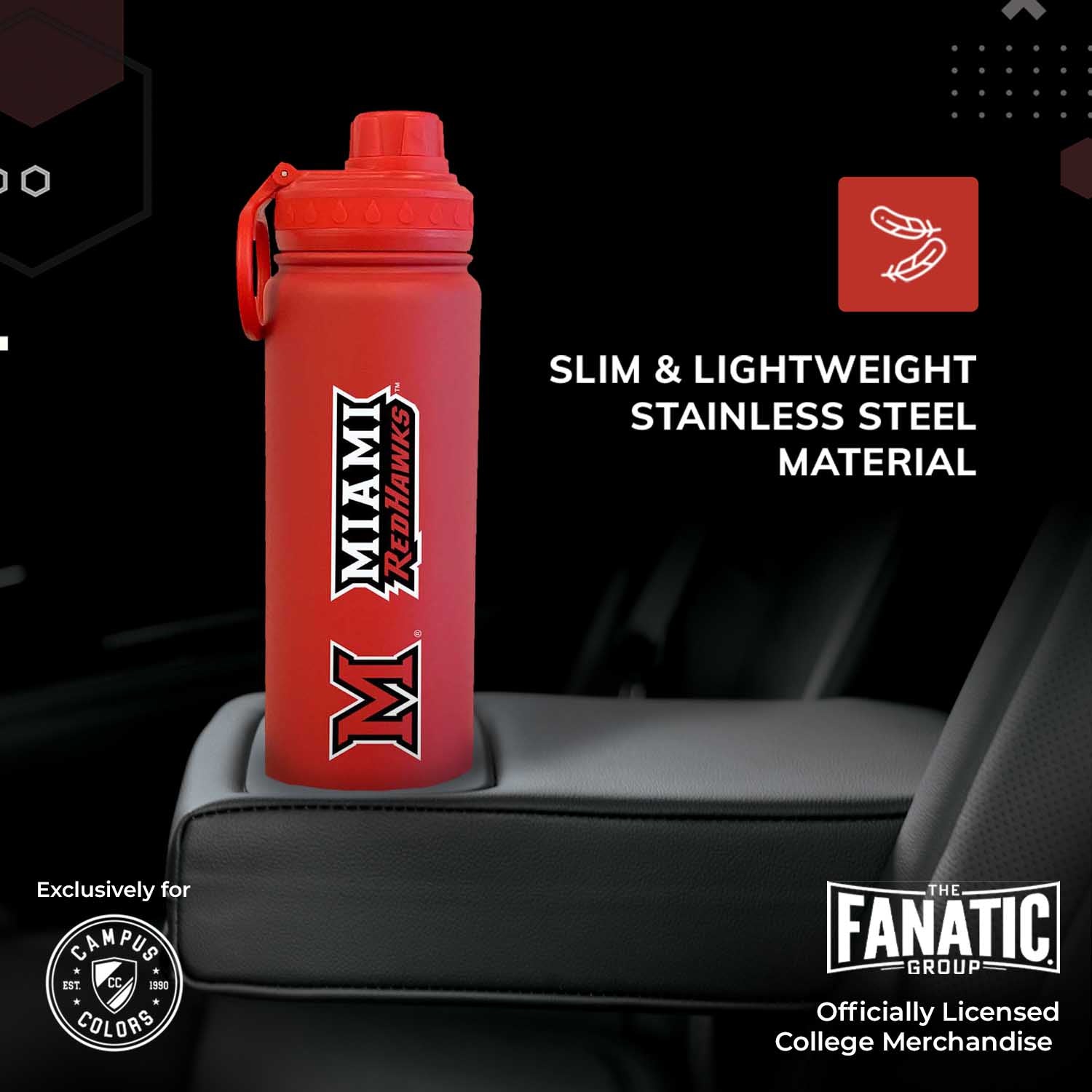 This officially licensed 24oz Miami of Ohio water bottle is the best accessory for any Miami Redhawks fan. You can use this water bottle 24 oz for water, sports drink, or even to keep your coffee hot. Our vacuum sealed sport bottle ensures that your drinks stay hot or cold for hours. You can bring this bottle along to sport games, hikes, or tailgates on game day. This sport water bottle 24 oz is a slim bottle that fits in most car cup holders for convenience. This stainless sports water bottle features an easy flow spout for the best drinking experience. The twist on cap features an easy drinking spout to make sipping a breeze. The bottle's lid twists on and off to reveal an easy drinking mouthpiece. The convenience of our double walled water bottles make them perfect for sports and everyday life! Show off your school spirit with this Miami Redhawks water bottle. This durable stainless sports water bottle make the perfect Miami Redhawks accessories for any activity. Our water bottle with clip for backpack is perfect for student campus life and busy alumni activities. Our vacuum sealed water bottles feature a built in handle. The easy grab bottle allows you to sip your water without spilling it on yourself while playing sports or walking to class. The college water bottle is coated in silicone for added grip and softer finish, and the exterior is sweat free so the Miami of Ohio water bottle won't drip on you. This insulated water bottle is the perfect birthday or Christmas gift for fans who love to collect Miami of Ohio stuff. Pair with other Miami of Ohio novelties or apparel for the ultimate Redhawks gift for women and men. Miami of Ohio gear is great as birthday gifts for college students, alumni, and sport fans. With our Miami Redhawks water bottle, fans can show team pride and stay hydrated all day and every day!