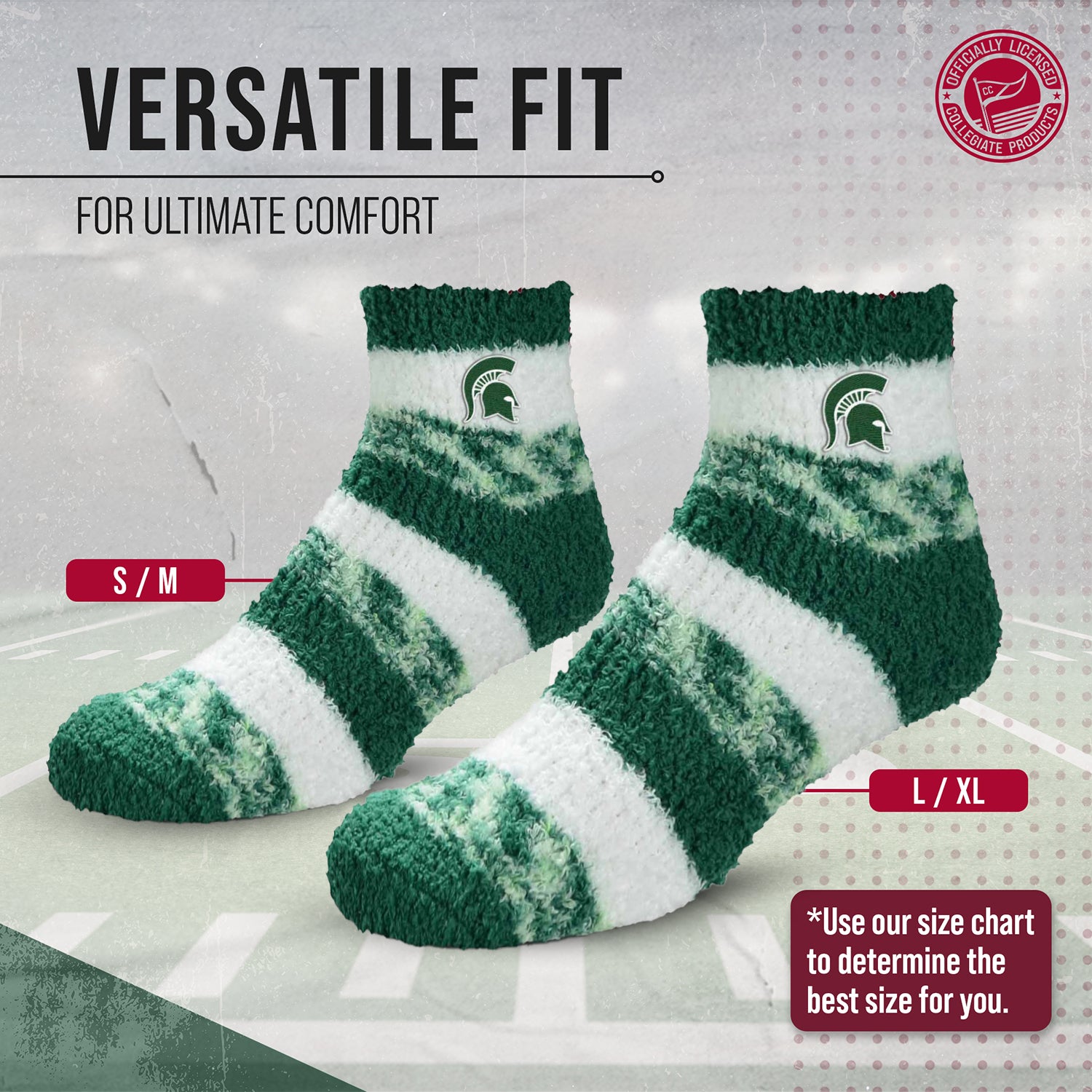 Keep Your Feet Cozy and Show Off Your Team Spirit with our College and University Sleep Socks! These ankle-length lounge socks are perfect for both men and women who want to stay warm and comfortable while proudly supporting their favorite school. Made from a soft, luxurious plush material, these socks feel super cozy against your skin and provide the ultimate level of comfort. With an ankle-length design, these Spartans socks keep your feet fully covered and insulated, making them perfect for wearing around the house as slippers. They also make great gifts for any Michigan State Spartans fan in your life. Not only do they keep your feet warm, but these sleep socks also feature vibrant team-themed designs that are officially licensed and authentic. So whether you're lounging at home or heading to class, these cozy sleep socks are the perfect Michigan State Spartans accessory to show off your team pride. Get yours today and experience warmth, comfort, and style all in one!