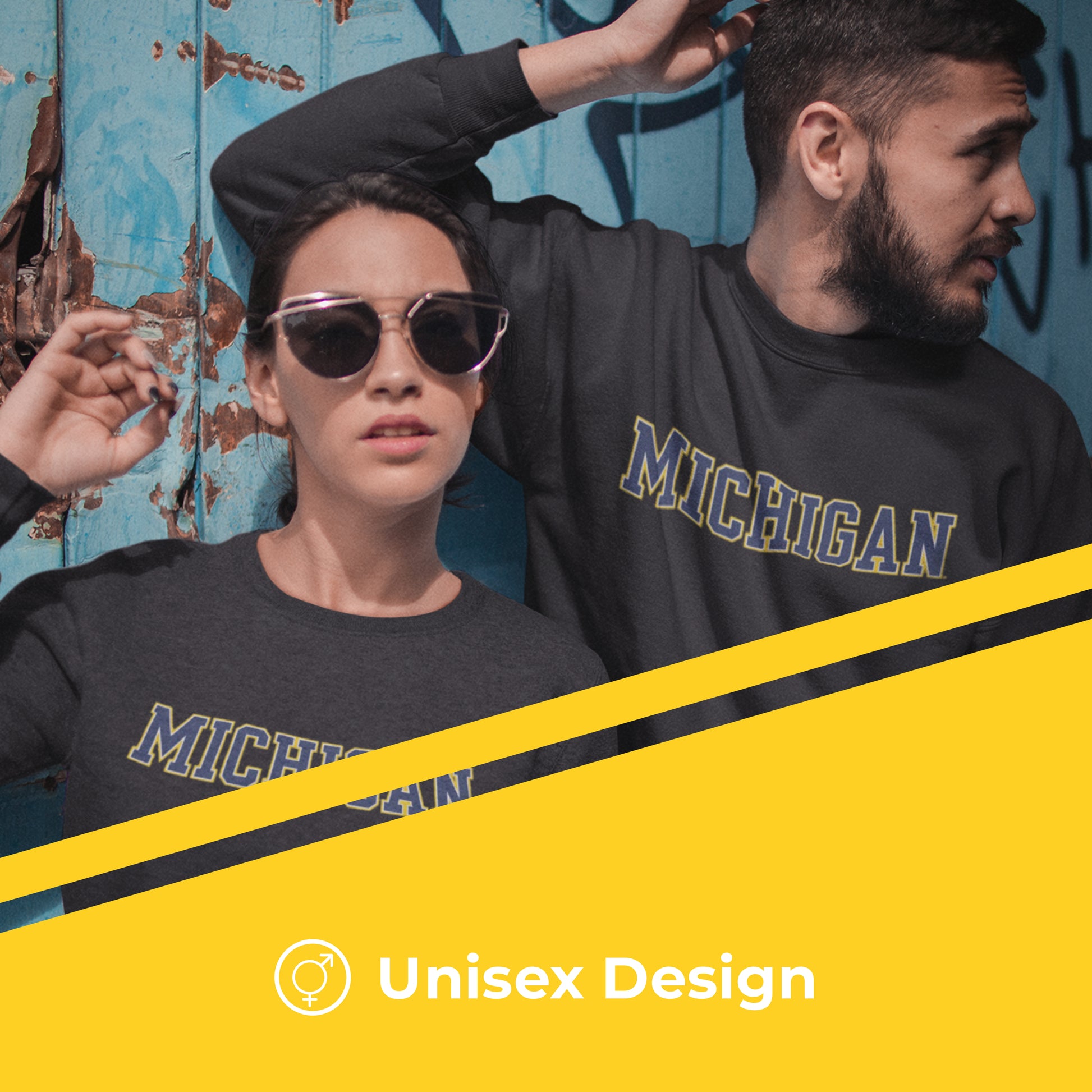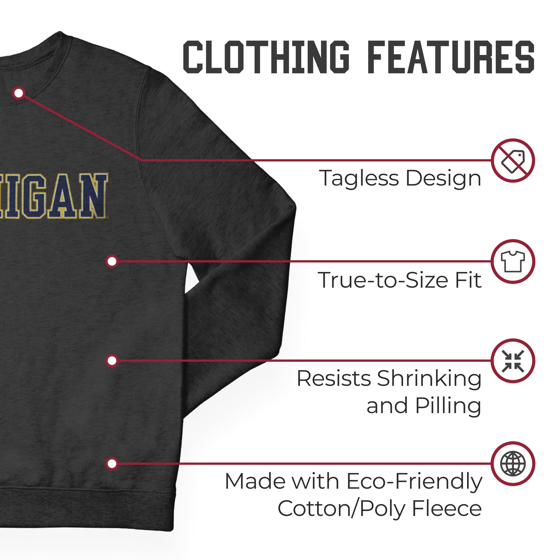 Our Charcoal Gameday Crewneck Sweatshirt is a college crewneck sweatshirt with a warm and toasty 9 oz fleece lining. It's the very best of Michigan Wolverines apparel, plain and simple. Gear up for your school's cold weather football or hockey game with confidence. Or, for women, bring it with you to basketball games and tie it around your leggings in case the arena is a little chilly. Our college crew neck sweatshirts for men and women are super comfortable, run true to size, and are great for showing your school pride all year long. Plus, the unisex fit is ideal for both men and women and works as an oversized sweatshirt for kids. College crewnecks for men and women feature your school's screen-printed university wordmark will stay crisp and clear, wear after wear. All colors and fonts are officially licensed and are of the highest of quality, it even comes with an officially licensed tag. Features: ribbed cuffs and waistband. This college sweatshirts crew in particular is perfect for tailgates, games, and showing off your school spirit. Gameday crewneck Michigan Wolverines sweatshirts make a great birthday, Christmas (or any other holiday), or graduation gift for any college student, upcoming high school or college graduate, alumni, or college sports fan. Gameday charcoal crewneck is essential collegiate apparel for protecting yourself and your loved ones from the elements. The fleece material will keep you warm through the colder months, and the no-zip design allows you to pullover and feel embraced like a big oversized blanket. The Michigan Wolverines charcoal crew necks are pre-shrunk and are made from a dual blend of 50% cotton and 50% polyester that is ideal for that tailgate or game day when the temperature drops. Pair with your other favorite Michigan game day apparel! Say goodbye to cheap sweatshirts. Our charcoal college sweatshirts for women and men help you gear up and get ready to cheer your team to victory.