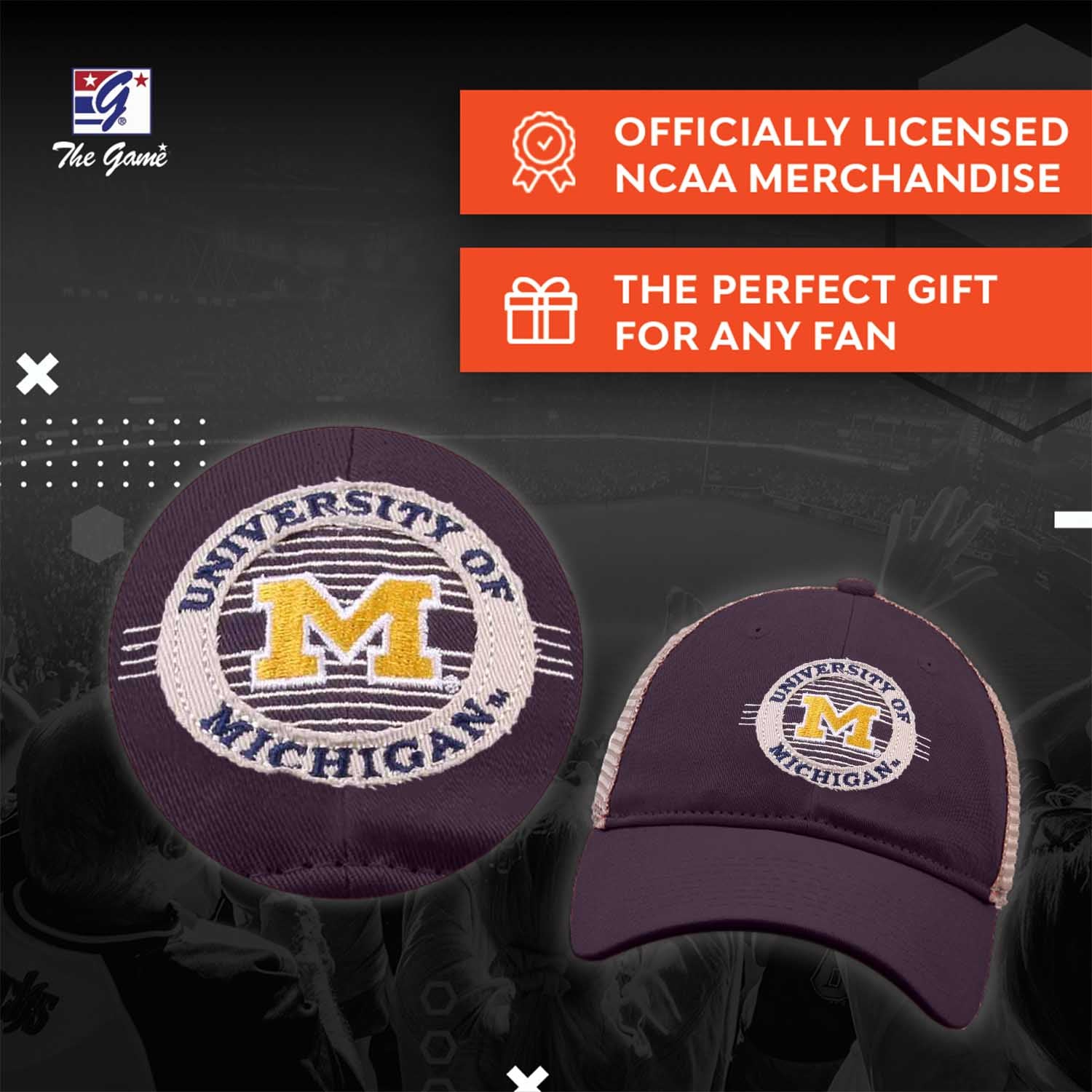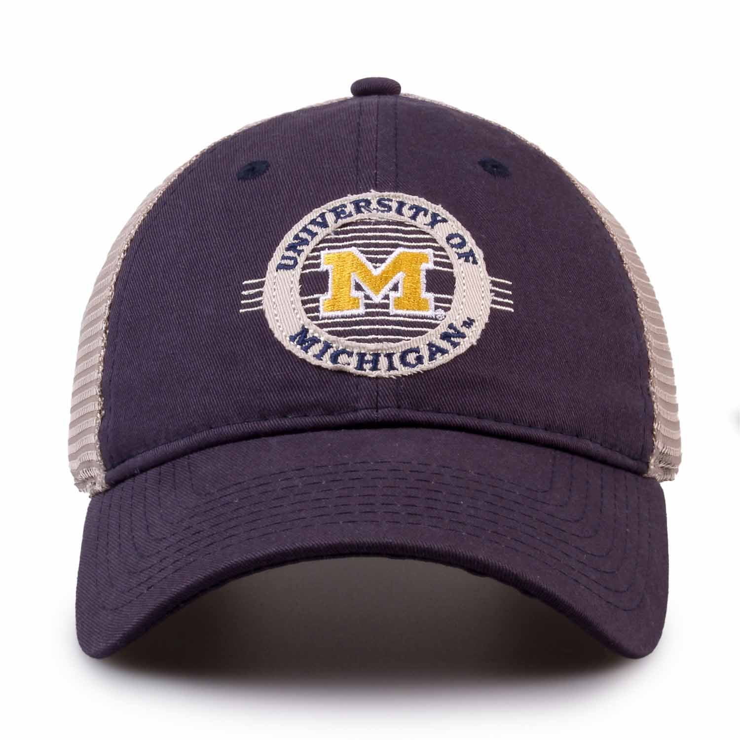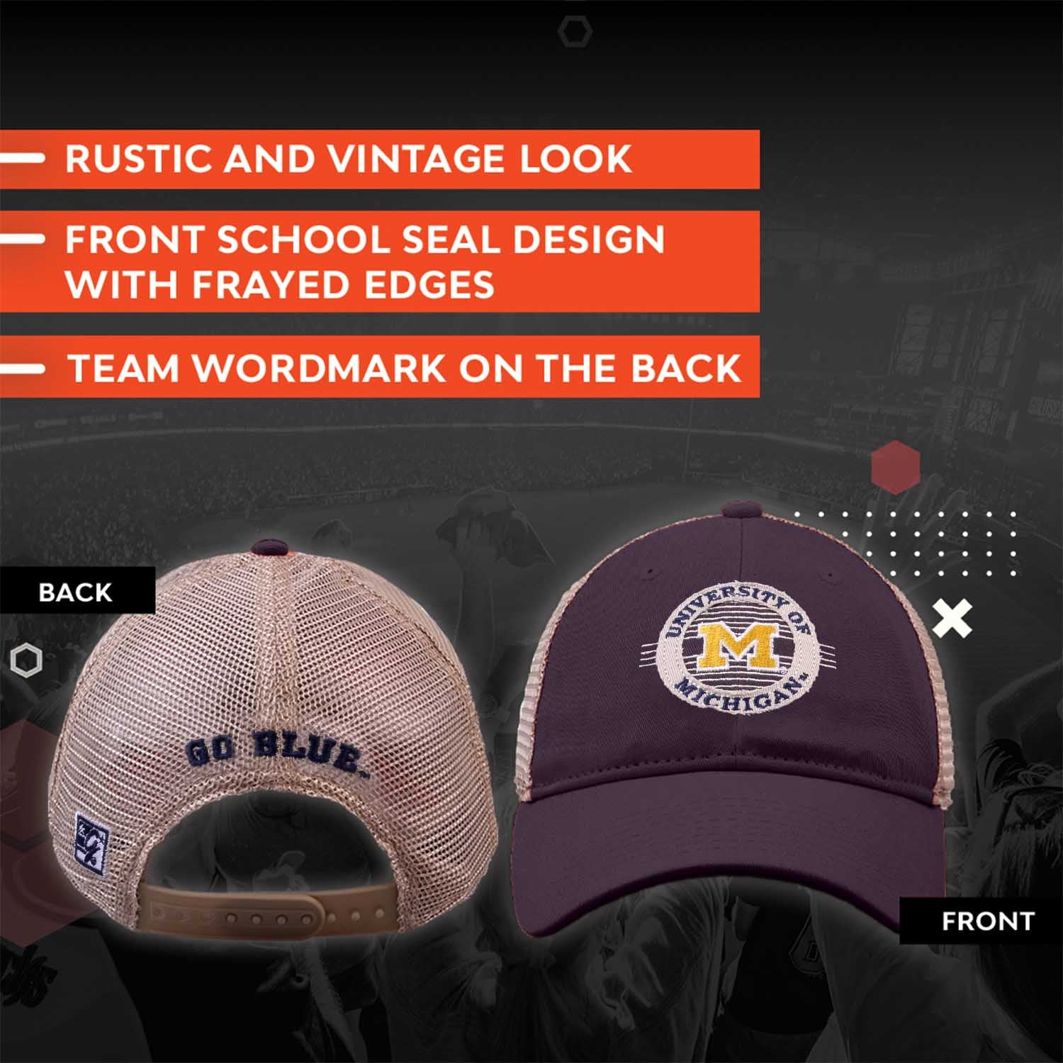 This Michigan Wolverines hat is the perfect Wolverines fan gift. It features a Michigan Wolverines school seal on the front, with frayed edges for a vintage flair. In a stylish script, the team wordmark is on the back of this Michigan baseball cap. The unstructured relaxed fit and adjustable snapback closure make this Michigan Wolverines cap comfortable for any fan. This mesh-back hat is also size adjustable, making these Wolverines hats excellent Michigan gifts for any fan. This Michigan hat is made from durable polyester soft-wash mesh and is perfect for those hot summer days. The comfortable fit & design ensure these college hats will not go out of style. Wear this baseball cap with Michigan Wolverines women's apparel or Michigan Wolverines apparel for men. Support your favorite team by wearing your Michigan Wolverines hat. Whether you are cheering on the team at a football game or at home, you can represent your team in this vintage baseball cap.