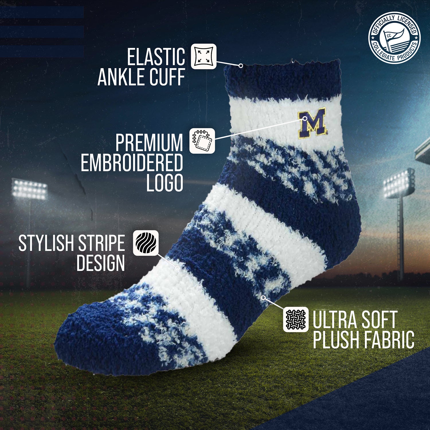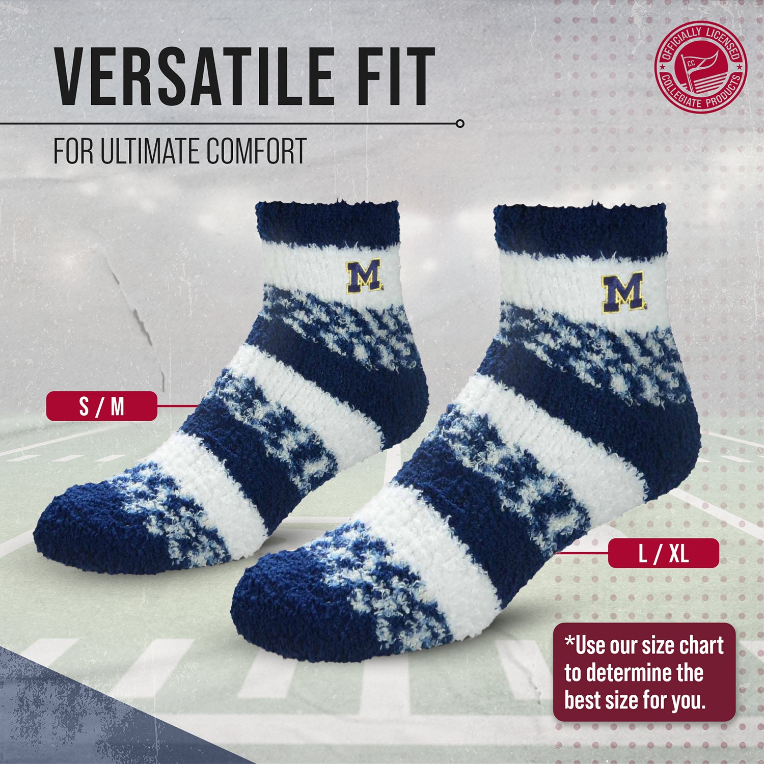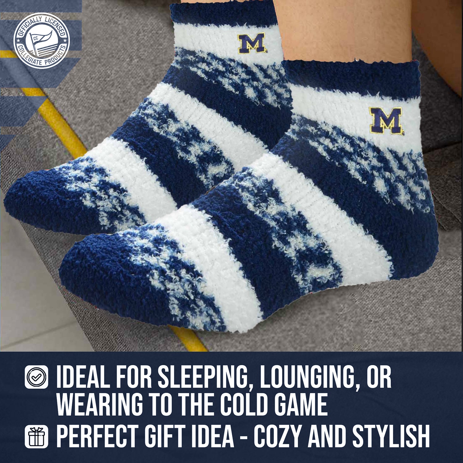 Keep Your Feet Cozy and Show Off Your Team Spirit with our College and University Sleep Socks! These ankle-length lounge socks are perfect for both men and women who want to stay warm and comfortable while proudly supporting their favorite school. Made from a soft, luxurious plush material, these socks feel super cozy against your skin and provide the ultimate level of comfort. With an ankle-length design, these Wolverines socks keep your feet fully covered and insulated, making them perfect for wearing around the house as slippers. They also make great gifts for any Michigan Wolverines fan in your life. Not only do they keep your feet warm, but these sleep socks also feature vibrant team-themed designs that are officially licensed and authentic. So whether you're lounging at home or heading to class, these cozy sleep socks are the perfect Michigan Wolverines accessory to show off your team pride. Get yours today and experience warmth, comfort, and style all in one!