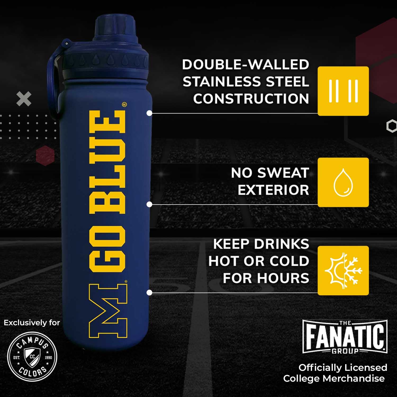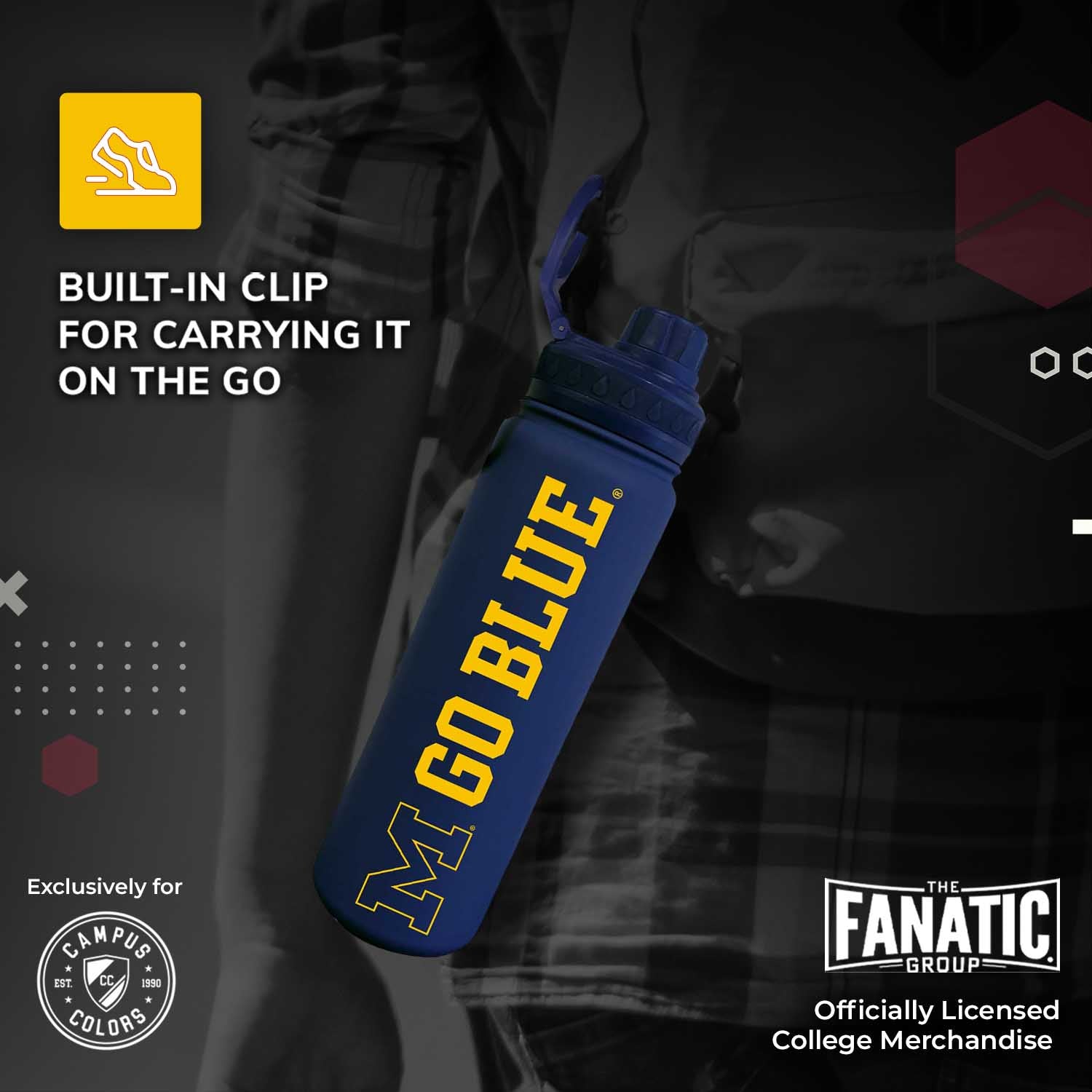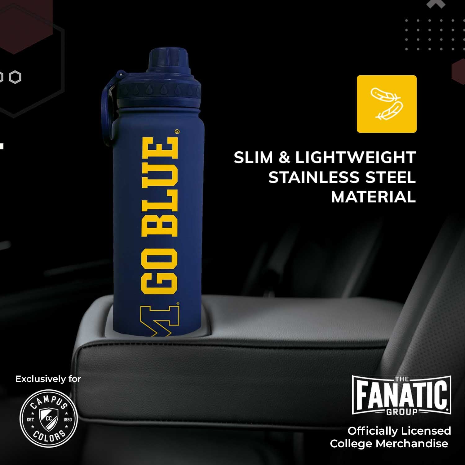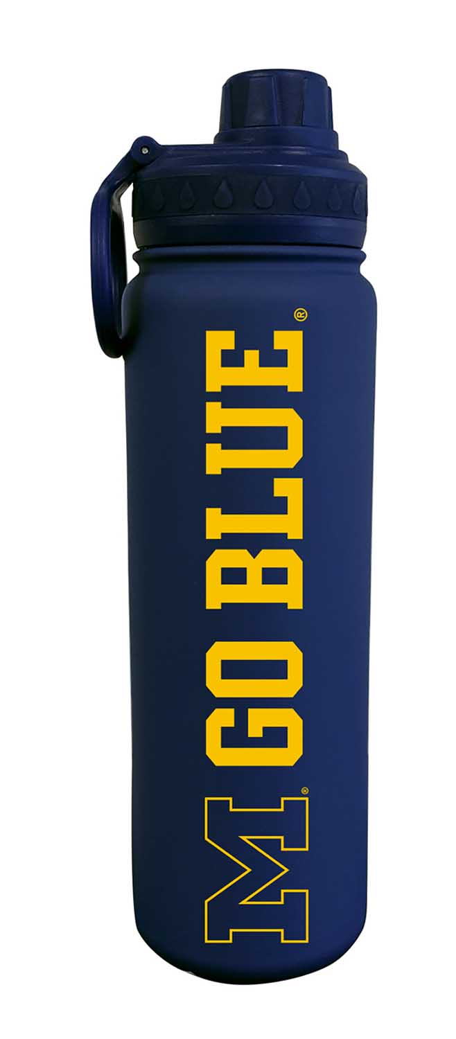 This officially licensed 24oz Michigan water bottle is the best accessory for any Michigan Wolverines fan. You can use this water bottle 24 oz for water, sports drink, or even to keep your coffee hot. Our vacuum sealed sport bottle ensures that your drinks stay hot or cold for hours. You can bring this bottle along to sport games, hikes, or tailgates on game day. This sport water bottle 24 oz is a slim bottle that fits in most car cup holders for convenience. This stainless sports water bottle features an easy flow spout for the best drinking experience. The twist on cap features an easy drinking spout to make sipping a breeze. The bottle's lid twists on and off to reveal an easy drinking mouthpiece. The convenience of our double walled water bottles make them perfect for sports and everyday life! Show off your school spirit with this Michigan Wolverines water bottle. This durable stainless sports water bottle make the perfect Michigan Wolverines accessories for any activity. Our water bottle with clip for backpack is perfect for student campus life and busy alumni activities. Our vacuum sealed water bottles feature a built in handle. The easy grab bottle allows you to sip your water without spilling it on yourself while playing sports or walking to class. The college water bottle is coated in silicone for added grip and softer finish, and the exterior is sweat free so the Michigan water bottle won't drip on you. This insulated water bottle is the perfect birthday or Christmas gift for fans who love to collect Michigan stuff. Pair with other Michigan novelties or apparel for the ultimate Wolverines gift for women and men. Michigan gear is great as birthday gifts for college students, alumni, and sport fans. With our Michigan Wolverines water bottle, fans can show team pride and stay hydrated all day and every day!