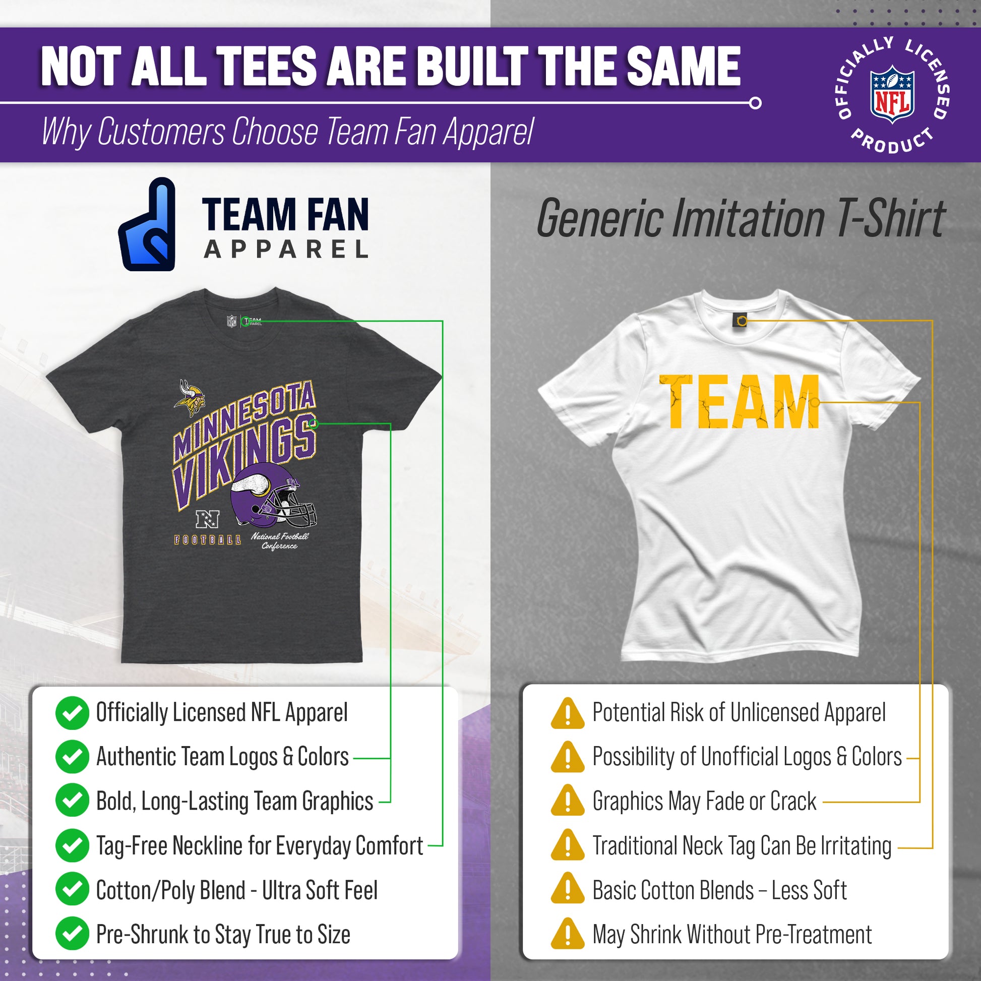 Show off your team spirit in style with our Team Fan Apparel Minnesota Vikings NFL Distressed Helmet Tag-Less T-Shirt! Made for both men and women, this unisex t-shirt is the perfect addition to any football fan's wardrobe. With its soft and comfortable cotton blend fabric, you'll love wearing it to games or just lounging at home. The tag-less design ensures maximum comfort without any annoying tags scratching at your neck. Featuring a large vibrant helmet design with the team name printed largely, along with the official team logo, this shirt will make you stand out from the crowd and show off your die-hard fandom. It comes in multiple sizes, so you can choose the one that fits best & represents your team spirit. Whether you're cheering on your Vikings at the stadium or watching from home, our NFL Distressed Helmet Tag-Less T-Shirt is a must-have for all fans! So grab yours today and support your team in comfort and style. Go team!