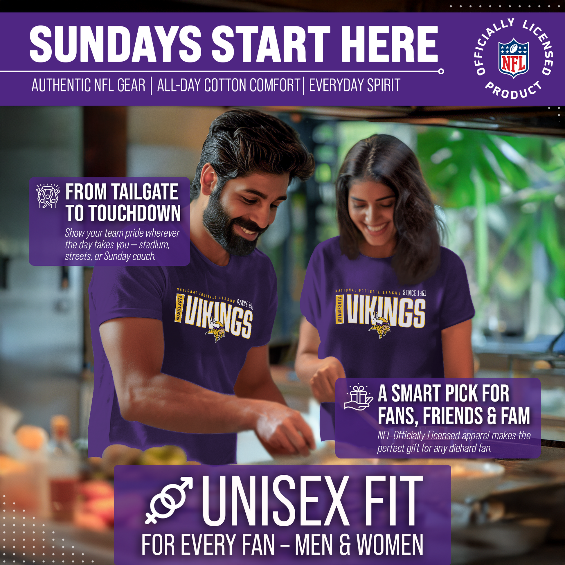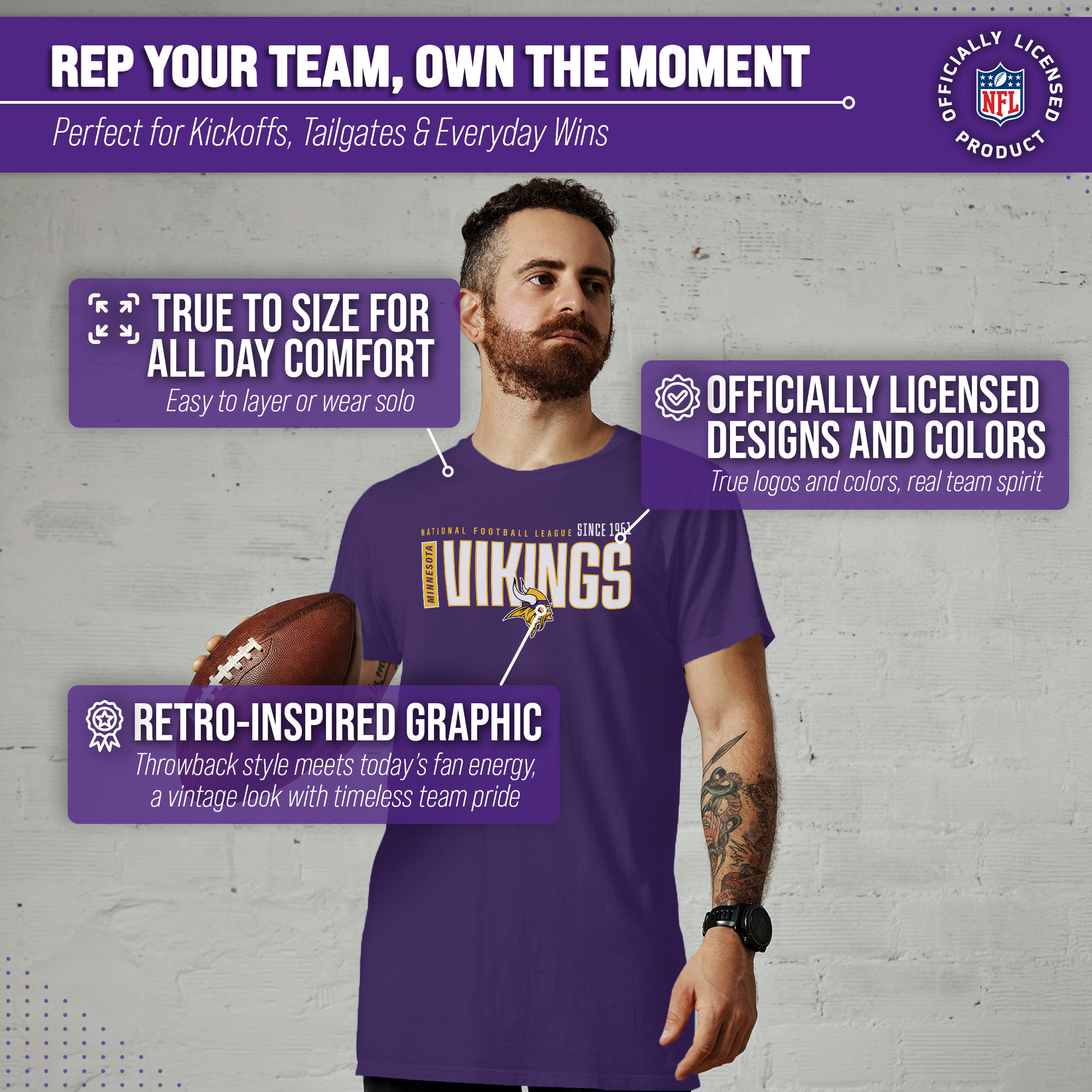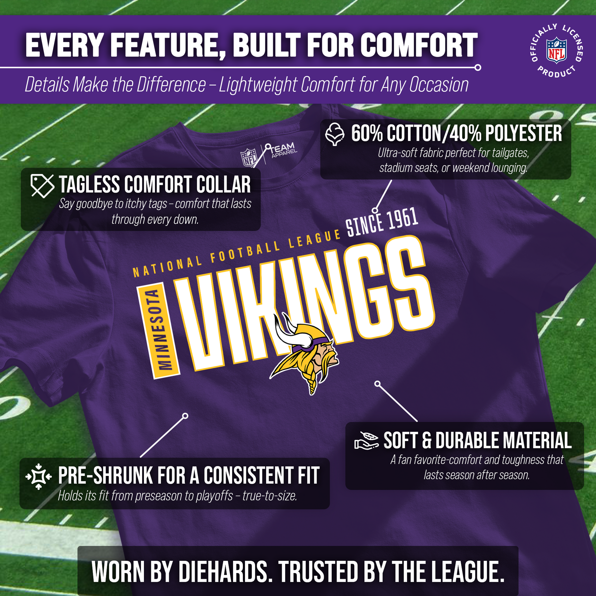 Show off your team pride in style with the officially licensed Team Fan Apparel Minnesota Vikings NFL Modern Endzone Tag-Less T-Shirt! Designed for both men and women, this versatile unisex tee is the ultimate staple for every football fan’s wardrobe. Whether you’re heading to the stadium, joining friends at a tailgate, or relaxing at home on game day, this Vikings shirt is built for all-day comfort and effortless style. Crafted from soft, breathable cotton, this shirt ensures a lightweight and comfortable fit that you’ll want to wear again and again. The tag-less neckline eliminates irritation, so you can cheer on the Minnesota Vikings distraction-free. With its modern endzone graphic design, bold team logo, and the year the Vikings were founded, this shirt highlights your loyalty and sets you apart as a true die-hard fan. Available in a wide range of sizes, this Minnesota Vikings NFL T-shirt is designed to deliver a flattering and comfortable fit for every fan. Pair it with jeans for a casual everyday look, or layer it with your favorite hoodie or jacket when temperatures drop. It’s the perfect way to represent the Vikings season after season, no matter where you’re watching the action unfold. Looking for the ultimate gift for a fellow football fan? This Modern Endzone T-shirt is a must-have piece of officially licensed Minnesota Vikings apparel. From birthdays to holidays—or just because—it’s an easy win for any Vikings supporter who wants to show their pride in comfort and style. Celebrate your passion for the game and your team history with the Minnesota Vikings NFL Modern Endzone Tag-Less T-Shirt. Comfortable, stylish, and packed with team spirit, this tee makes it clear who you’re cheering for every time you wear it. Don’t miss out—grab yours today and rep the Vikings with pride all season long!
