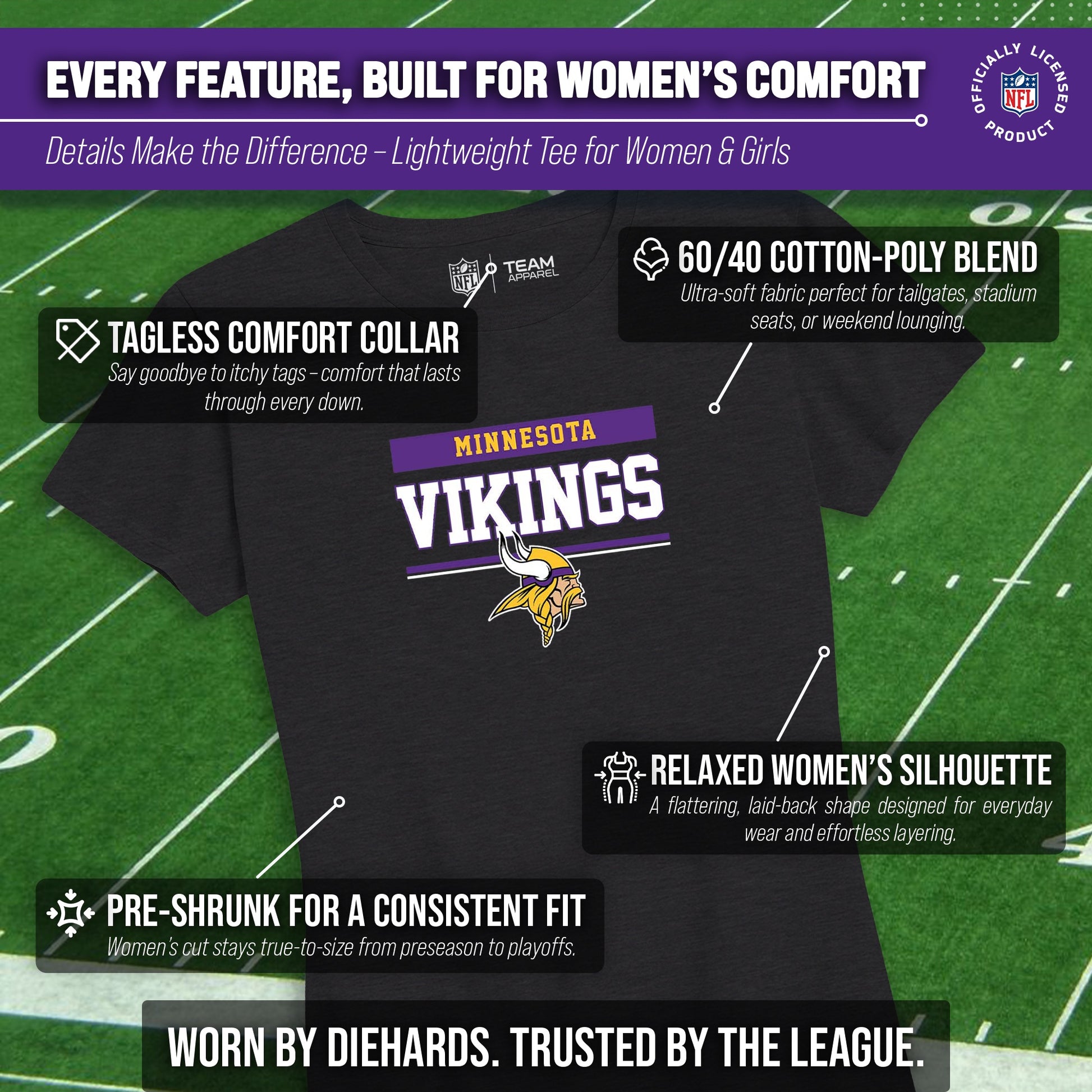 Our officially licensed womens Minnesota shirt is super comfortable, runs true to size, and is great for showing off your Minnesota Vikings pride. The high-quality thermal printed logo will look fresh after years of wear, making it a great alternative to your womens Minnesota Vikings jersey. Our charcoal t-shirt has a relaxed yet contoured fit for a casual yet feminine look. The short sleeve shirt is perfect with shorts for tailgates in warmer months, or with jeans or leggings and a sweater during colder months. Available in plus sizes, our Minnesota shirts for women plus size or straight size will make anyone feel comfortable enough to show off their love for the Minnesota Vikings. If you're looking to give team t shirts for women as a gifts, our womens charcoal tshirt is the Vikings shirt women will love. Officially licensed to ensure no counterfeit designs or colors, our Minnesota Vikings womens shirts are great for superfans. 100% ringspun and made from a blend of cotton and polyester, designed to keep you cool and comfortable all year long. The womens gameday football t shirt will definitely become one of your favorite tops.
