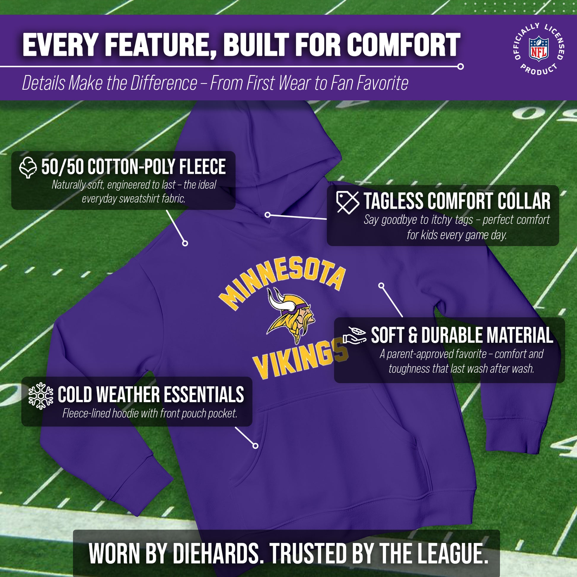 Our youth gameday Minnesota Vikings football pullover hoodie with a front pouch pocket is the ideal sweatshirt to wear on gameday. This Vikings hoodie for kids is comfortable and great for showing team pride all year long. This is an essential piece of girls and boys football apparel for pro football fans. Our team-colored hoodie sweatshirts are the perfect fan apparel for school and sports games. This hooded pullover with a pocket is ideal for warm or cold weather games. Vikings football pullover hoodie is made from a cotton poly blend material with raglan sleeves. These youth pro football sweatshirts have high quality features. Our youth gameday pullover hoodies feature 1x1 ribbing at cuffs and waistband. This Minnesota hoodie youth sweatshirt has a twill neck tape. The raglan sleeves add a sophisticated look to these pro football team hoodies for boys and girls. This tagless sweatshirt ensures the most comfortable fit for boys and girls. The standard fit makes our football team hoodies for boys and girls the perfect kids sweatshirt for young fans. The thermal printed graphics are high definition, true to authentic team color, and resist fading. Our hoodies also make the best Vikings gifts for boys and girls. Youth football apparel is the perfect birthday gift for any professional sports fan. Our youth football team hoodies for boys and girls are great for wearing to school, the stadium, or while you're watching the game at home.