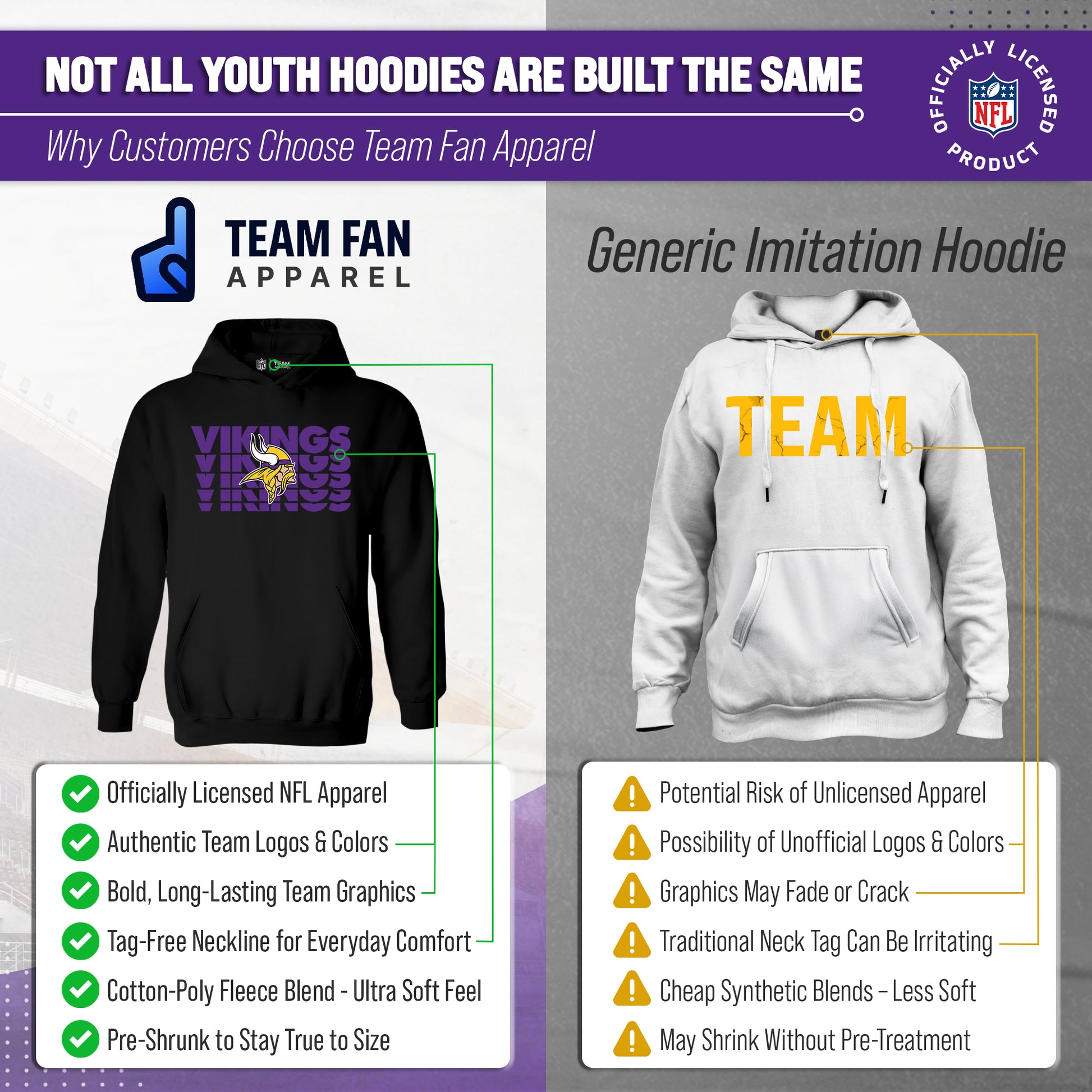 Hey there, young sports fans! Get ready to show off your team spirit with the Team Fan Apparel Minnesota Vikings Youth Repeating Logo Football Fleece Hooded Sweatshirt! Made from a soft and cozy cotton polyester fleece, this sweatshirt is perfect for staying warm on game day or any day. The unisex design makes it suitable for both boys and girls, and its tag-less feature ensures ultimate comfort all day long. Featuring an original repeating logo design that proudly displays your team's colors and logos, this youth hoodie will be turning heads everywhere it's worn. The front pouch pocket will keep you warm on those cold game days as you cheer on your Vikings! Just pull it on and go! So whether you're at the stadium or hanging out with friends, make sure you're representing your team in style with our NFL youth apparel. Printed and designed in the USA, have confidence your sweatshirt will last! Order now and get your future pro geared up to be the next super fan!