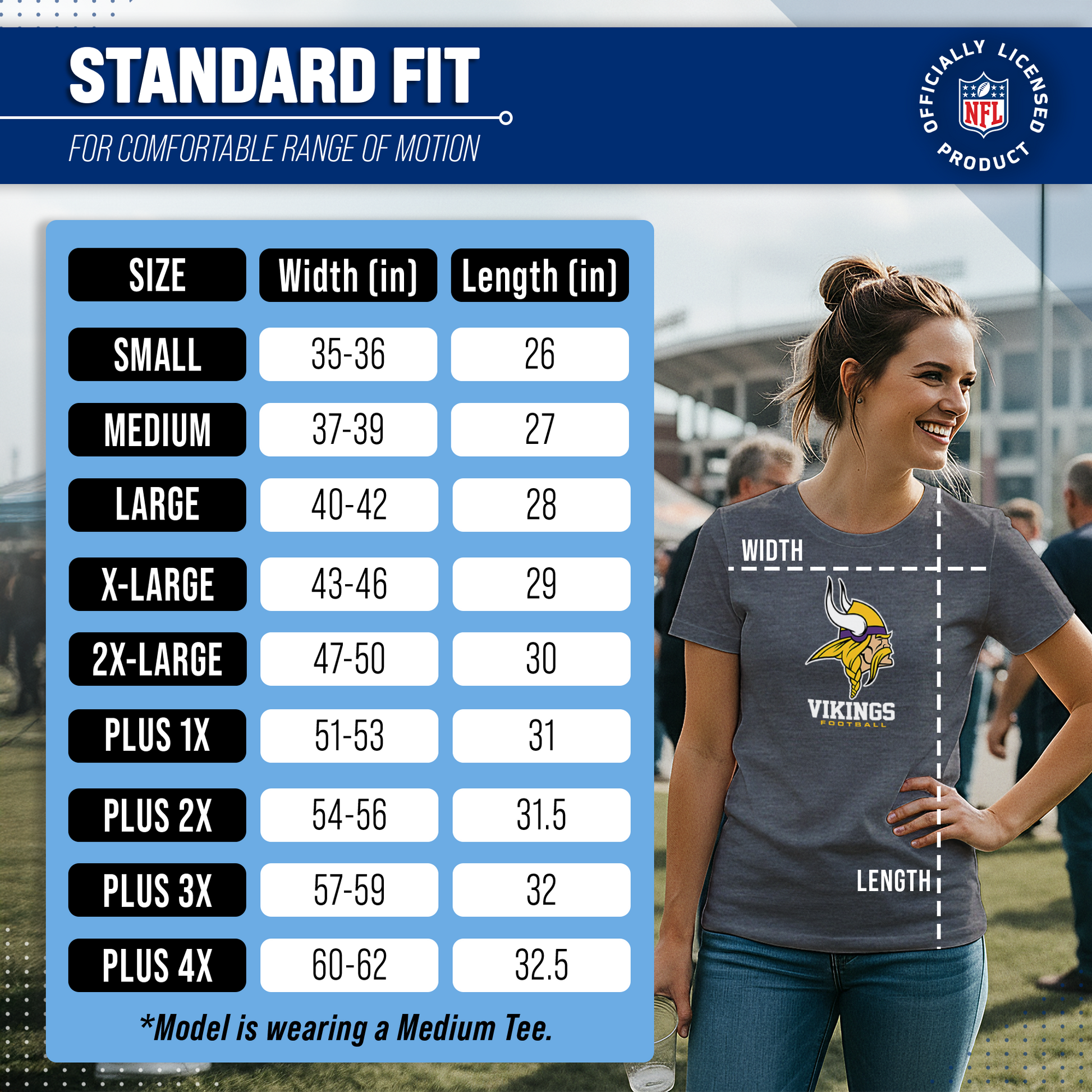 Score with Team Fan Apparel, the ultimate destination for officially licensed NFL apparel for men and women. We use only the highest-quality screen printing techniques to bring you the most comfortable, durable, and stylish clothing possible. Go ahead and show your team pride at the big game or any time! This premium womens t-shirt comes in small, medium, large, XL, and XXL. So needless to say, it fits Minnesota Vikings fans of all types! Maybe you aren't a Vikings fan but you know someone who is? Don't worry! This high-quality t-shirt is soft, lightweight, breathable, and a GREAT gift for any birthday, anniversary, Mother's day, Valentine's day, or Christmas gift! So, if you want to stand out as the #1 female fan at the next big game or watch party, you're going to want to be wearing one of these Minnesota Vikings Women's Big Logo t-shirts.