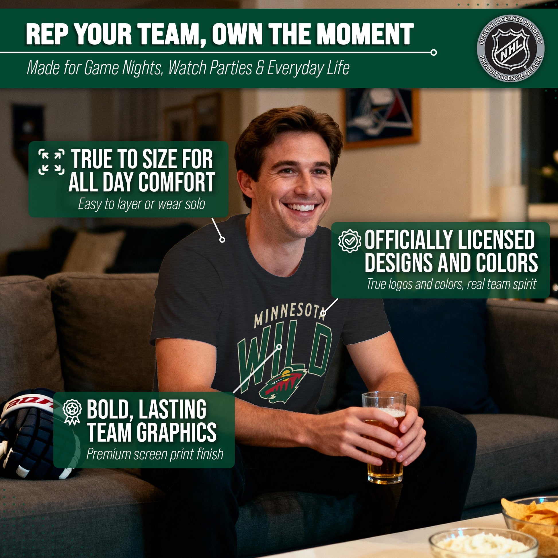 Score with Team Fan Apparel, the ultimate destination for officially licensed NHL apparel for men and women. Design and printed in the USA, we use only the highest quality screen printing techniques to bring you the most comfortable, durable, and stylish clothing possible. Go ahead and show your team pride at the big game or any time! This premium Minnesota Wild heather t-shirt fits both male and female adults and comes in small, medium, large, XL, and XXL. So needless to say, it fits Wild fans of all types! Maybe you aren't a hockey fan but you know someone who is? Don't worry! This high-quality t-shirt is soft, lightweight, breathable and a GREAT gift for any birthday, graduation, anniversary, Father's Day, Mother's day, you name it! So, if you want to stand out as the #1 fan at the next big game or watch party, you're going to want to be wearing one of these hockey t-shirts.