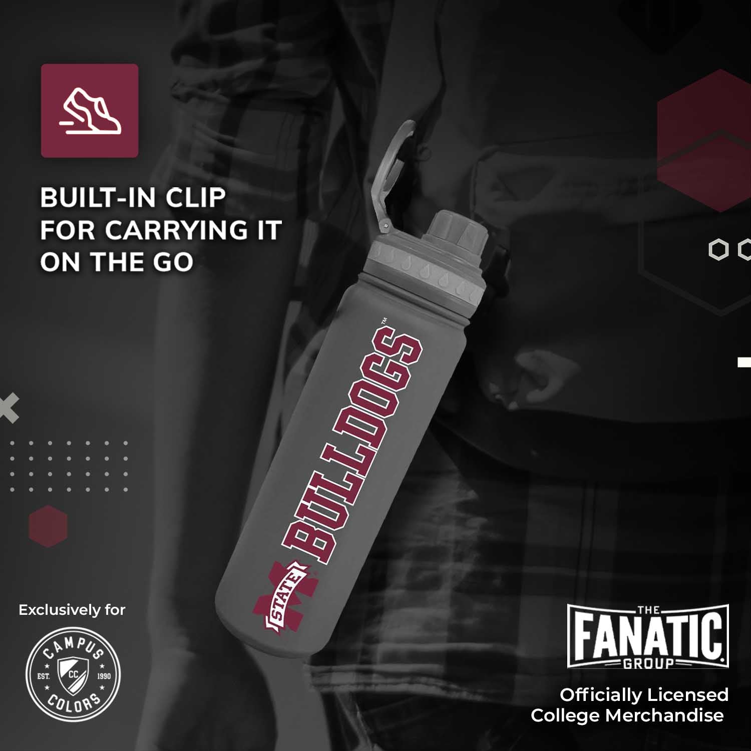 This officially licensed 24oz Mississippi State water bottle is the best accessory for any Mississippi State Bulldogs fan. You can use this water bottle 24 oz for water, sports drink, or even to keep your coffee hot. Our vacuum sealed sport bottle ensures that your drinks stay hot or cold for hours. You can bring this bottle along to sport games, hikes, or tailgates on game day. This sport water bottle 24 oz is a slim bottle that fits in most car cup holders for convenience. This stainless sports water bottle features an easy flow spout for the best drinking experience. The twist on cap features an easy drinking spout to make sipping a breeze. The bottle's lid twists on and off to reveal an easy drinking mouthpiece. The convenience of our double walled water bottles make them perfect for sports and everyday life! Show off your school spirit with this Mississippi State Bulldogs water bottle. This durable stainless sports water bottle make the perfect Mississippi State Bulldogs accessories for any activity. Our water bottle with clip for backpack is perfect for student campus life and busy alumni activities. Our vacuum sealed water bottles feature a built in handle. The easy grab bottle allows you to sip your water without spilling it on yourself while playing sports or walking to class. The college water bottle is coated in silicone for added grip and softer finish, and the exterior is sweat free so the Mississippi State water bottle won't drip on you. This insulated water bottle is the perfect birthday or Christmas gift for fans who love to collect Mississippi State stuff. Pair with other Mississippi State novelties or apparel for the ultimate Bulldogs gift for women and men. Mississippi State gear is great as birthday gifts for college students, alumni, and sport fans. With our Mississippi State Bulldogs water bottle, fans can show team pride and stay hydrated all day and every day!