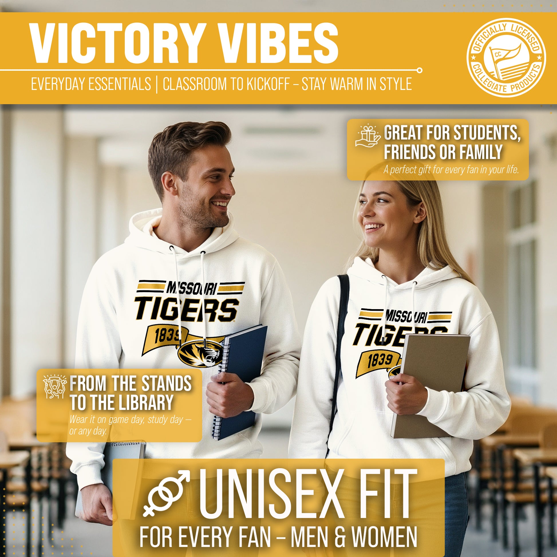 Show off your team spirit and stay warm in the NCAA Adult Unisex Varsity Club Pennant Missouri Tigers Hooded Fleece Sweatshirt! This cozy sweatshirt is perfect for any Missouri fan, with its vibrant colored pennant design. Made from a comfortable cotton poly fleece fabric, this Tigers hooded sweatshirt features long sleeves, a front pouch pocket, and a hood to keep you extra snug on chilly days. But that's not all - you can wear this Missouri sweatshirt game after game without worrying about wear and tear. It's the perfect addition to your college team apparel collection, whether you're cheering on your team at the stadium or just lounging at home. It is the number one Missouri item you'll want to have on the next cold game day! So why settle for a plain old sweatshirt when you can show off your love for Missouri Tigers in style? Get your NCAA Adult Unisex Varsity Club Pennant Hooded Fleece Sweatshirt today for yourself or any Tigers fan in your life and be confident know that you are rocking the most authentic and official gear!