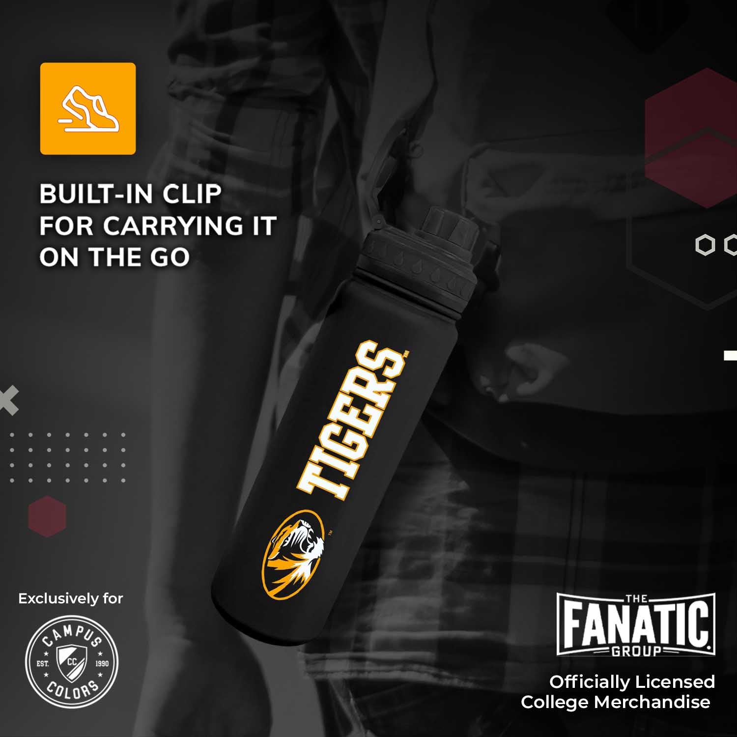 This officially licensed 24oz Missouri water bottle is the best accessory for any Missouri Tigers fan. You can use this water bottle 24 oz for water, sports drink, or even to keep your coffee hot. Our vacuum sealed sport bottle ensures that your drinks stay hot or cold for hours. You can bring this bottle along to sport games, hikes, or tailgates on game day. This sport water bottle 24 oz is a slim bottle that fits in most car cup holders for convenience. This stainless sports water bottle features an easy flow spout for the best drinking experience. The twist on cap features an easy drinking spout to make sipping a breeze. The bottle's lid twists on and off to reveal an easy drinking mouthpiece. The convenience of our double walled water bottles make them perfect for sports and everyday life! Show off your school spirit with this Missouri Tigers water bottle. This durable stainless sports water bottle make the perfect Missouri Tigers accessories for any activity. Our water bottle with clip for backpack is perfect for student campus life and busy alumni activities. Our vacuum sealed water bottles feature a built in handle. The easy grab bottle allows you to sip your water without spilling it on yourself while playing sports or walking to class. The college water bottle is coated in silicone for added grip and softer finish, and the exterior is sweat free so the Missouri water bottle won't drip on you. This insulated water bottle is the perfect birthday or Christmas gift for fans who love to collect Missouri stuff. Pair with other Missouri novelties or apparel for the ultimate Tigers gift for women and men. Missouri gear is great as birthday gifts for college students, alumni, and sport fans. With our Missouri Tigers water bottle, fans can show team pride and stay hydrated all day and every day!