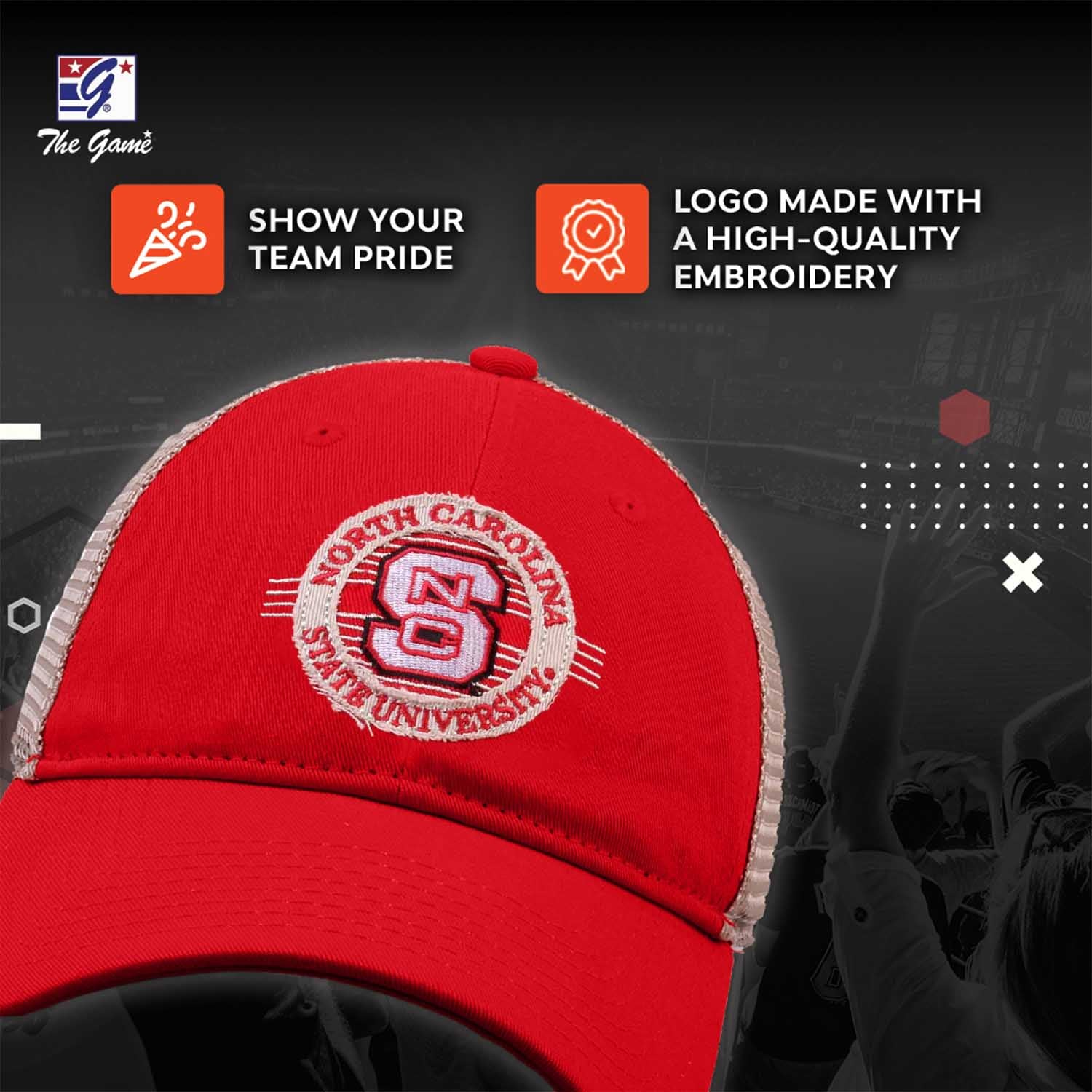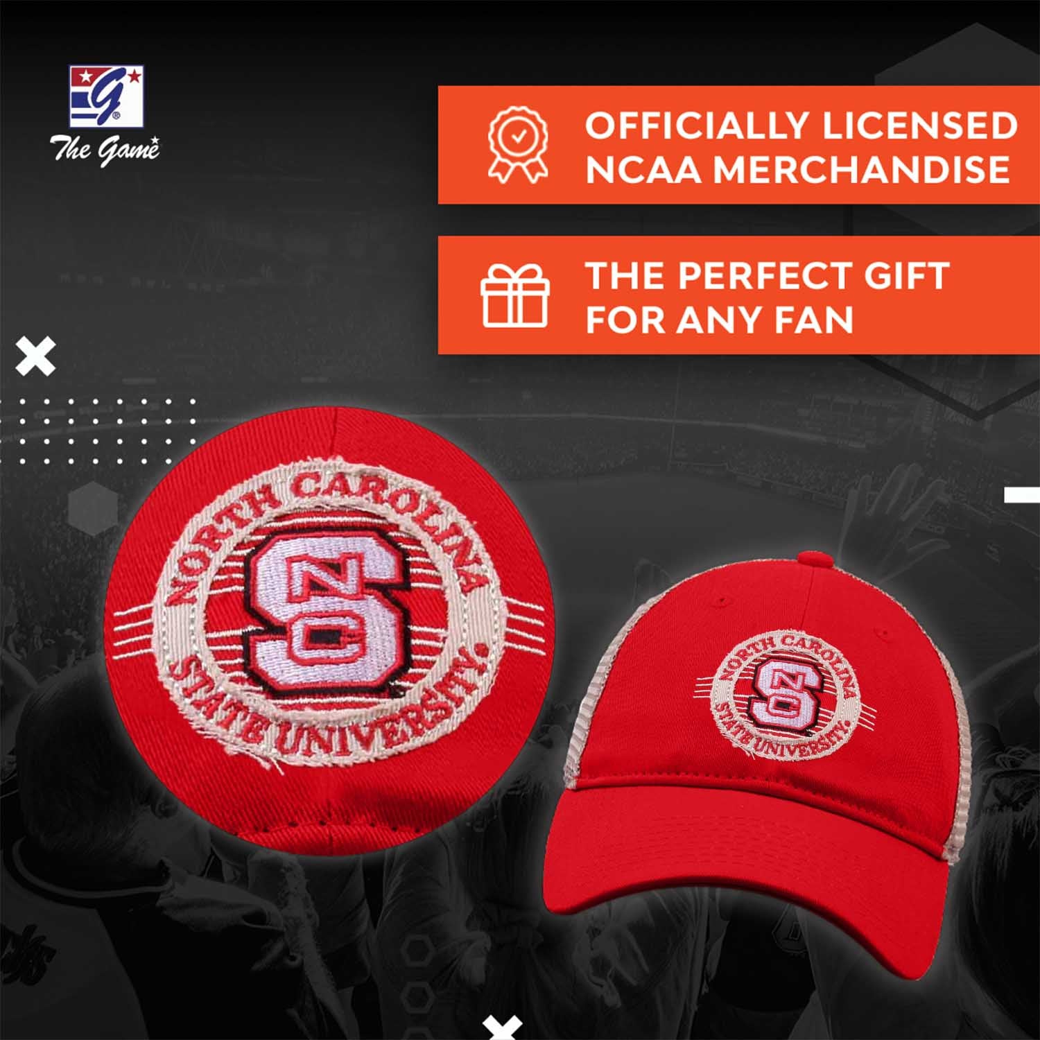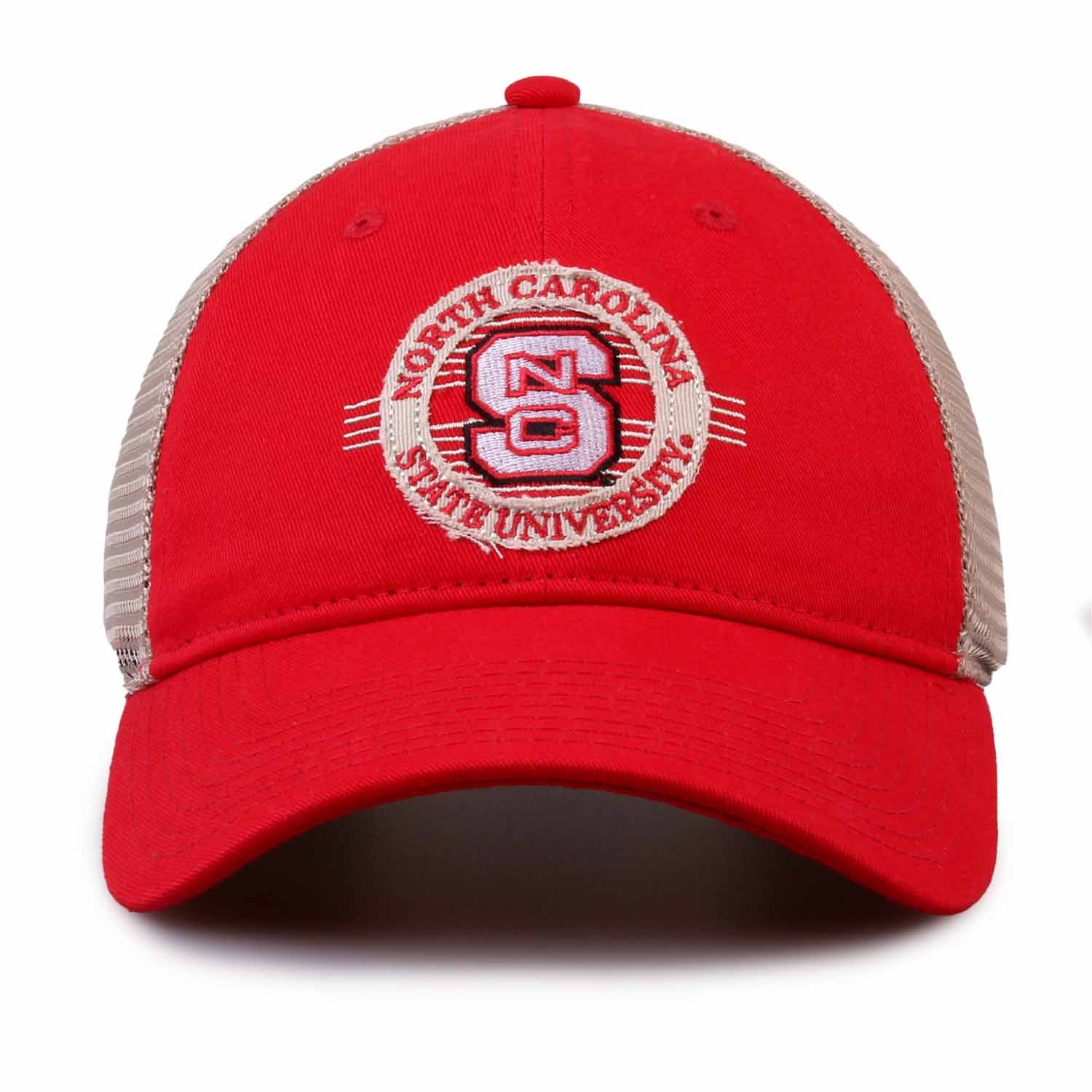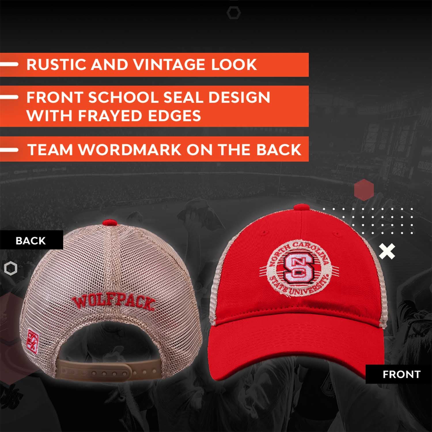 This NC State Wolfpack hat is the perfect Wolfpack fan gift. It features a NC State Wolfpack school seal on the front, with frayed edges for a vintage flair. In a stylish script, the team wordmark is on the back of this NC State baseball cap. The unstructured relaxed fit and adjustable snapback closure make this NC State Wolfpack cap comfortable for any fan. This mesh-back hat is also size adjustable, making these Wolfpack hats excellent NC State gifts for any fan. This NC State hat is made from durable polyester soft-wash mesh and is perfect for those hot summer days. The comfortable fit & design ensure these college hats will not go out of style. Wear this baseball cap with NC State Wolfpack women's apparel or NC State Wolfpack apparel for men. Support your favorite team by wearing your NC State Wolfpack hat. Whether you are cheering on the team at a football game or at home, you can represent your team in this vintage baseball cap.