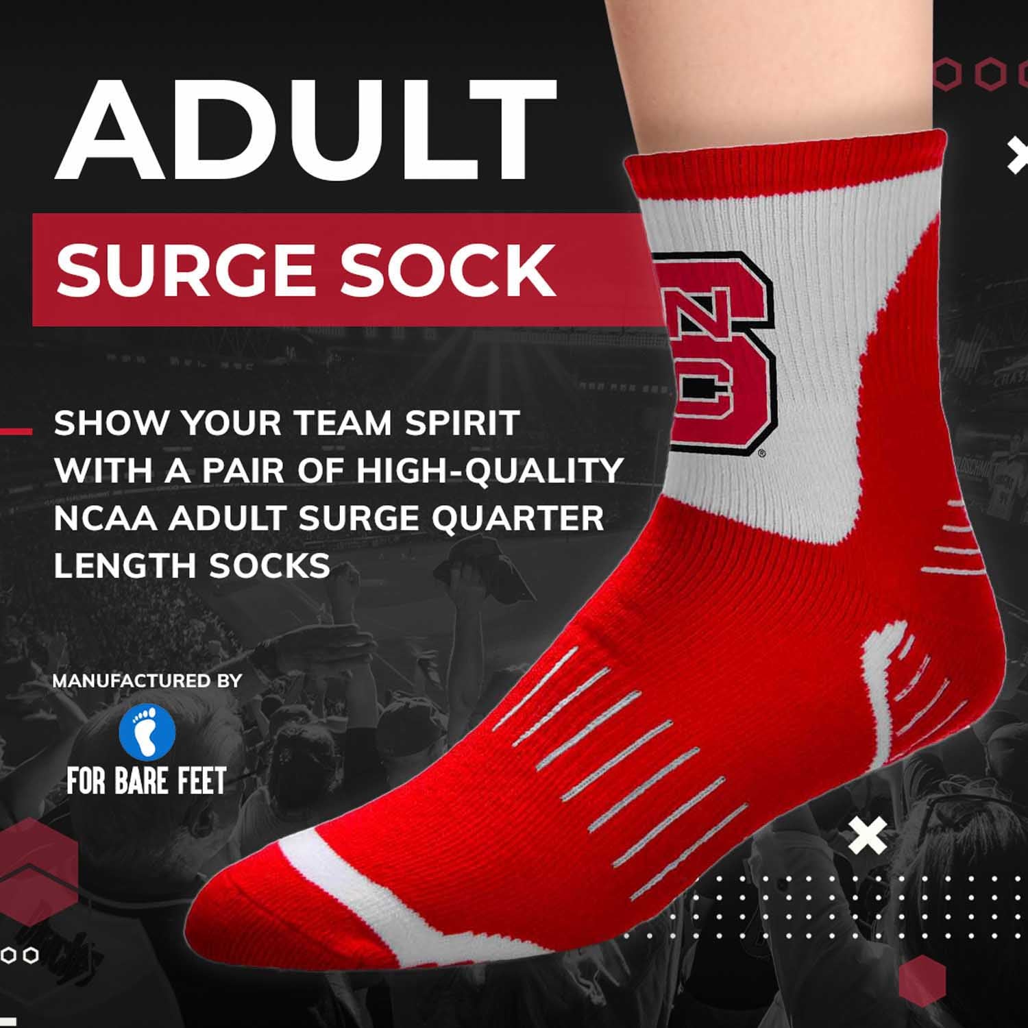 These Adult Surge Quarter Length Socks are the perfect way to show your team spirit on game day or any day. When you are rooting for NC State Wolfpack these socks are the perfect complement to any apparel for both mens and womens. As the must have NC State gifts, these NC State socks complement your Wolfpack clothing all year long and when watching college football NC State. Coordainates with NC State attire for men.