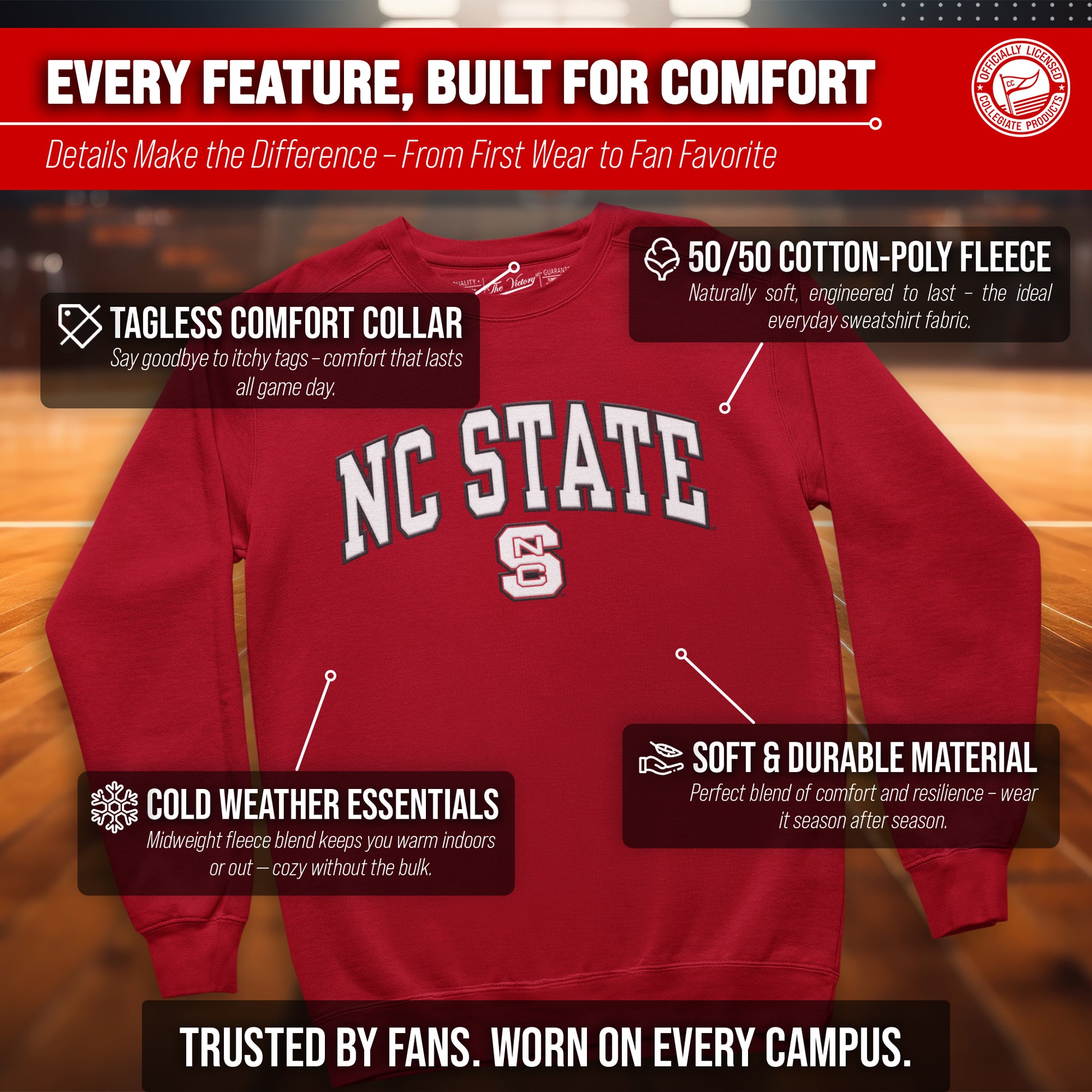 The NC State Wolfpack Adult Tackle Twill Crewneck Sweatshirt is super comfortable, runs true to size, and is great for showing off your school pride. All crewneck pullovers are a fan favorite and look fresh after many years. The Wolfpack crewneck sweatshirt has a unisex fit that is ideal for both men and women. The embroidered university logo and name will stay crisp wear after wear. Our college crewneck sweatshirt is ideal when thrown over a t-shirt for football tailgates, games, when the temperature drops, or when you just want to show off your team spirit! The university crewneck sweatshirt is the perfect gift for any college student, upcoming graduate, alumnus or sports fan. Made with quality material, the double letter embroidered university logo is made of precise laser cut appliques applied with heat that will stay crisp wear after wear. All logos and colors are NCAA officially licensed. Our NC State Wolfpack crewneck is essential collegiate apparel for showing off your school or team pride. Lightweight college crewneck sweatshirt is made from a dual blend of 50% cotton and 50% polyester that is ideal for that tailgate or game day when the temperature drops. Cheer on your Wolfpack in style!