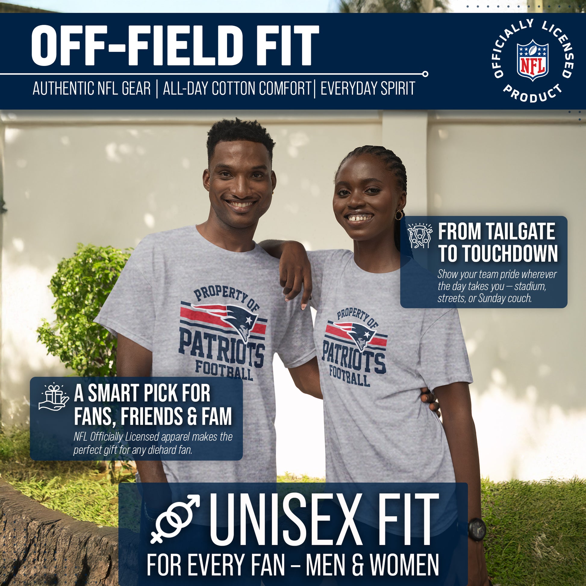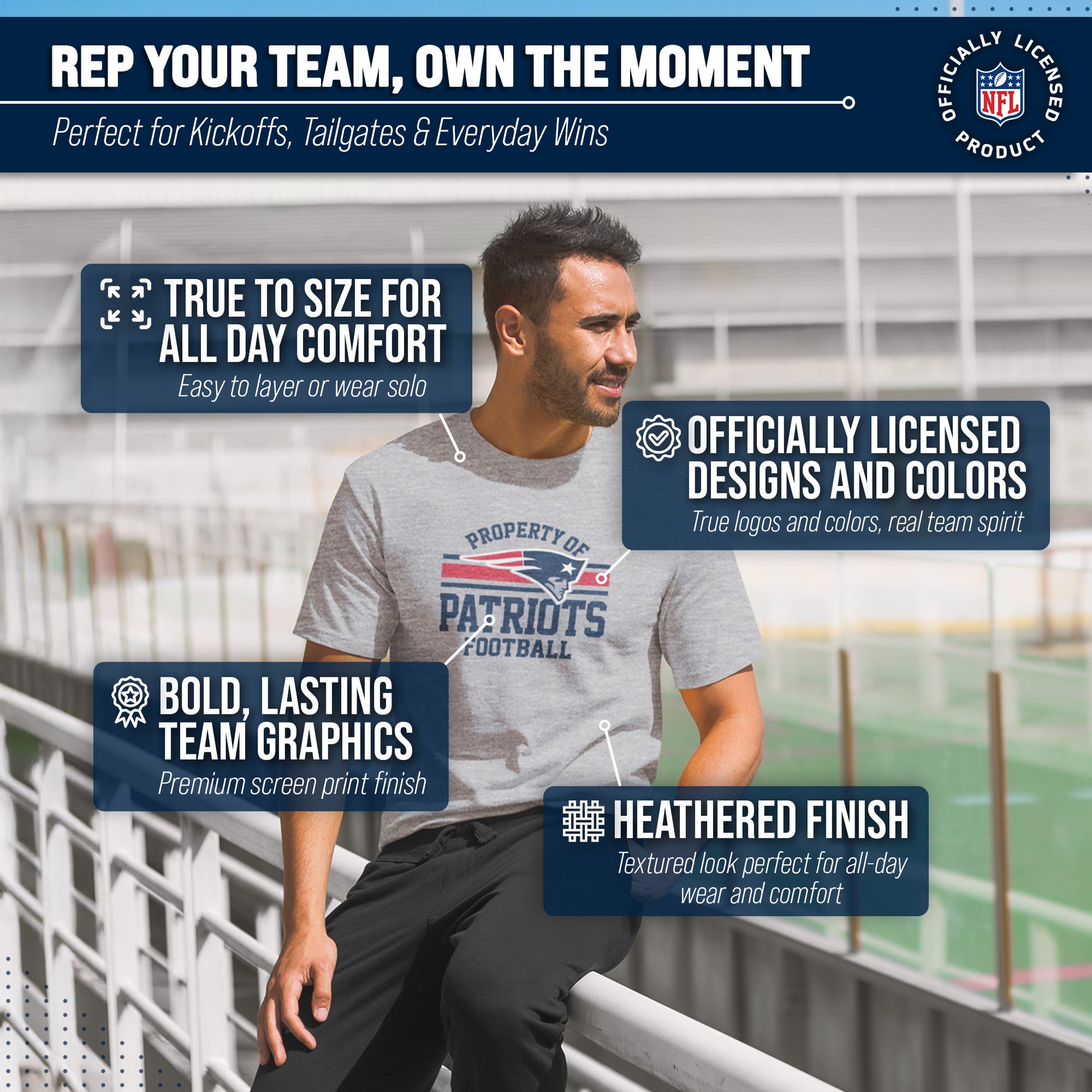 This Property of New England Patriots tshirt is made from 50% ringspun cotton and 50% polyester. Our soft Patriots tshirt is beyond comfortable and light enough to keep you cool on gameday. This and soft enough that you'll want to wear it every day. Tagless pro football t-shirt ensures comfortability and avoids neck irritation. This tee is perfect for sensitive skin. The soft material of this short sleeve shirt is skin-friendly and adjusts according to your body shape; heather, dual blend material leaves a trendy look without that irritating, heavy printed feel. This pro football tee features official Property of graphics. Our tshirts are designed and printed in the USA. These high quality shirts are made with stitch density for smoother printing surface. This Property of New England shirt gives the look only a true fan can accomplish. This is essential apparel for any football or sports fan. Our graphic shirts for men and women will make you stand out on gameday. This lightweight t-shirt is perfect for watching the game, working out, or for a fathers day gifts. It's perfect for New England football games. This shot sleeve tee is a great addition to any superfan's wardrobe. Our pro football short sleeve shirts offer a unisex fit that is ideal for both men and women. This Property of New England tshirt is perfect for tailgates parties, big games, or when you just want to show off your team spirit. These festive Property of Program shirts are the ideal Patriots gifts for men and women pro football teams.