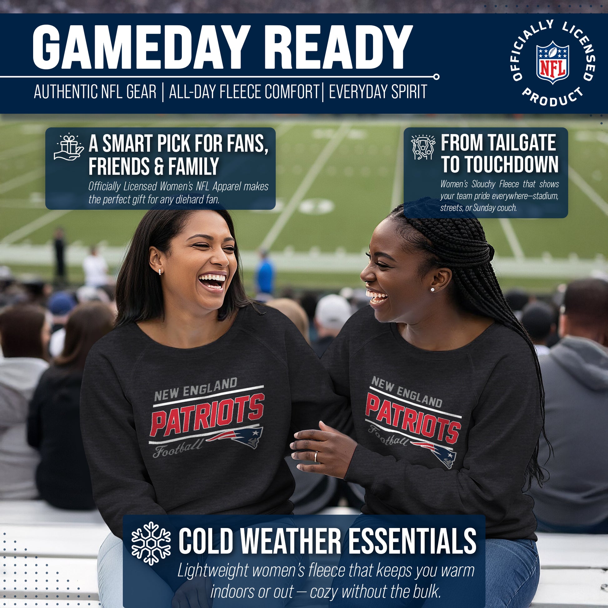 Our officially licensed New England Patriots long sleeve crew neck pullover is super comfortable, runs true to size, and is great for showing off your Patriots pride. The high-quality thermal printed logo will look fresh after years of wear, making it a great alternative to wearing a New England Patriots womens jersey. Our womens long sleeve Gameday crewneck has a relaxed fit for a casual, comfortable look. The long sleeve Patriots crew will look great with shorts at tailgates in warmer months, or with jeans or leggings when it gets cooler. Layer it with a hoodie or even a New England football jersey when the weather gets cold. Available in plus sizes up to 3XW, this is a New England Patriots pullover that women who are plus size or straight size will feel comfortable in. If you're looking to give the gift of ladies Patriots apparel, our long sleeved New England Patriots Slouchy Crew is the perfect gift. Officially licensed to ensure no counterfeit designs or colors, these New England crews for women are perfect for super fans. Made from a cotton poly blend to keep you comfortable, the womens raglan long sleeve Gameday Slouchy Crew will definitely become one of your favorite pieces of New England Patriots apparel.