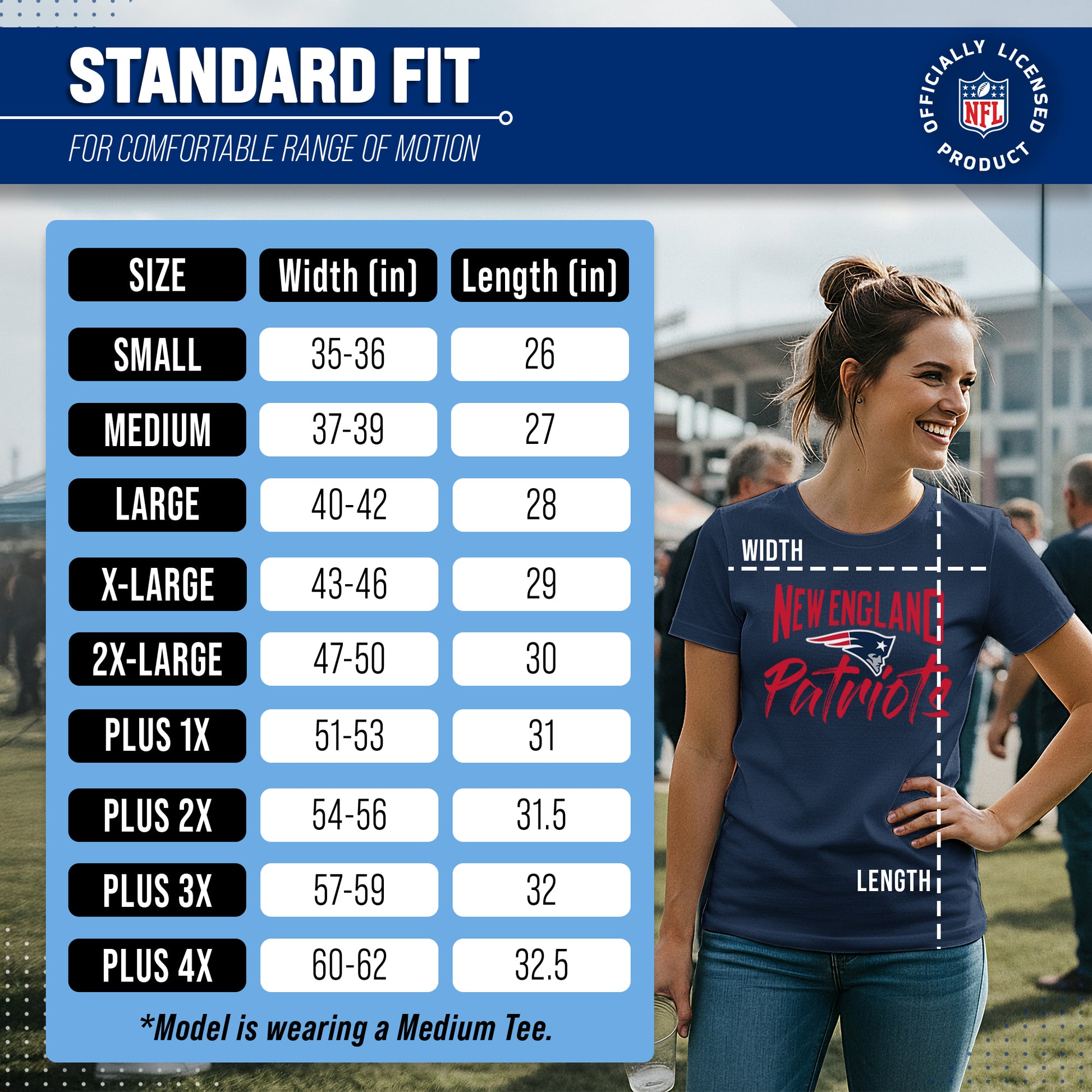 Our officially licensed womens Patriots shirt is super comfortable, runs true to size, and is great for showing off your New England Patriots pride. The high-quality printed script hand painted looking design will look fresh wash after wash, making it a great alternative to your womens New England Patriots jersey. Our womens football t-shirt has a relaxed yet contoured fit for a casual yet feminine look. The short sleeve shirt is perfect for tailgates in warmer months, or with jeans or leggings and a sweater during colder months. If you're looking to give team t shirts for women as a gift, our womens paintbrush tshirt is the Patriots shirt women will love. Officially licensed to ensure no counterfeit designs or colors, our New England Patriots womens shirts are great for superfans. This t shirt will become a fan favorite for women on gameday.