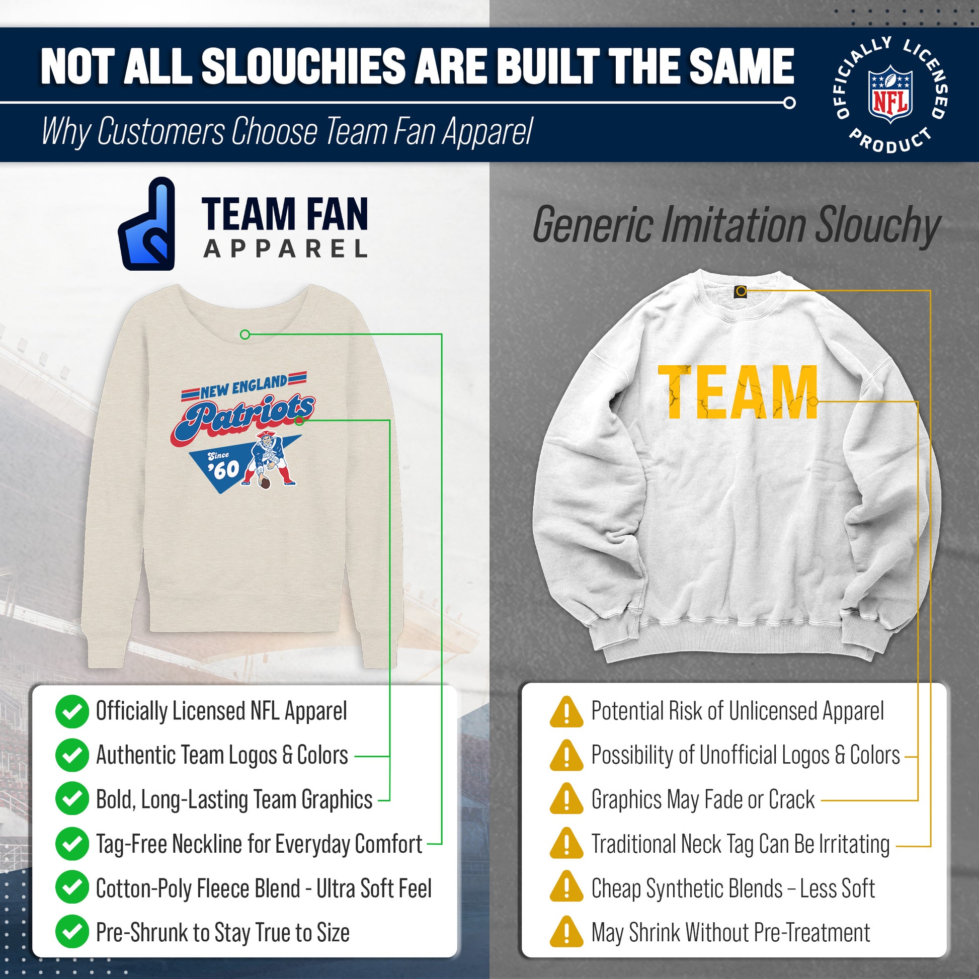 Hey there, fellow lady football fans! Show off your team pride in style with our Team Fan Apparel New England Patriots NFL Women's Vinntage Charm Slouchy Crewneck Fleece Pullover. Made with extra soft cotton polyester fleece material, this long sleeve pullover sweatshirt will keep you warm and cozy on game day or any chilly day. With a tagless design, you won't have to worry about any annoying tags distracting you from cheering on your team. Featuring a 90's design and relaxed fit, this pullover adds a touch of fashion to your game day wardrobe. Available in a range of women's sizes, it's the perfect addition to any fan's closet. Whether you're headed to the stadium or watching from home, stay cool and stylish with this must-have piece of Patriots apparel. Don't let snow or cold weather dampen your team spirit - grab one for yourself or as a gift for the ultimate football-loving lady in your life! Go Patriots!