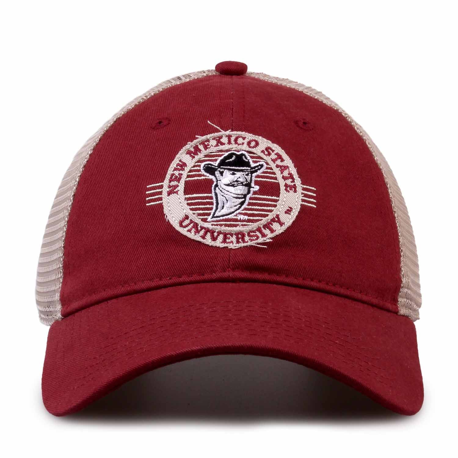 This New Mexico State Aggies hat is the perfect Aggies fan gift. It features a New Mexico State Aggies school seal on the front, with frayed edges for a vintage flair. In a stylish script, the team wordmark is on the back of this New Mexico State baseball cap. The unstructured relaxed fit and adjustable snapback closure make this New Mexico State Aggies cap comfortable for any fan. This mesh-back hat is also size adjustable, making these Aggies hats excellent New Mexico State gifts for any fan. This New Mexico State hat is made from durable polyester soft-wash mesh and is perfect for those hot summer days. The comfortable fit & design ensure these college hats will not go out of style. Wear this baseball cap with New Mexico State Aggies women's apparel or New Mexico State Aggies apparel for men. Support your favorite team by wearing your New Mexico State Aggies hat. Whether you are cheering on the team at a football game or at home, you can represent your team in this vintage baseball cap.