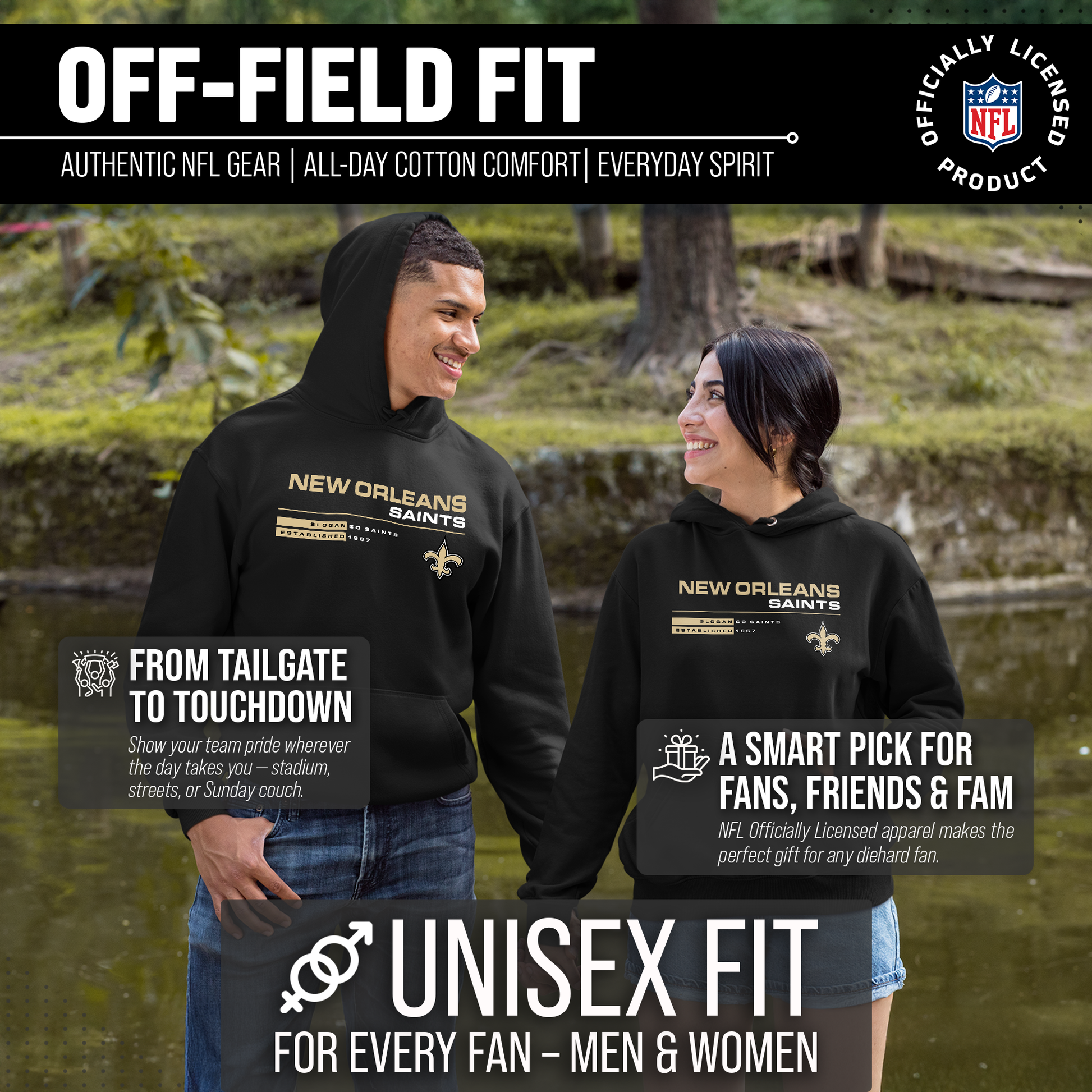 Score with Team Fan Apparel, the ultimate destination for officially licensed NFL apparel for men and women. We use only the highest quality screen printing techniques to bring you the most comfortable, durable, and stylish clothing possible. Go ahead and show your team pride at the big game or any time! This premium hooded sweatshirt fits both male and female adults and comes in small, medium, large, XL, and XXL. So needless to say, it fits New Orleans Saints fans of all types! Maybe you aren't a Saints fan but you know someone who is? Don't worry! This high-quality sweatshirt is soft, lightweight but cozy, breathable and a GREAT gift for any birthday, anniversary, or Christmas gift; Father's Day, Mother's day, you name it! The front pouch pocket, drawstring hood, and soft fleece will keep you warm and keep your fandom hot! So, if you want to stand out as the #1 fan at the next big game, tailgate or watch party, you're going to want to be wearing one of these stat sheet hooded sweatshirts