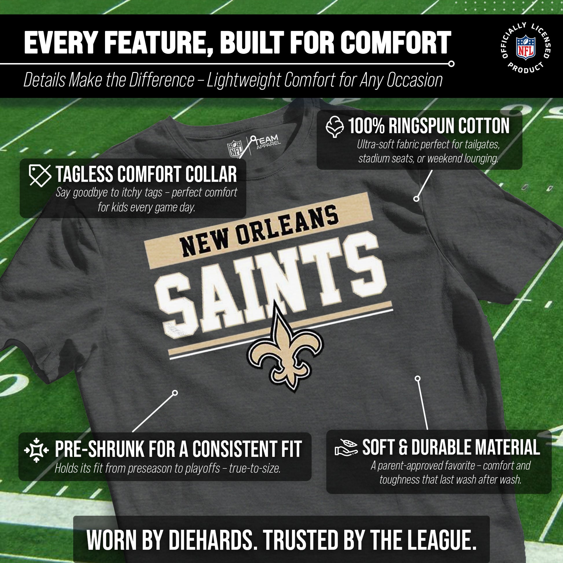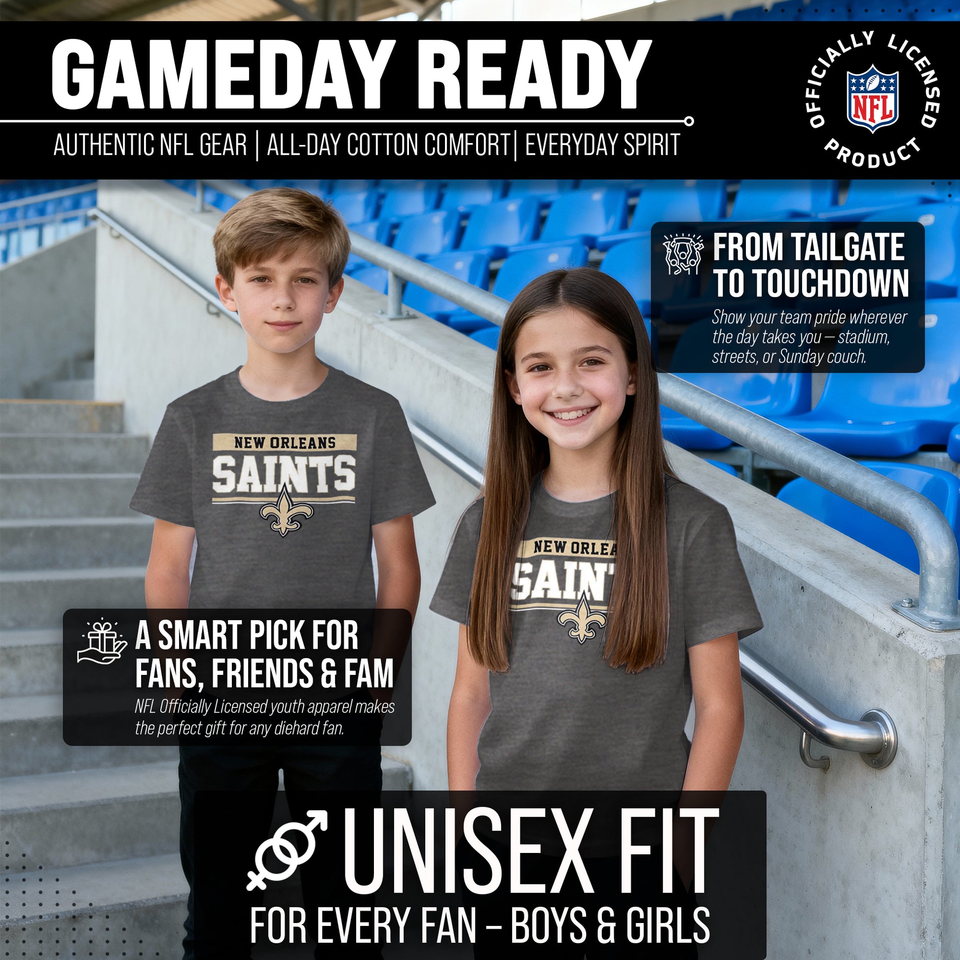 Heather/charcoal wordmark girls and boys New Orleans Saints t shirts are the ultimate light, soft, and comfortable tee. These Saints tshirts for kids are the most versatile football apparel. Let us help you celebrate and showcase team pride with our durable and lightweight t shirts for boys and girls. This tee features a quality, thermal printed wordmark that will last wear after wear. The official wordmark design gives you the look of a loyal and seasoned sports fan and the unique heather, dual-blended material gives a trendy, distressed look without that heavy printed feel. Made of 50% cotton and 50% polyester, the dual blend material is extremely soft, smooth and comfortable. These New Orleans Saints youth shirts for boys and girls comes without a tag, so you'll never feel annoyed or irritated by those pesky neck tags again! This tee is essential apparel for any football fan. This classic New Orleans youth t shirt will stand out and is perfect for gameday, hanging out with friends, or wearing to school. The unisex fit and design makes it ideal for both boys and girls! Quality Saints t shirt makes the best birthday, or Christmas gifts for young fans; Our New Orleans Saints shirts for kids run true to size. All quality logos and colors are officially licensed and are of the highest quality. Show off your team pride with this official short sleeve shirt!