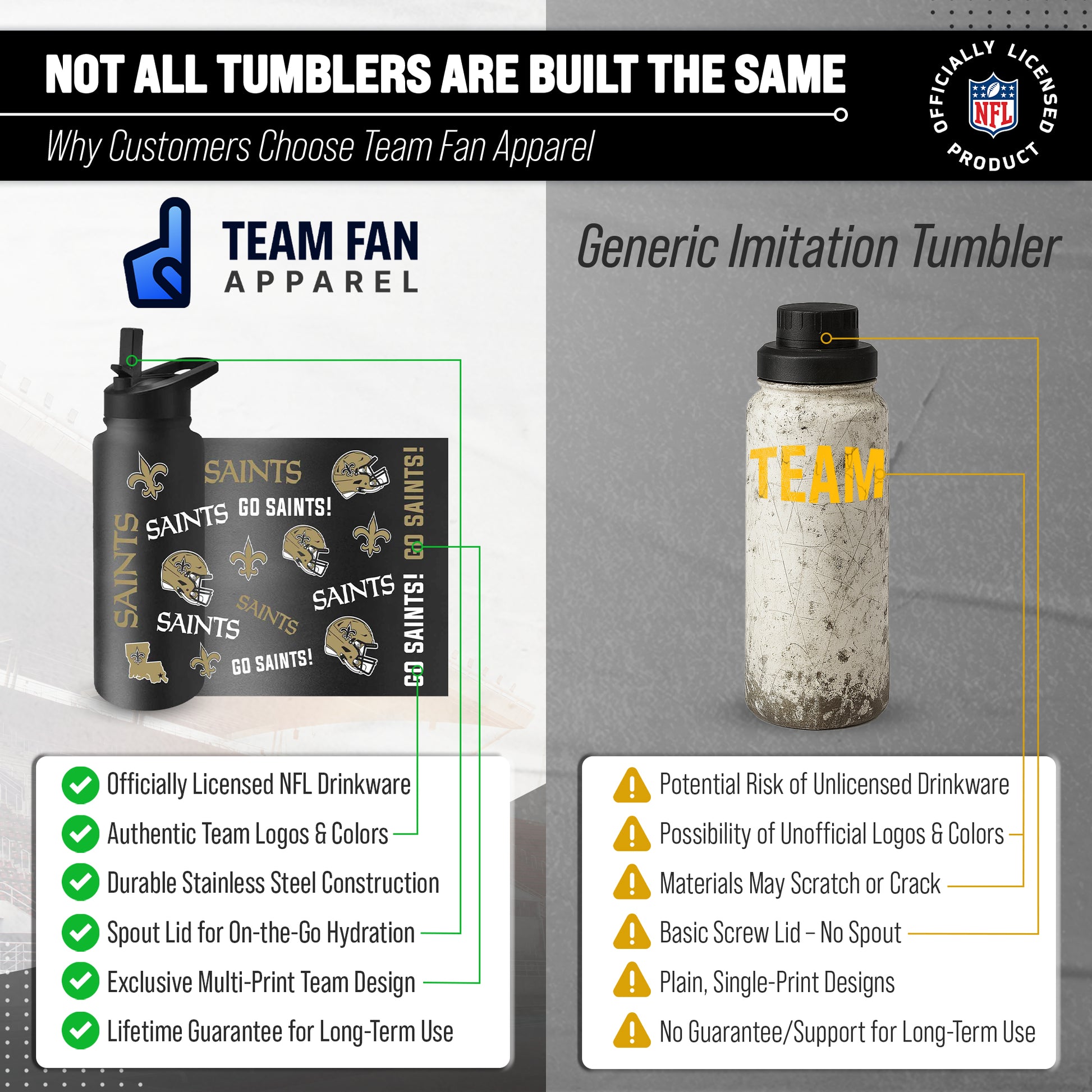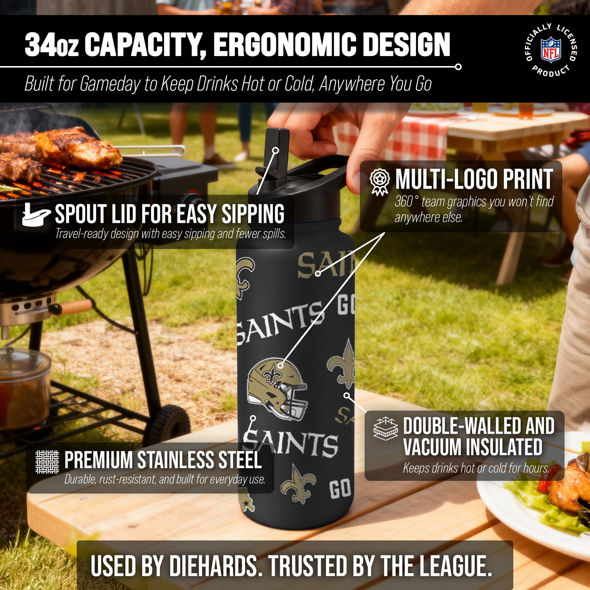 Keep Your New Orleans Saints Team Spirit and Drinks Handy On-the-Go with the NFL Native Quencher Water Bottle! Whether you're heading to the gym or tailgating at the game, this 34oz Saints water bottle is the perfect companion for any fan. Made from durable stainless steel, it's designed to keep your drinks hot or cold for hours. The no-leak dual option lid allows you to sip through a straw or drink straight from the spout. But it's not just for water! This versatile bottle can also hold your favorite coffee, tea, & more. With its insulated design, your beverages will stay at their desired temperature until you're ready for them. Featuring your team's logo & colors, this water bottle proudly displays your loyalty while keeping you hydrated. And when it's time for a refill, simply take off the lid and fill up again. Cheers to staying hydrated in style with the New Orleans Saints Water Bottle! Hand wash only! Great for yourself or any fan in your life, especially for on-the-go and travel!