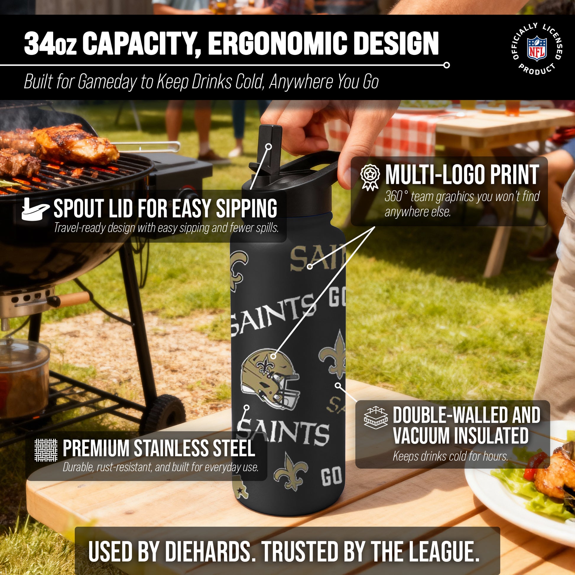 Keep Your New Orleans Saints Team Spirit and Drinks Handy On-the-Go with the NFL Native Quencher Water Bottle! Whether you're heading to the gym or tailgating at the game, this 34oz Saints water bottle is the perfect companion for any fan. Made from durable stainless steel, it's designed to keep your drinks cold for hours. The no-leak dual option lid allows you to sip through a straw or drink straight from the spout. But it's not just for water! This versatile bottle can also hold your favorite iced coffee, tea, & more. With its insulated design, your beverages will stay at their desired temperature until you're ready for them. Featuring your team's logo & colors, this water bottle proudly displays your loyalty while keeping you hydrated. And when it's time for a refill, simply take off the lid and fill up again. Cheers to staying hydrated in style with the New Orleans Saints Water Bottle! Hand wash only! Great for yourself or any fan in your life, especially for on-the-go and travel!