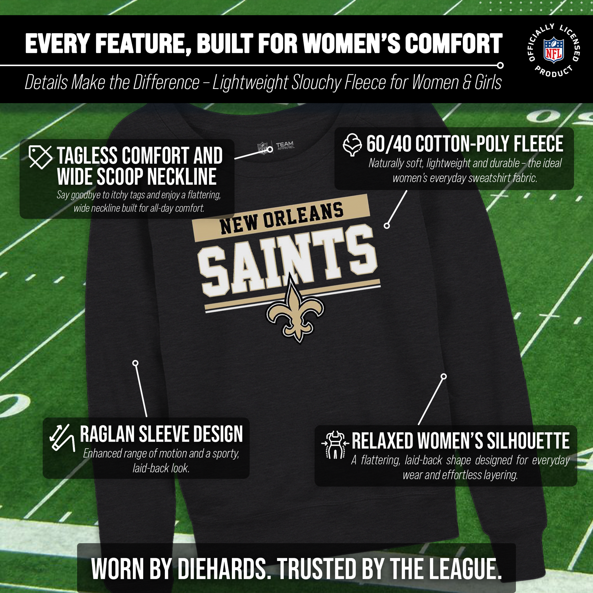 Our officially licensed womens New Orleans Saints long sleeve charcoal crew neck pullover is super comfortable, has an oversized fit, and is great for showing off your New Orleans pride. The high-quality thermal printed logo and wordmark will look fresh after years of wear, making it a great alternative to wearing a New Orleans Saints womens jersey. Our womens long sleeve slouchy crewneck has a relaxed fit for a casual, comfortable look. The long sleeve New Orleans crew will look great with shorts at tailgates in warmer months, or with jeans or leggings when it gets cooler. Layer it with a hoodie or even a New Orleans football jersey when the weather gets cold. Available in plus sizes up to 3XL, this is a New Orleans Saints pullover that women who are plus size or straight size will feel comfortable in. If you're looking to give the gift of ladies New Orleans apparel, our long sleeved New Orleans Saints Slouchy Crew is the perfect gift. Officially licensed to ensure no counterfeit designs or colors, these New Orleans crews for women are perfect for super fans. Made from a cotton poly blend to keep you comfortable, the womens raglan long sleeve Gameday Slouchy Crew will definitely become one of your favorite pieces of New Orleans Saints apparel.