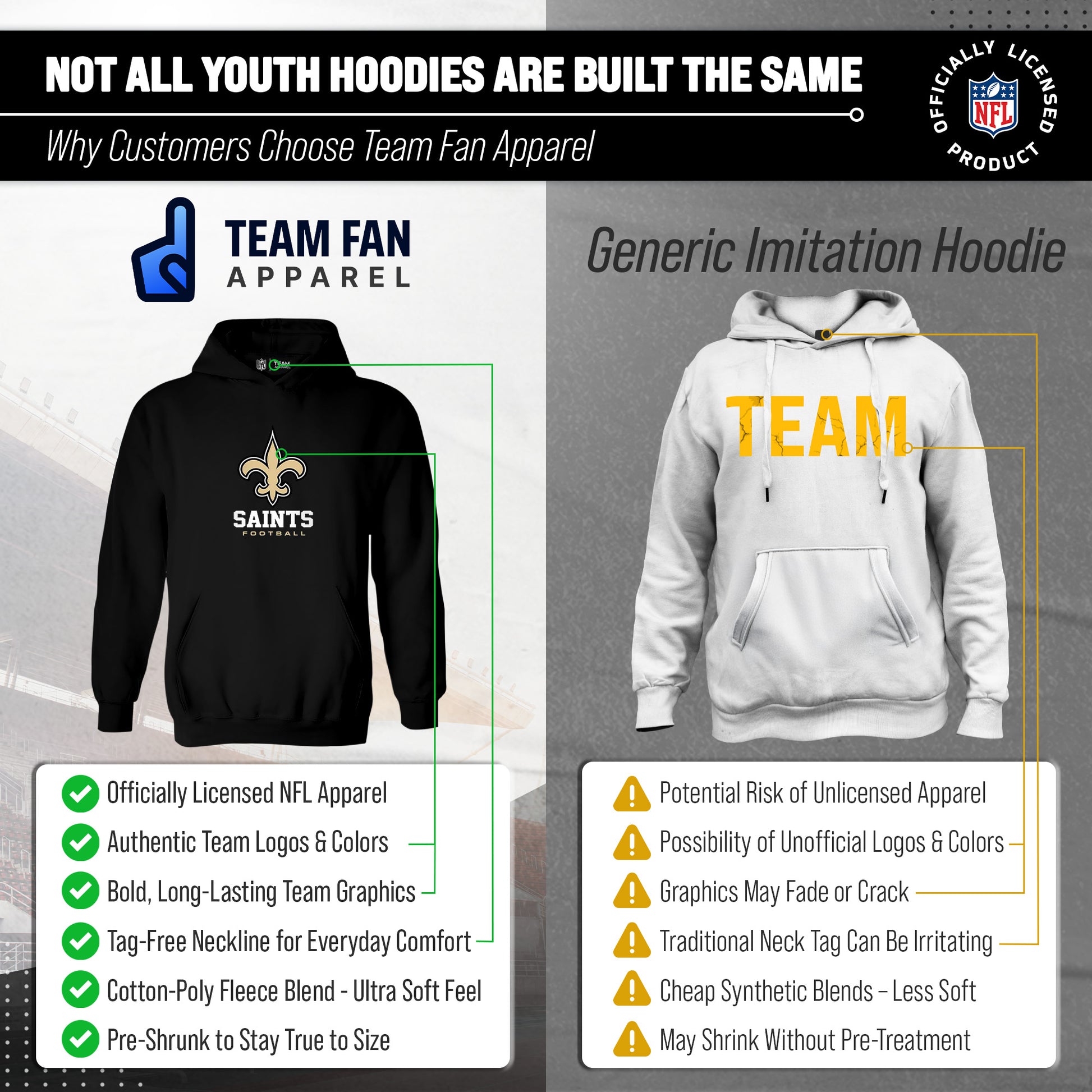 Score with Team Fan Apparel, the ultimate destination for officially licensed NFL apparel for all whether with youth or adult we got you covered. We use only the highest-quality screen printing techniques to bring you the most comfortable, durable, and stylish clothing possible. Go ahead and show your team pride at the big game or any time! This premium youth hooded sweatshirt comes in small, medium, large, XL. So needless to say, it fits young New Orleans Saints fans of all types! Maybe you aren't a Saints fan but you know someone who is? Don't worry! This high-quality hoodie is soft, lightweight, breathable, and a GREAT gift for any birthday or Christmas gift! So, if you want your young fan to feel bold and proud at the next big game or tailgate, you're going to want to be getting your hands on our New Orleans Saints Youth Big Logo Hooded Sweatshirt today!