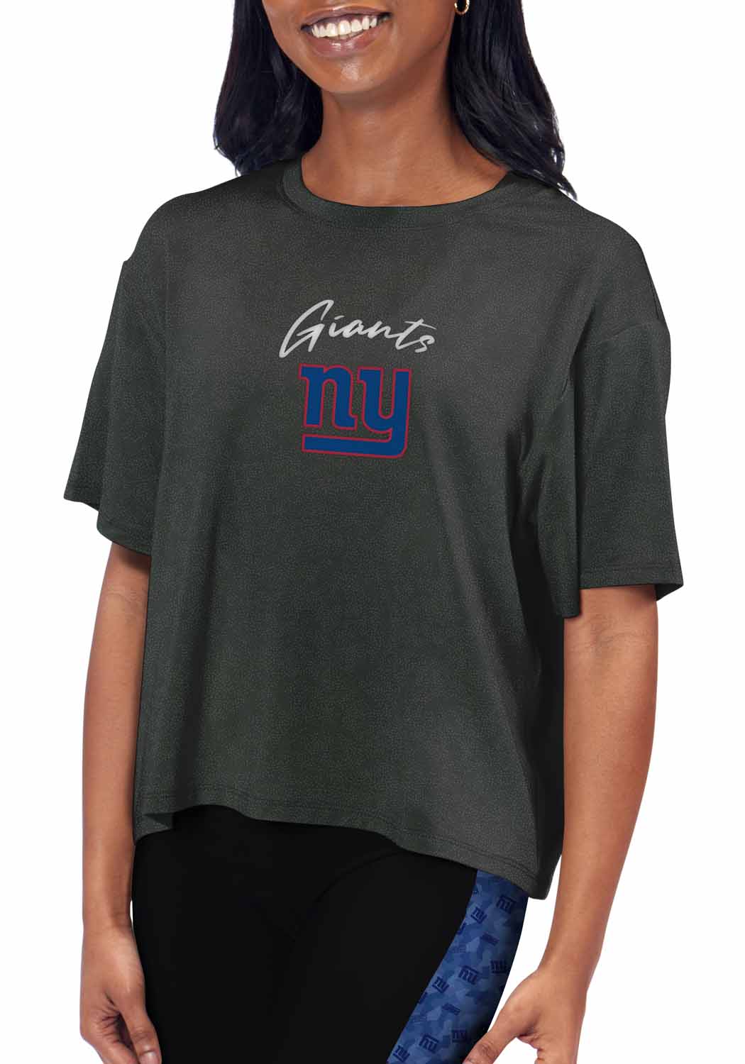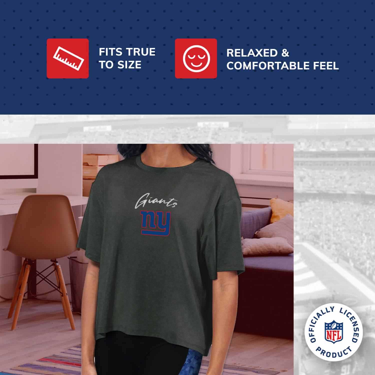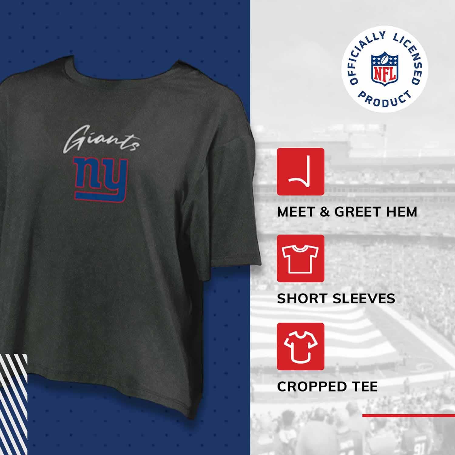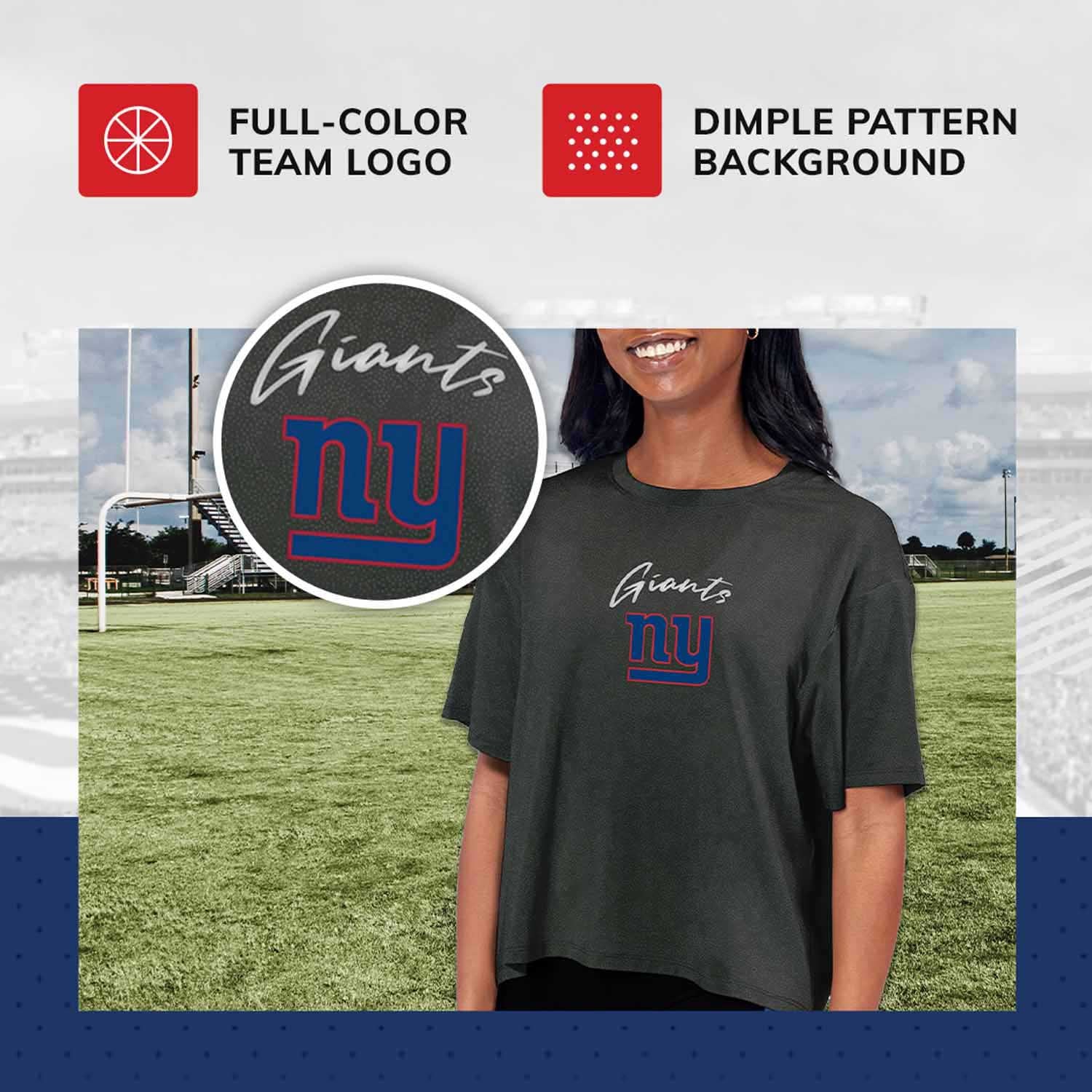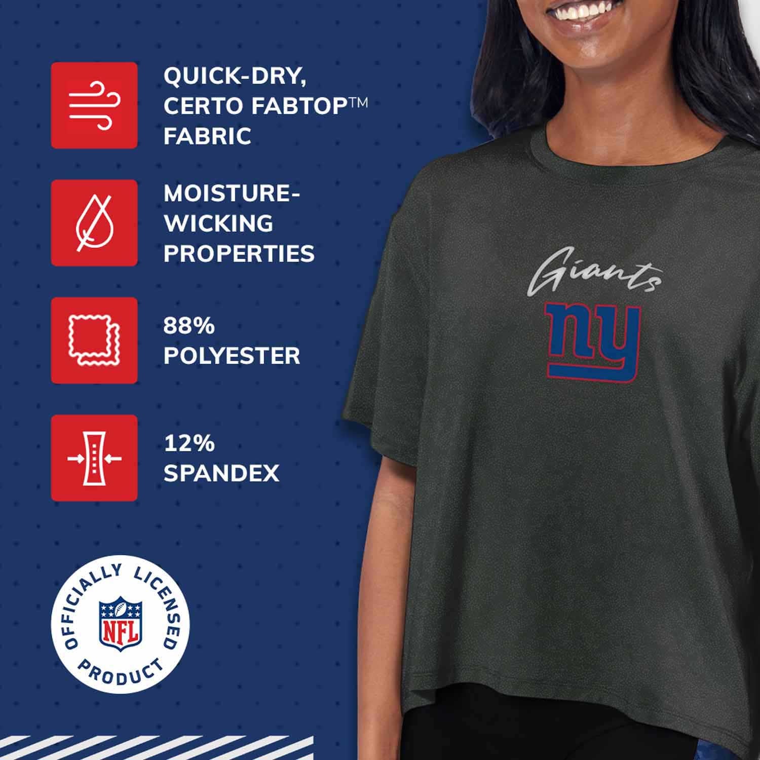 This short-sleeved cropped Giants t-shirt will become the new favorite addition to your wardrobe! Made with CERTO Fabtop™️ polyester and spandex fabric, this comfortable Giants shirt has moisture-wicking properties that keep you comfortable and dry. This New York Giants tshirt was designed in Los Angles, California, with comfort in mind. This relaxed tee features a "meet and greet" hem to hit at the waist for a flattering look. Pair it with jeans or leggings to elevate your style, all while showcasing your favorite team. The front of the shirt displays a full-color Giants logo against a dimple-pattern background. If you are looking for the perfect Giants women shirts or Giants clothing apparel for women, look no further than this New York Giants shirt. This shirt makes the perfect gift for any New York Giants fan. Pair it with your favorite Giants merchandise on game day.