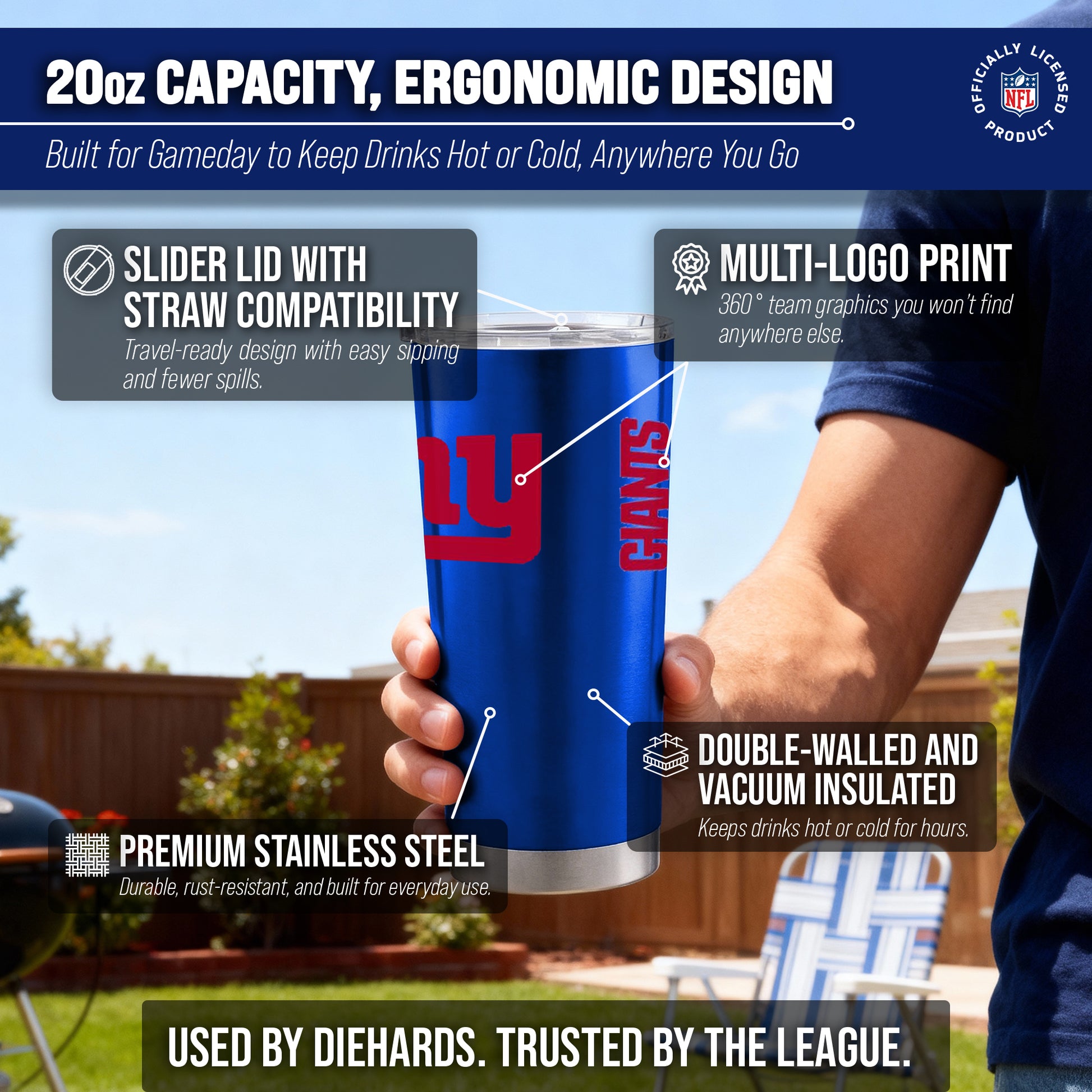Get ready to cheer on the New York Giants with the NFL 20oz Gameday Stainless Steel Tumbler!  This versatile Giants tumbler is perfect for both hot and cold drinks, making it a must-have for game days, road trips, or just everyday use. The sleek stainless steel design features your team's logo, making it a great gift for any New York Giants fan - men and women alike! With a slider lid and slightly tapered silhouette, you can easily sip on your coffee, water or cocktails while showing off your New York Giants team spirit.  But this tumbler isn't just stylish - it's also functional. The insulated design keeps your drinks at the perfect temperature, whether you're tailgating in the chilly fall weather or enjoying a refreshing drink in the summer sun. And with a generous capacity of 20oz, you'll have plenty to share with friends and family.  So grab your NFL 20oz Gameday Stainless Steel New York Giants Tumbler and show off your love for the game wherever you go!