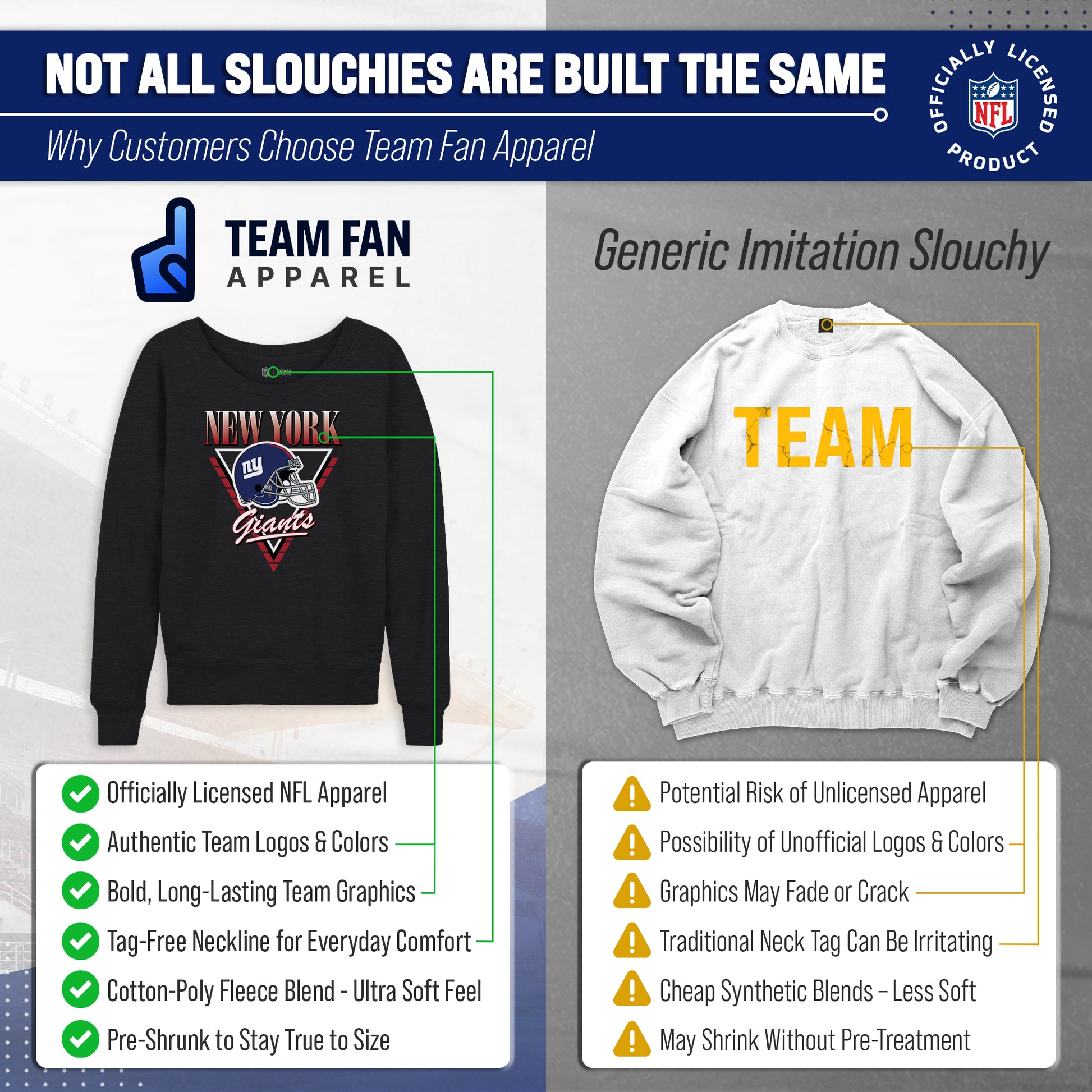 Hey there, fellow lady football fans! Show off your team pride in style with our Team Fan Apparel New York Giants NFL Women's Retro Triangle Slouchy Crewneck Fleece Pullover. Made with extra soft cotton polyester fleece material, this long sleeve pullover sweatshirt will keep you warm and cozy on game day or any chilly day. With a tagless design, you won't have to worry about any annoying tags distracting you from cheering on your team. Featuring a retro triangle design and relaxed fit, this pullover adds a touch of fashion to your game day wardrobe. Available in a range of women's sizes, it's the perfect addition to any fan's closet. Whether you're headed to the stadium or watching from home, stay cool and stylish with this must-have piece of Giants apparel. Don't let snow or cold weather dampen your team spirit - grab one for yourself or as a gift for the ultimate football-loving lady in your life! Go Giants!