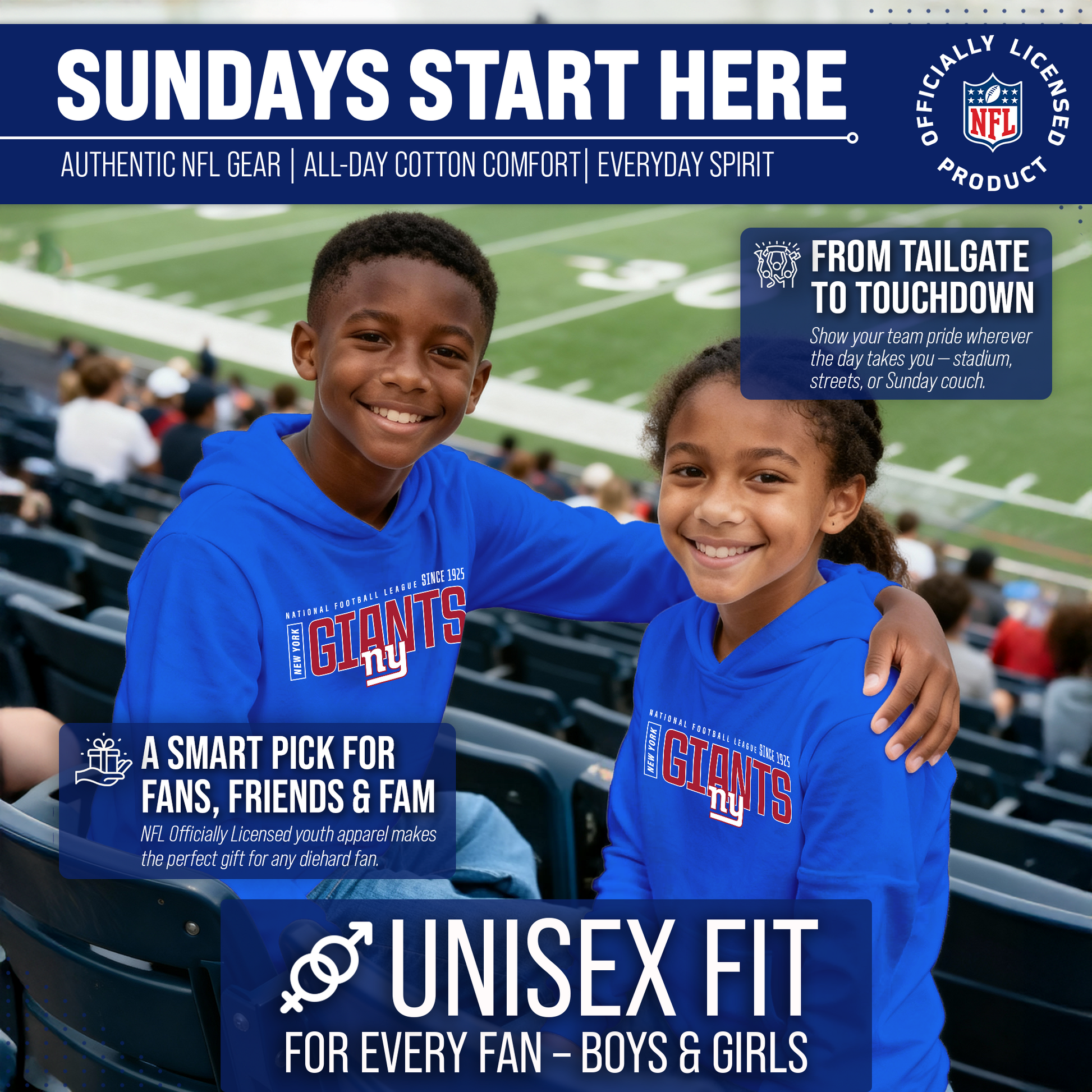 Hey there, young sports fans! Get ready to show off your team spirit with the Team Fan Apparel New York Giants Youth Modern Endzone Football Fleece Hooded Sweatshirt! Made from a soft and cozy cotton polyester fleece, this sweatshirt is perfect for staying warm on game day or any day. The unisex design makes it suitable for both boys and girls, and its tag-less feature ensures ultimate comfort all day long. Featuring an original modern endzone design that proudly displays your team's colors and logos, this youth hoodie will be turning heads everywhere it's worn. The front pouch pocket and fleece hood will keep you warm on those cold game days as you cheer on your Giants! Just pull it on and go! So whether you're at the stadium or hanging out with friends, make sure you're representing your team in style with our NFL youth apparel. Printed and designed in the USA, have confidence your sweatshirt will last! Order now and get your future pro geared up to be the next super fan!