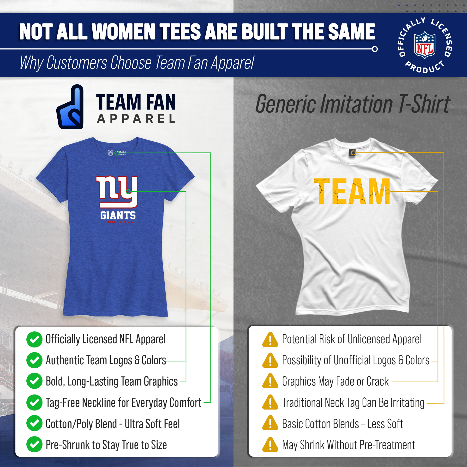Score with Team Fan Apparel, the ultimate destination for officially licensed NFL apparel for men and women. We use only the highest-quality screen printing techniques to bring you the most comfortable, durable, and stylish clothing possible. Go ahead and show your team pride at the big game or any time! This premium womens t-shirt comes in small, medium, large, XL, and XXL. So needless to say, it fits New York Giants fans of all types! Maybe you aren't a Giants fan but you know someone who is? Don't worry! This high-quality t-shirt is soft, lightweight, breathable, and a GREAT gift for any birthday, anniversary, Mother's day, Valentine's day, or Christmas gift! So, if you want to stand out as the #1 female fan at the next big game or watch party, you're going to want to be wearing one of these New York Giants Women's Big Logo t-shirts.