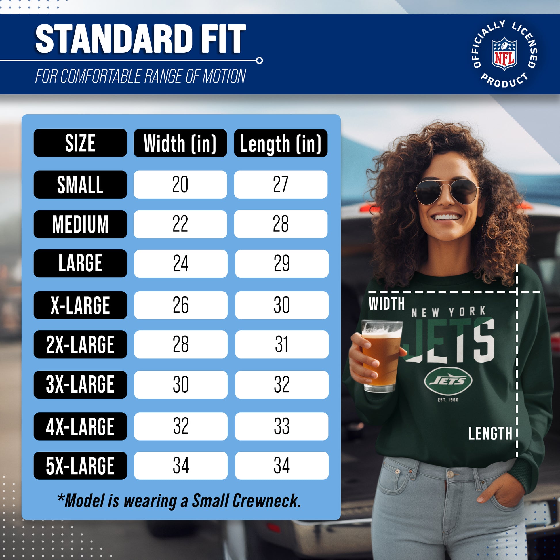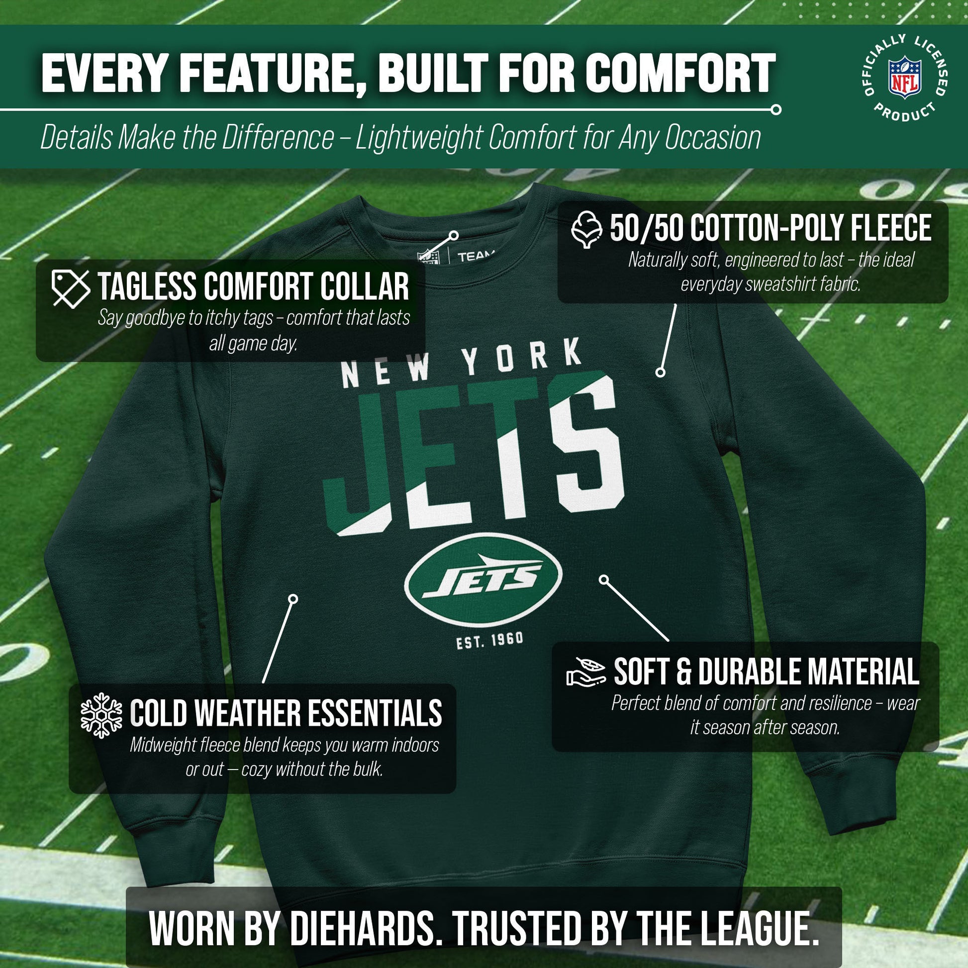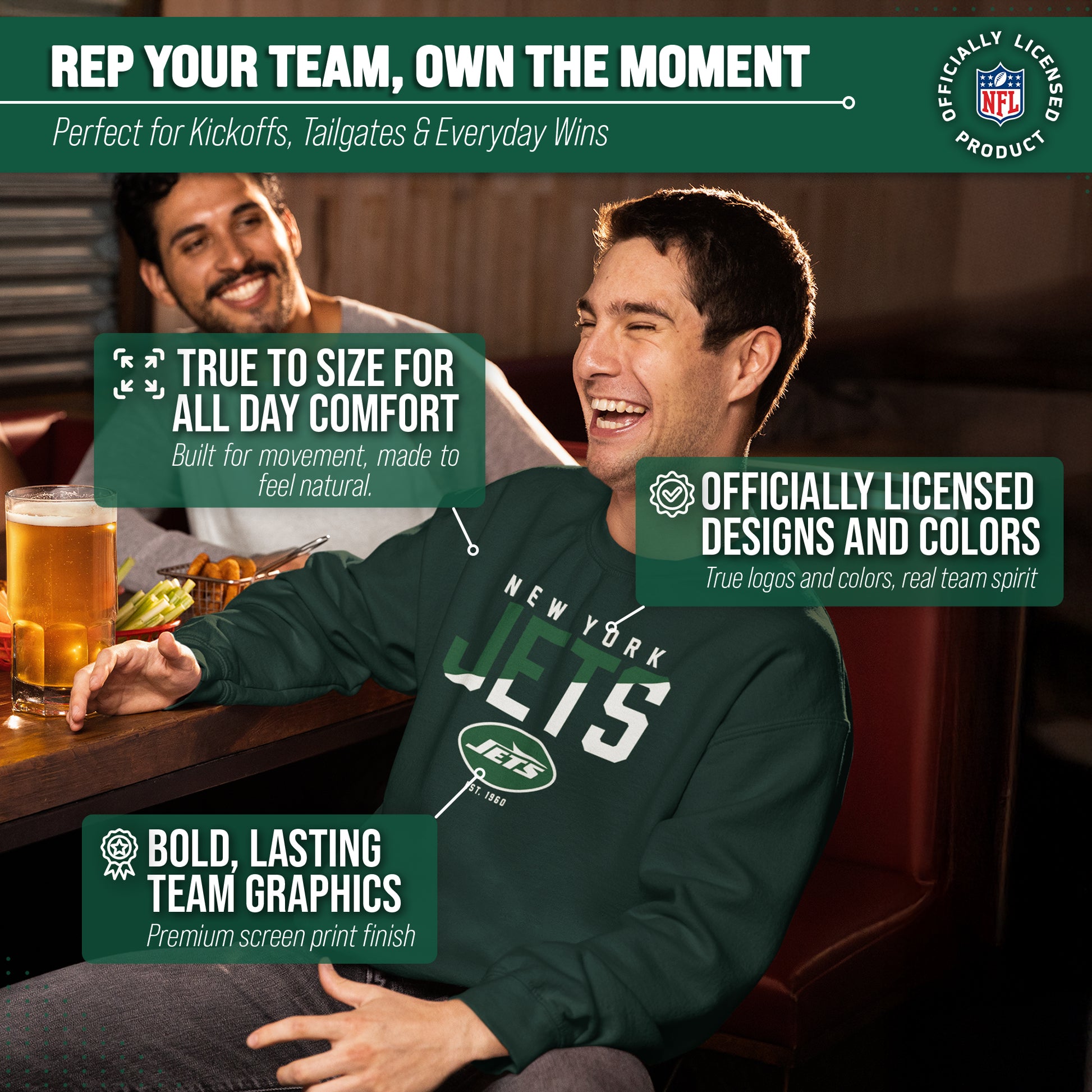 Score with Team Fan Apparel, the ultimate destination for officially licensed NFL apparel for men and women. We use only the highest quality screen printing techniques to bring you the most comfortable, durable, and stylish clothing possible. Go ahead and show your team pride at the big game or any time! This premium crewneck fits both male and female adults and comes in small, medium, large, XL, and XXL. So needless to say, it fits New York Jets fans of all types! Maybe you aren't a Jets fan but you know someone who is? Don't worry! This high-quality crewneck is soft, lightweight, breathable and a GREAT gift for any birthday, anniversary, Father's Day, Mother's day, you name it! So, if you want to stand out as the #1 fan at the next big game or watch party, you're going to want to be wearing one of these great football crews.