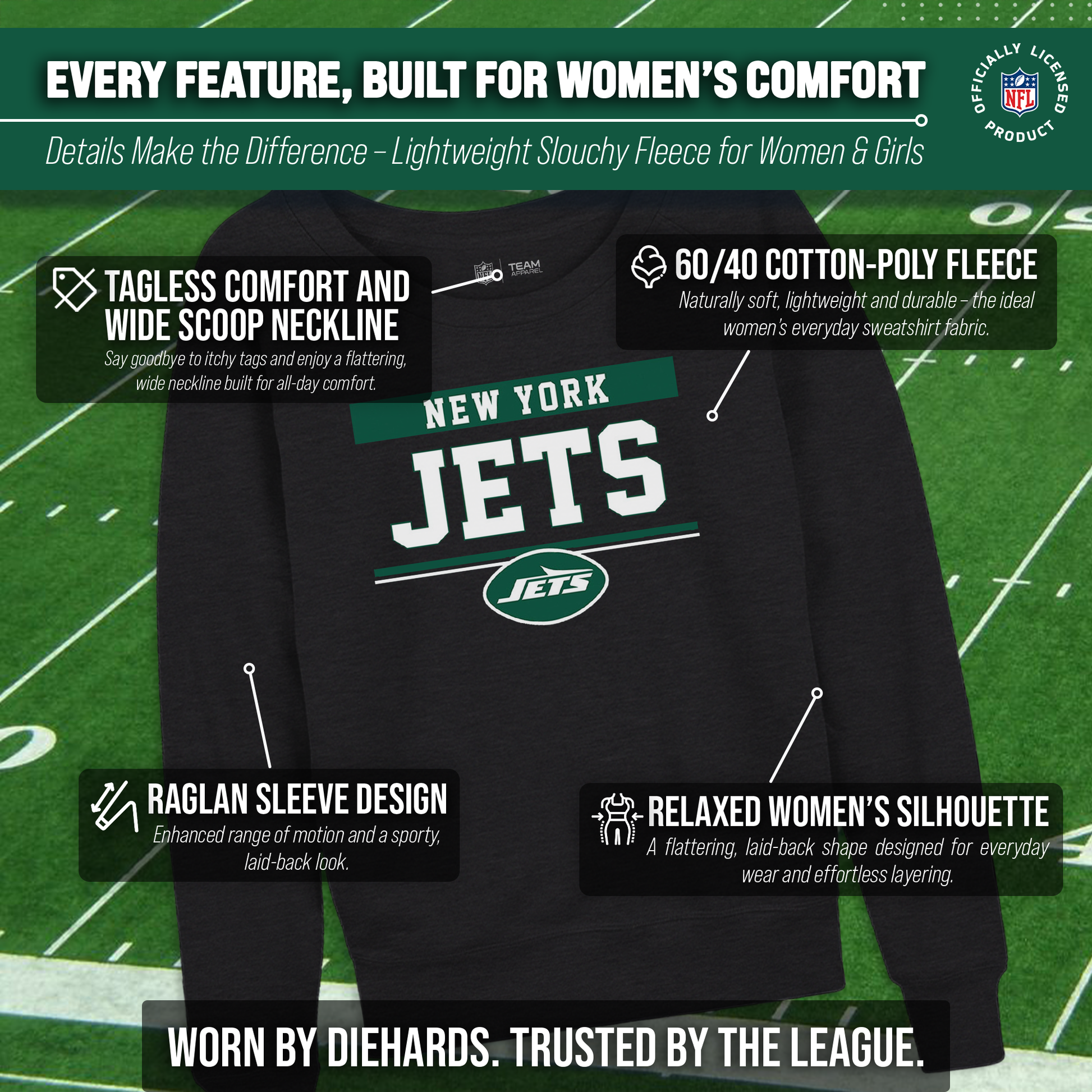 Our officially licensed womens New York Jets long sleeve charcoal crew neck pullover is super comfortable, has an oversized fit, and is great for showing off your New York pride. The high-quality thermal printed logo and wordmark will look fresh after years of wear, making it a great alternative to wearing a New York Jets womens jersey. Our womens long sleeve slouchy crewneck has a relaxed fit for a casual, comfortable look. The long sleeve New York crew will look great with shorts at tailgates in warmer months, or with jeans or leggings when it gets cooler. Layer it with a hoodie or even a New York football jersey when the weather gets cold. Available in plus sizes up to 3XL, this is a New York Jets pullover that women who are plus size or straight size will feel comfortable in. If you're looking to give the gift of ladies New York apparel, our long sleeved New York Jets Slouchy Crew is the perfect gift. Officially licensed to ensure no counterfeit designs or colors, these New York crews for women are perfect for super fans. Made from a cotton poly blend to keep you comfortable, the womens raglan long sleeve Gameday Slouchy Crew will definitely become one of your favorite pieces of New York Jets apparel.