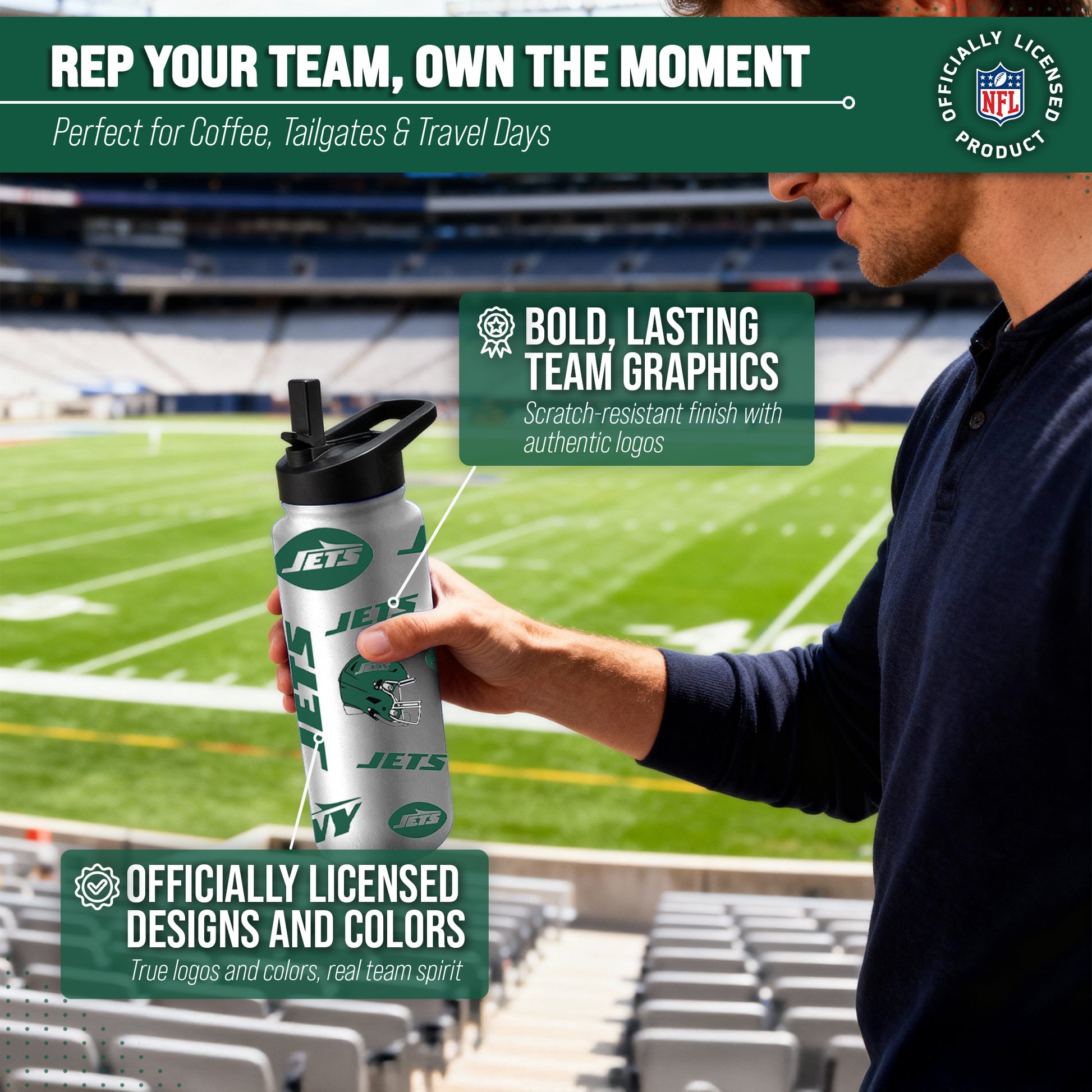 Keep Your New York Jets Team Spirit and Drinks Handy On-the-Go with the NFL Native Quencher Water Bottle! Whether you're heading to the gym or tailgating at the game, this 34oz Jets water bottle is the perfect companion for any fan. Made from durable stainless steel, it's designed to keep your drinks hot or cold for hours. The no-leak dual option lid allows you to sip through a straw or drink straight from the spout. But it's not just for water! This versatile bottle can also hold your favorite coffee, tea, & more. With its insulated design, your beverages will stay at their desired temperature until you're ready for them. Featuring your team's logo & colors, this water bottle proudly displays your loyalty while keeping you hydrated. And when it's time for a refill, simply take off the lid and fill up again. Cheers to staying hydrated in style with the New York Jets Water Bottle! Hand wash only! Great for yourself or any fan in your life, especially for on-the-go and travel!