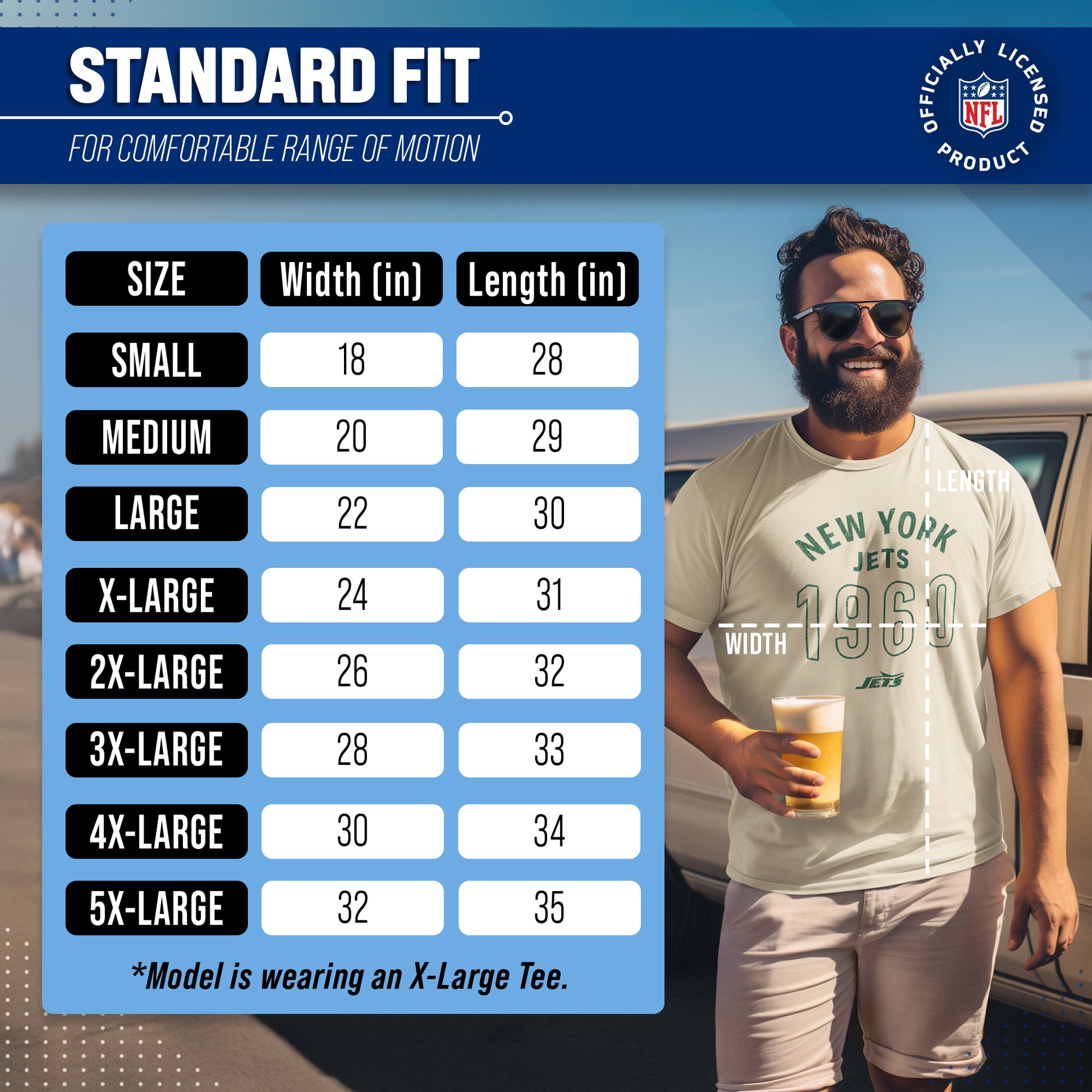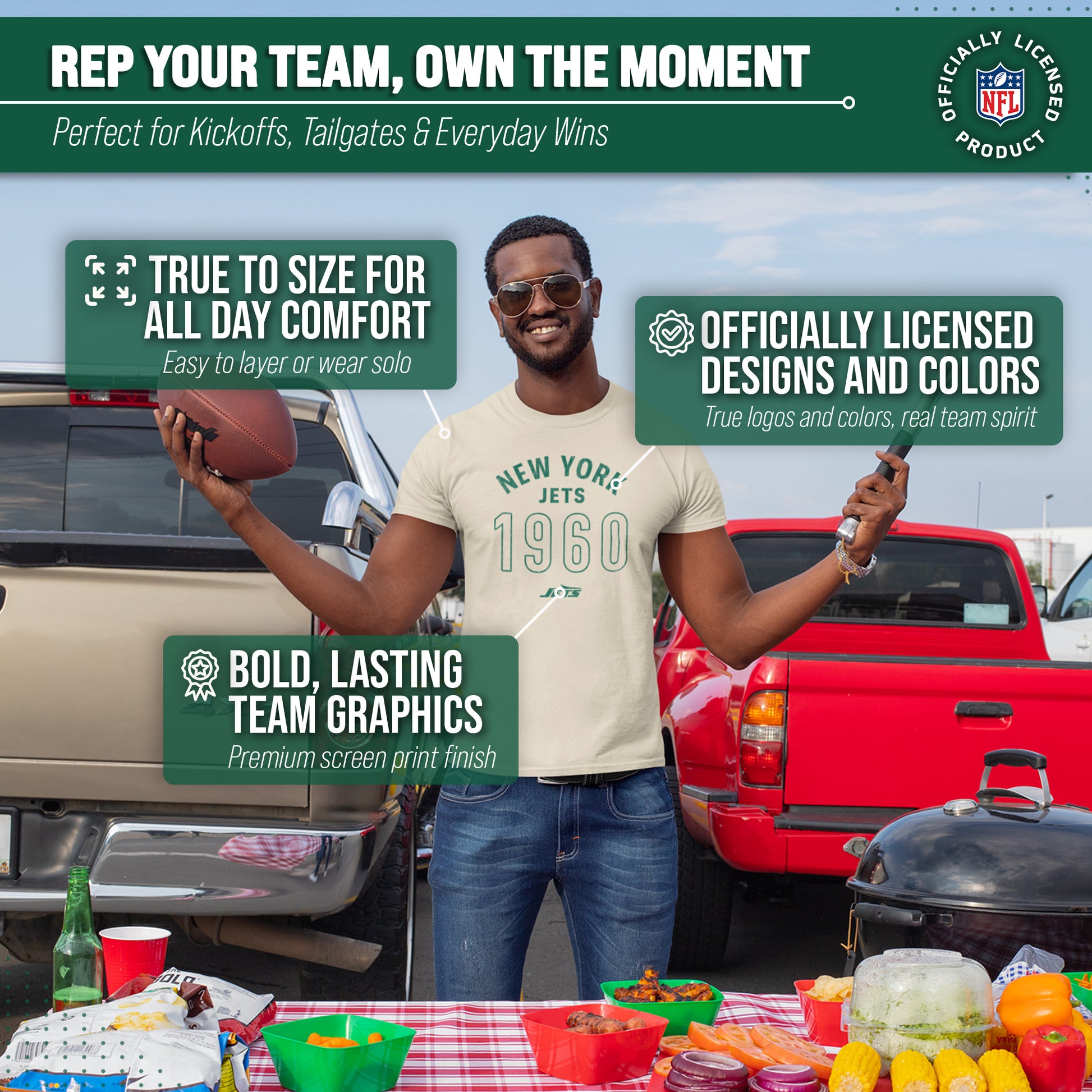 Show off your team spirit in style with our Team Fan Apparel New York Jets NFL Big Date Tag-Less T-Shirt! Made for both men and women, this unisex t-shirt is the perfect addition to any football fan's wardrobe. With its soft and comfortable cotton blend fabric, you'll love wearing it to games or just lounging at home. The tag-less design ensures maximum comfort without any annoying tags scratching at your neck. Featuring the year your favorite team was established in a large centered font along with the official team logo, this shirt will make you stand out from the crowd and show off your die-hard fandom. It comes in multiple sizes, so you can choose the one that fits best & represents your team spirit. Whether you're cheering on your Jets at the stadium or watching from home, our NFL Big Date Tag-Less T-Shirt is a must-have for all fans! So grab yours today and support your team in comfort and style. Go team!